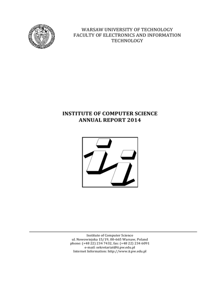 WARSAW UNIVERSITY OF TECHNOLOGY FACULTY OF ELECTRONICS AND INFORMATION TECHNOLOGY INSTITUTE OF COMPUTER SCIENCE ANNUAL REPORT 2014 Institute of Computer Science ul. Nowowiejska 15/19, 00-665 Warsaw, Poland phone: (+48 22) 234 7432, fax: (+48 22) 234 6091 e-mail: [email protected] Internet Information: http://www.ii.pw.edu.pl From the Director The Institute of Computer Science is one of the very few academic institutions in Poland with the longest tradition in computer research & development, as well as in education. The history of the Institute goes back to the year 1953 when the Division of Communications and Radio Equipment was established at the Faculty of Communications (was so called then). In 1960, the Division has designed and built one of the first industrially produced electronic computers in Poland, called UMC1. Teaching in the field of computing and computers has started early in 60's, so that the first few M.Sc. degrees in Computer Science were granted in 1962. From then on, the regular curricula in the field have been proposed. The main activities of the Institute of Computer Science concentrate around teaching of undergraduate and graduate computer science students, as well as, doing research in the field of computer science. The Institute’s main areas for both, i.e. the teaching and research activities, concentrate around computer graphics, information systems, data and text mining, artificial intelligence, computer systems’ architectures, dependable computing and software engineering. This Annual Report summarizes both types of the activities of the Institute in the academic year 2013/2014. Now, each year some 80 students receive their BSc degrees and about 80 students are awarded with MSc degrees. Additionally, we are proud of our PhD students. In 2014, five PhD students have completed their theses and have been awarded with PhD degrees, one with honours. The last year was for the Institute very successful in all the fields of our activities. One of our professors was nominated by the President of Poland with the scientific title of State Professor. A particular significance should be given to the new investments in our infrastructure. The server room reconstruction has been completed and the new equipment has been installed. Additionally, the Faculty project FOTEH has been successfully completed and the new computational laboratory has started working. In the research area, in 2014 we have been working on 17 projects. In particular, we have been ending our very successful work on the strategic project SYNAT, which is devoted to building infrastructure for scientific research community. We have continued implementing the research results of the project at the level of Warsaw University of Technology in the form of University Knowledge Base, which is now in regular use by all the faculties of the University. We also continued cooperation with industry, being involved in 8 projects for our industrial partners. Our co-operation with industry involves not only the Institute’s academic staff but also our PhD and MSc students, who participate in the research projects. In November we have hosted Professor Evangelos Milios from Dalhousie University, Canada, who presented a series of lectures on visual text analytics for the University staff and PhD students. In May and September we have also hosted Professor Janusz Zalewski from Dept. of Software Engineering Florida Gulf Coast University. The outcome of the research run by the Institute staff is well reflected in our publication record. In 2014 our staff have authored and co-authored 128 publications, (seven co-edited books, and 116 papers in international scientific journals, and conference proceedings, as well as chapters in the books). Additionally, 5 Institute’s reports have been issued. Our staff have been involved in organizing international conferences WI-IAT 2014 and JRS 2014. In addition the Institute was involved in organizing at WI-IAT a special session devoted to SYNAT. The research achievements of the Institute’s staff are well recognized in the academic community. Our colleagues are invited to the programme and organizing committees of international conferences. They are also often invited for reviewing papers for renowned international journals. It is my pleasure to express my appreciation to the Institute’s staff for their efforts and contributions in the Institute’s achievements in teaching and research. Warsaw, January 2015 Henryk Rybiński CONTENTS 1 GENERAL INFORMATION ........................................................................................................................ 5 1.1 Mission of the Institute ........................................................................................................................ 5 1.2 Noteworthy events in '14 ..................................................................................................................... 5 1.3 Board of Directors ................................................................................................................................ 8 1.4 Organisation of the Institute ................................................................................................................ 9 1.4.1 Division of Computer Graphics .................................................................................................. 9 1.4.2 Division of Information Systems .............................................................................................. 10 1.4.3 Division of Computer Architectures and Software Engineering ............................................ 11 1.4.4 Computer Laboratory ............................................................................................................... 12 2 STAFF ........................................................................................................................................................ 14 2.1 Senior academic staff .........