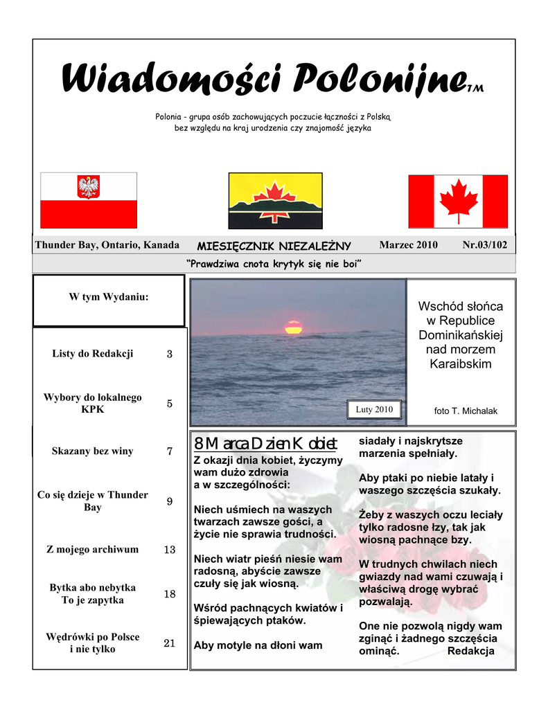 Wiadomosci Polonijne TM Polonia - grupa osób zachowujących poczucie łączności z Polską bez względu na kraj urodzenia czy znajomość języka Thunder Bay, Ontario, Kanada MIESIĘCZNIK NIEZALEŻNY Marzec 2010 Nr.03/102 “Prawdziwa cnota krytyk się nie boi” W tym Wydaniu: Listy do Redakcji 3 Wybory do lokalnego KPK 5 Skazany bez winy 7 Co się dzieje w Thunder Bay 9 Z mojego archiwum 13 Bytka abo nebytka To je zapytka Wędrówki po Polsce i nie tylko 18 Wschód słońca w Republice Dominikańskiej nad morzem Karaibskim Luty 2010 8 Marca Dzien Kobiet Z okazji dnia kobiet, życzymy wam dużo zdrowia a w szczególności: Niech uśmiech na waszych twarzach zawsze gości, a życie nie sprawia trudności. Niech wiatr pieśń niesie wam radosną, abyście zawsze czuły się jak wiosną. Wśród pachnących kwiatów i śpiewających ptaków. 21 Aby motyle na dłoni wam foto T. Michalak siadały i najskrytsze marzenia spełniały. Aby ptaki po niebie latały i waszego szczęścia szukały. Żeby z waszych oczu leciały tylko radosne łzy, tak jak wiosną pachnące bzy. W trudnych chwilach niech gwiazdy nad wami czuwają i właściwą drogę wybrać pozwalają. One nie pozwolą nigdy wam zginąć i żadnego szczęścia ominąć. Redakcja 2 Wiadomości Polonijne Redaguje Zespół: Lucy Michalak Tadeusz Michalak Agnieszka Reszkowska-Kania Robert Kania Korespondenci: Joanna Adamik Agnieszka Buda - Rodriguez Ilona Girzewska Bohdan Ejbich Kazimierz Niechwiadowicz Aleksander Siwiak Waldi Opracowanie: Lucy Michalak Wzory reklam zaprojektowanych przez “Wiadomości Polonijne” są własnością wydawnictwa. Kopiowanie i ich publikowanie bez zgody redakcji jest nielegalne. Redakcja “ Wiadomości Polonijnych” zaprasza wszystkich Czytelników do przysyłania własnej twórczości. Mogą to być zarówno wiersze jak i proza. Termin nadsyłania materiałów do gazety upływa 15-go każdego miesiąca. Redakcja zastrzega sobie prawo skracania i edycji nadesłanych tekstów. Księga Imion Ada to kobieta z klasą, budząca sympatię, obiektywna, pewna siebie, o silnej woli. Ada to wierna przyjaciółka zarówno dla kobiet jak i mężczyzn. Jest to kobieta wybuchowa, lubiąca odmawiać, sprzeczać się a także upierać. Ada dobrze sobie radzi w interesach i na stanowiskach przywódczych. Często jest artystką a szczególnie malarką lub rzeźbiarką. Ada nie oszczędza zdrowia, źle się odżywia, mało śpi oraz przepracowuje się. Ada to osoba pragnąca żyć pełnią życia. Jest ona wyśmienitą panią domu i bardzo kocha rodzinę. Wyrażone w tekstach opinie należą do autorów i nie zawsze odzwierciedlają stanowisko redakcji. Za treść ogłoszeń i reklam redakcja nie ponosi odpowiedzialności. Wiadomości Polonijne są pismem całkowicie bezpłatnym. Wszelkie koszty związane z drukiem są pokrywane z dotacji. Każda pomoc finansowa jest mile widziana. Wszelkiego rodzaju ogłoszenia i życzenia do “Wiadomości Polonijych” przyjmuje Lucy Michalak tel. 767-4200 Wydawca: Wiadomości Polonijne 236 Masters Street. Thunder Bay, Ont. P7B 6L5 e-mail: [email protected] Marzec 2010 Ludzie, którym lepiej się nie odszczekiwać: 1. Nauczyciel, 2. Sierżant w wojsku. 3. Policjant, 4. Własna mama. Życie jest jak pudełko czekoladek, nigdy nie wiesz co dostaniesz. Jeśli nie potrafisz śpiewać ładnie, śpiewaj głośno Zawsze bądź dobry dla mamy. Kalendarz świąteczny na 2010 rok http://artspolonia.enginesource.org http://www.polishwinnipeg.com/ Downloads/IndexThunderBay.htm Potrzebujemy pomocy w redagowaniu gazetki, a szczególnie w opracowywaniu przy komputerze. Jeśli masz czas i chęć zgłoś się do redakcji. Przysłowie miesiąca W marcu, gdy są grzmoty, urośnie zboże ponad płoty Pozostałe święta ruchome Niedziela Palmowa -7 dni przed Wielkanocą —Wielki Czwartek - 3 dni przed Wielkanocą Wielki Piątek -2 dni przed Wielkanocą Wielka Sobota -dzień przed Wielkanocą Wielkanoc PARAFIA MATKI BOŻEJ KRÓLOWEJ POLSKI 93 N. Algoma Str Thunder Bay, Ont Tel 344-1066 Proboszcz ks. Ireneusz Stadler Msze Św. wtorek-piątek 7:00 p.m., soboty 5:00 p.m. niedziele 9:00 (po angielsku) & 10:30 a.m. (po polsku) http://stmary50.blogspot.com 28.03.2010 - Niedziela Palmowa Rozpoczyna tydzień, który nazywamy Wielkim. Początków procesji z palmami należy szukać w Jerozolimie. W niedzielę po południu wierni gromadzili się na Górze Oliwnej, gdzie śpiewano hymny i czytano Pismo św. Po Ewangelii, po wjeździe Chrystusa do Jerozolimy, ruszała procesja do miasta. Dzieci, nawet te najmniejsze, trzymały w ręku gałązki palmowe lub oliwne. Procesja z palmami przyjęła się w całym Kościele. Podczas mszy św. czytany jest dziś opis męki Chrystusa. Po słowach "i oddał ducha" przerywa się czytanie oraz wszyscy pozostają jakiś czas w milczeniu. PARAFIA ŚW. KAZIMIERZA 613 McKenzie Str Thunder Bay, Ont Tel 623-3916 Proboszcz o. Andrzej Deptuła Msze Św. poniedziałek-piątek 8:00 a.m. ( eng/pol.) soboty 5:00 p.m (english) niedziela 9:00a.m.(english) & 10:30 a.m.(polish) Marzec 2010 Wiadomości Polonijne Szanowny Panie Redaktorze! Bardzo dziękuję za udostępnienie mi "Wiadomości Polonijnych" z Thunder Bay, miasta, w którym nigdy nie byłam. Miło mi donieść, że obydwa wydania przeczytałam z zainteresowaniem i prawdziwą przyjemnością. Gratuluje ciekawego, doskonale zredagowanego pisma. Będąc od wielu lat związaną z polonijną prasą, mam pojęcie jak wygląda praca "na zapleczu", czyli dobór materiału, tak ażeby trafił do każdego czytelnika. "Dla każdego - coś dobrego" jest hasłem oklepanym, łatwo się je wymawia, ale zebrać, wybrać i ciekawie opracować mnogość materiału, wcale nie jest łatwo. A jednak treść "Wiadomości" jest eklektyczna, ciekawa i interesująca. Brawo! Życzę dalszego powodzenia. Wielu owocnych lat na polonijnej niwie. I, oczywiście, wielu nowych, zadowolonych czytelników. Ślę pozdrowienia dla Pana osobiście i reszty zespołu Nin