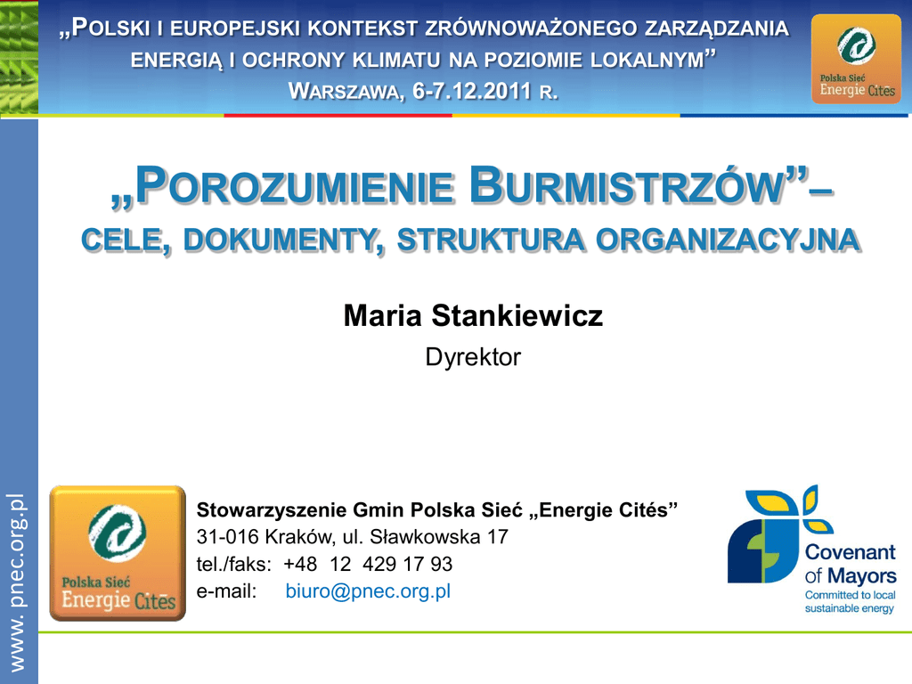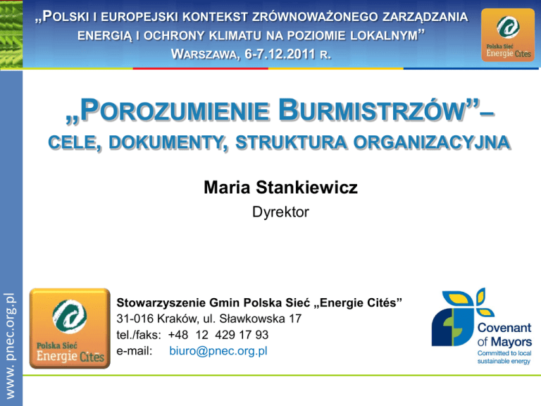 „POLSKI I EUROPEJSKI KONTEKST ZRÓWNOWAŻONEGO ZARZĄDZANIA ENERGIĄ I OCHRONY KLIMATU NA POZIOMIE LOKALNYM” WARSZAWA, 6-7.12.2011 R. „POROZUMIENIE BURMISTRZÓW”– CELE, DOKUMENTY, STRUKTURA ORGANIZACYJNA Maria Stankiewicz www. pnec.org.pl www.pnec.org.pl Dyrektor Stowarzyszenie Gmin Polska Sieć „Energie Cités” 31-016 Kraków, ul. Sławkowska 17 tel./faks: +48 12 429 17 93 e-mail: [email protected] „POLSKI I EUROPEJSKI KONTEKST ZRÓWNOWAŻONEGO ZARZĄDZANIA ENERGIĄ I OCHRONY KLIMATU NA POZIOMIE LOKALNYM” WARSZAWA, 6-7.12.2011 R. 9 marca 2007 r. Unia Europejska przyjęła Pakiet Energetyczny UE Energia dla zmieniającego się świata www. pnec.org.pl www.pnec.org.pl zobowiązując się do roku 2020: ograniczyć emisji CO2 o 20% zmniejszyć zużycie energii o 20% zwiększyć udział energii ze źródeł odnawialnych o 20% zwiększyć wykorzystanie biopaliw w transporcie do 10% „POLSKI I EUROPEJSKI KONTEKST ZRÓWNOWAŻONEGO ZARZĄDZANIA ENERGIĄ I OCHRONY KLIMATU NA POZIOMIE LOKALNYM” WARSZAWA, 6-7.12.2011 R. www. pnec.org.pl www.pnec.org.pl WIODĄCA ROLA MIAST I GMIN W WALCE ZE ZMIANAMI KLIMATU około 75% populacji europejskiej żyje na obszarach miejskich miasta odpowiadają za blisko 80% zużycia energii i emisji CO2 władze miejskie mają potencjał, by działać są odpowiedzialne za: zamówienia publiczne, oświetlenie miejskie, transport publiczny, zarządzanie budynkami komunalnymi Podejmowane inicjatywy mogą znacząco przyczynić się do zmniejszenia emisji CO2. „POLSKI I EUROPEJSKI KONTEKST ZRÓWNOWAŻONEGO ZARZĄDZANIA ENERGIĄ I OCHRONY KLIMATU NA POZIOMIE LOKALNYM” WARSZAWA, 6-7.12.2011 R. www. pnec.org.pl www.pnec.org.pl „Nierozsądne jest twierdzenie, że cele Unii Europejskiej mogą zostać osiągnięte bez zaangażowania władz lokalnych” Andris Piebalgs, były Komisarz UE ds. Energii „POLSKI I EUROPEJSKI KONTEKST ZRÓWNOWAŻONEGO ZARZĄDZANIA ENERGIĄ I OCHRONY KLIMATU NA POZIOMIE LOKALNYM” WARSZAWA, 6-7.12.2011 R. STOWARZYSZENIE GMIN POLSKA SIEĆ „ENERGIE CITÉS” jest pozarządową organizacją non-profit www. pnec.org.pl www.pnec.org.pl od 1994 roku aktywnie działa na rzecz kształtowania lokalnej polityki energetycznej i ochrony klimatu promuje poprawę efektywności energetycznej i wykorzystanie energii ze źródeł odnawialnych członkami Stowarzyszenia są miasta i gminy z całej Polski „POLSKI I EUROPEJSKI KONTEKST ZRÓWNOWAŻONEGO ZARZĄDZANIA ENERGIĄ I OCHRONY KLIMATU NA POZIOMIE LOKALNYM” WARSZAWA, 6-7.12.2011 R. www. pnec.org.pl www.pnec.org.pl Partnerzy „POLSKI I EUROPEJSKI KONTEKST ZRÓWNOWAŻONEGO ZARZĄDZANIA ENERGIĄ I OCHRONY KLIMATU NA POZIOMIE LOKALNYM” WARSZAWA, 6-7.12.2011 R. WSPÓŁPRACA STOWARZYSZENIA GMIN POLSKA SIEĆ „ENERGIE CITÉS” W ZAKRESIE OCHRONY KLIMATU www. pnec.org.pl www.pnec.org.pl organizacja szkoleń, warsztatów, seminariów, konferencji organizacja podróży studyjnych organizacja Dni Energii audyty energetyczne i świadectwa charakterystyki energetycznej obiektów komunalnych wydawnictwa poradników dla gmin publikacja dobrych praktyk na CD edukacja ekologiczna wystawy strony internetowe „POLSKI I EUROPEJSKI KONTEKST ZRÓWNOWAŻONEGO ZARZĄDZANIA ENERGIĄ I OCHRONY KLIMATU NA POZIOMIE LOKALNYM” WARSZAWA, 6-7.12.2011 R. ORGANIZACJA SZKOLEŃ, WARSZTATÓW, SEMINARIÓW, www. pnec.org.pl www.pnec.org.pl KONFERENCJI „POLSKI I EUROPEJSKI KONTEKST ZRÓWNOWAŻONEGO ZARZĄDZANIA ENERGIĄ I OCHRONY KLIMATU NA POZIOMIE LOKALNYM” WARSZAWA, 6-7.12.2011 R. www. pnec.org.pl www.pnec.org.pl ORGANIZACJA PODRÓŻY STUDYJNYCH „POLSKI I EUROPEJSKI KONTEKST ZRÓWNOWAŻONEGO ZARZĄDZANIA ENERGIĄ I OCHRONY KLIMATU NA POZIOMIE LOKALNYM” WARSZAWA, 6-7.12.2011 R. www. pnec.org.pl www.pnec.org.pl ORGANIZACJA DNI ENERGII 40 audytów energetycznych dla budynków komunalnych W ramach projektu „Świadectwa charakterystyki energetycznej dla budynków komunalnych” dofinansowanego ze środków Narodowego Funduszu Ochrony Środowiska i Gospodarki Wodnej 40 świadectw charakterystyki energetycznej dla budynków komunalnych W ramach projektu „Świadectwa charakterystyki energetycznej dla budynków komunalnych” dofinansowanego ze środków Narodowego Funduszu Ochrony Środowiska i Gospodarki Wodnej „POLSKI I EUROPEJSKI KONTEKST ZRÓWNOWAŻONEGO ZARZĄDZANIA ENERGIĄ I OCHRONY KLIMATU NA POZIOMIE LOKALNYM” WARSZAWA, 6-7.12.2011 R. WYDAWNICTWA Stowarzyszenia opracowało, wydało i bezpłatnie rozprowadziło 5 000 egz. poradnika Zarządzanie energią w budynkach szkolnych www. pnec.org.pl www.pnec.org.pl 1 000 egz. poradnika Odnawialne źródła energii w Małopolsce 500 egz. poradnika Planowanie Energetyczne w miastach i gminach 10 000 egz. poradnika Zarządzanie energią w budynkach komunalnych „POLSKI I EUROPEJSKI KONTEKST ZRÓWNOWAŻONEGO ZARZĄDZANIA ENERGIĄ I OCHRONY KLIMATU NA POZIOMIE LOKALNYM” WARSZAWA, 6-7.12.2011 R. WYDAWNICTWA Stowarzyszenia opracowało, wydało i bezpłatnie rozprowadziło www. pnec.org.pl www.pnec.org.pl ponad 50 000 płyt CD zawierających poradniki, przegląd metodologii, schematów lekcji oraz kilkaset opisów najlepszych przykładów efektywnego wykorzystania energii, energii odnawialnej i zrównoważonego rozwoju w krajach Unii Europejskiej, „POLSKI I EUROPEJSKI KONTEKST ZRÓWNOWAŻONEGO ZARZĄDZANIA ENERGIĄ I OCHRONY KLIMATU NA POZIOMIE LOKALNYM” WARSZAWA, 6-7.12.2011 R. www. pnec.org.pl www.pnec.org.pl Wystawa DOBRA ENERGIA promująca polskich i ukraińskich sygnatariuszy „Porozumienia Burmistrzów” Niepołomice, 2-5.02.2011 Gdańsk, 24.02.2011 Poznań, 23.03.2011 Kraków, 11-12.04.2011 Warszawa, 5-6.05.2011 PKiN – 24.05-7.06.11 Bielsko-Biała, 12-13.09.2011 Dzierżoniów, 23-25.09.2011 Kraków, 14-15.11.2011 „POLSKI I EUROPEJSKI KONTEKST ZRÓWNOWAŻONEGO ZARZĄDZANIA ENERGIĄ I OCHRONY KLIMATU NA POZIOMIE LOKALNYM” www. pnec.org.pl www.pnec.org.pl WARSZAWA, 6-7.12.2011 R. Dni Energii, Lwów, listopad 2010 Projekt był współfinansowany 