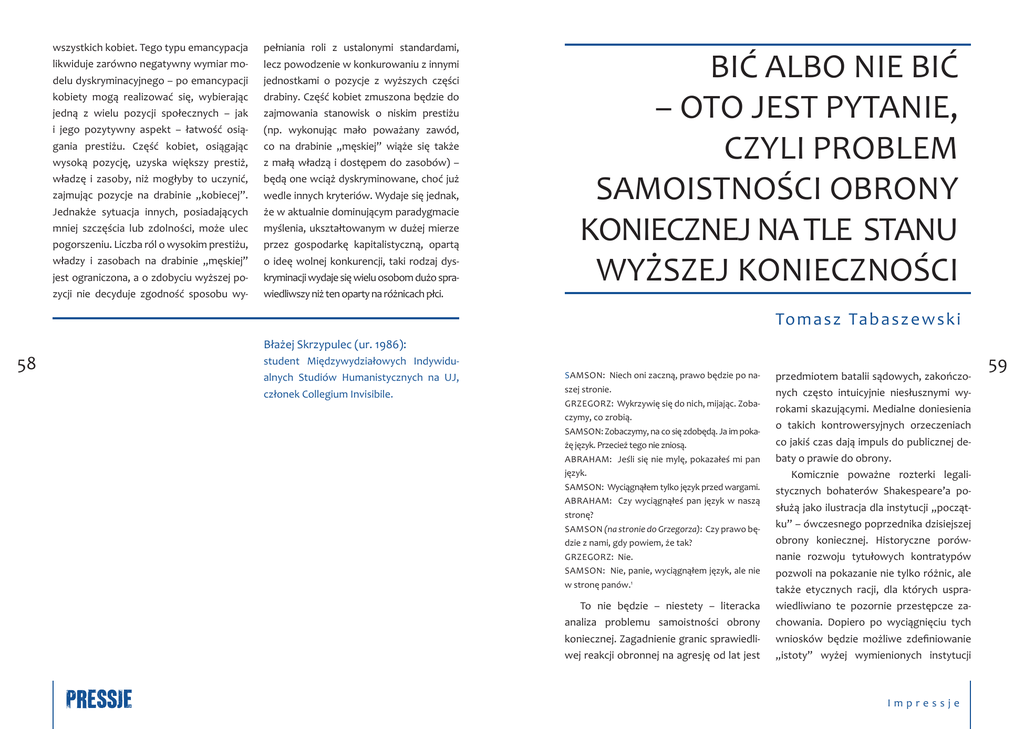 wszystkich kobiet. Tego typu emancypacja likwiduje zarówno negatywny wymiar modelu dyskryminacyjnego – po emancypacji kobiety mogą realizować się, wybierając jedną z wielu pozycji społecznych – jak i jego pozytywny aspekt – łatwość osiągania prestiżu. Część kobiet, osiągając wysoką pozycję, uzyska większy prestiż, władzę i zasoby, niż mogłyby to uczynić, zajmując pozycje na drabinie „kobiecej”. Jednakże sytuacja innych, posiadających mniej szczęścia lub zdolności, może ulec pogorszeniu. Liczba ról o wysokim prestiżu, władzy i zasobach na drabinie „męskiej” jest ograniczona, a o zdobyciu wyższej pozycji nie decyduje zgodność sposobu wy- pełniania roli z ustalonymi standardami, lecz powodzenie w konkurowaniu z innymi jednostkami o pozycje z wyższych części drabiny. Część kobiet zmuszona będzie do zajmowania stanowisk o niskim prestiżu (np. wykonując mało poważany zawód, co na drabinie „męskiej” wiąże się także z małą władzą i dostępem do zasobów) – będą one wciąż dyskryminowane, choć już wedle innych kryteriów. Wydaje się jednak, że w aktualnie dominującym paradygmacie myślenia, ukształtowanym w dużej mierze przez gospodarkę kapitalistyczną, opartą o ideę wolnej konkurencji, taki rodzaj dyskryminacji wydaje się wielu osobom dużo sprawiedliwszy niż ten oparty na różnicach płci. BIĆ ALBO NIE BIĆ – OTO JEST PYTANIE, CZYLI PROBLEM SAMOISTNOŚCI OBRONY KONIECZNEJ NA TLE STANU WYŻSZEJ KONIECZNOŚCI To m a s z Ta b a s z e w s k i Błażej Skrzypulec (ur. 1986): 58 student Międzywydziałowych Indywidualnych Studiów Humanistycznych na UJ, członek Collegium Invisibile. Samson: Niech oni zaczną, prawo będzie po naszej stronie. Grzegorz: Wykrzywię się do nich, mijając. Zobaczymy, co zrobią. Samson: Zobaczymy, na co się zdobędą. Ja im pokażę język. Przecież tego nie zniosą. Abraham: Jeśli się nie mylę, pokazałeś mi pan język. Samson: Wyciągnąłem tylko język przed wargami. Abraham: Czy wyciągnąłeś pan język w naszą stronę? Samson (na stronie do Grzegorza): Czy prawo będzie z nami, gdy powiem, że tak? Grzegorz: Nie. Samson: Nie, panie, wyciągnąłem język, ale nie w stronę panów.1 To nie będzie – niestety – literacka analiza problemu samoistności obrony koniecznej. Zagadnienie granic sprawiedliwej reakcji obronnej na agresję od lat jest przedmiotem batalii sądowych, zakończonych często intuicyjnie niesłusznymi wyrokami skazującymi. Medialne doniesienia o takich kontrowersyjnych orzeczeniach co jakiś czas dają impuls do publicznej debaty o prawie do obrony. Komicznie poważne rozterki legalistycznych bohaterów Shakespeare’a posłużą jako ilustracja dla instytucji „początku” – ówczesnego poprzednika dzisiejszej obrony koniecznej. Historyczne porównanie rozwoju tytułowych kontratypów pozwoli na pokazanie nie tylko różnic, ale także etycznych racji, dla których usprawiedliwiano te pozornie przestępcze zachowania. Dopiero po wyciągnięciu tych wniosków będzie możliwe zdefiniowanie „istoty” wyżej wymienionych instytucji Impressje 59 w oparciu o europejską tradycję prawną bez odwoływania się do aktualnej regulacji kodeksowej. Określenie „istoty” prawa do obrony koniecznej ma decydujące znaczenie dla interpretacji obowiązującego prawa – zarówno karnego, jak i konstytucyjnego. Doktrynalny spór o interpretację 25 art. kk uzasadnia poszukiwanie pozaprawnych argumentów dla możliwych rozwiązań. Zwłaszcza że nasze prawo często odwołuje się do ocen moralnych. Praktyczna doniosłość rozwiązania problemu jest olbrzymia – można ją sprowadzić do odpowiedzi na pytanie: czy napadnięty ma moralny obowiązek szukania innego niż siłowe rozwiązania? Stan wyższej konieczności 60 Obecnie w polskim prawie karnym stan wyższej konieczności występuje jako okoliczność wyłączająca bezprawność (art. 26 § 1 kk) oraz jako okoliczność wyłączająca winę (art. 26 § 2 kk). Jedynym kryterium podziału na te dwie różne odmiany tej samej konstrukcji prawnej jest proporcja wartości dobra zagrożonego i dobra poświęconego w celu ratowania tego pierwszego. Nie jest to odpowiednie miejsce na rozważanie wszystkich (niebudzących większych wątpliwości) znamion stanu wyższej konieczności, ale trzeba zwrócić uwagę na najistotniejsze jej cechy. Jedną z nich jest wspomniana proporcja dóbr odmierzana z niemal aptekarską dokładnością. Drugą – najbardziej istotną z interesującego nas punktu widzenia – jest subsydiarność stanu Od okoliczności wyłączających przestępność zachowania należy odróżnić wypadki, gdzie ze względów szczególnych prawo rezygnowało z wymierzania kary, mimo że było popełnione przestępstwo. Zwolnienie od kary znało prawo miejskie, które uwalniało od kary w przypadku stanu wyższej konieczności. Za taki uważano w szczególności kradzież niewielkiej ilości żywności czy odzieży przez osoby będące w nędzy. Stanem wyższej konieczności uzasadniała też nieraz praktyka miejska uwolnienie od kary za przestępstwo cudzołóstwa w wypadku długotrwałej nieobecności drugiego małżonka1. Człowiek w sytuacji, która spełnia wszystkie znamiona stanu wyższej konieczności z wyjątkiem warunku subsydiarności, ma obowiązek szukać „trzeciej drogi”, tj. innego rozwiązania problemu niż narażenie któregoś z dóbr chronionych prawem. Przykładowy żebrak, który kradnie z głodu, ma obowiązek wyczerpać wszystkie obiektywnie możliwe w jego sytuacji legalne sposoby zdobycia pożywienia. Warto zauważyć, że opisana wyżej konstrukcja prawna pojawia się dopiero w epoce nowożytnej i nie jest powszechnie uznawana przez prawo pozytywne. wyższej konieczności. Jest ona cechą wspólną dla obu odmian tej instytucji. Dopiero gdy „niebezpieczeństwa nie można inaczej uniknąć” niż przez poświęcenie dobra chro- Zacznijmy nasz