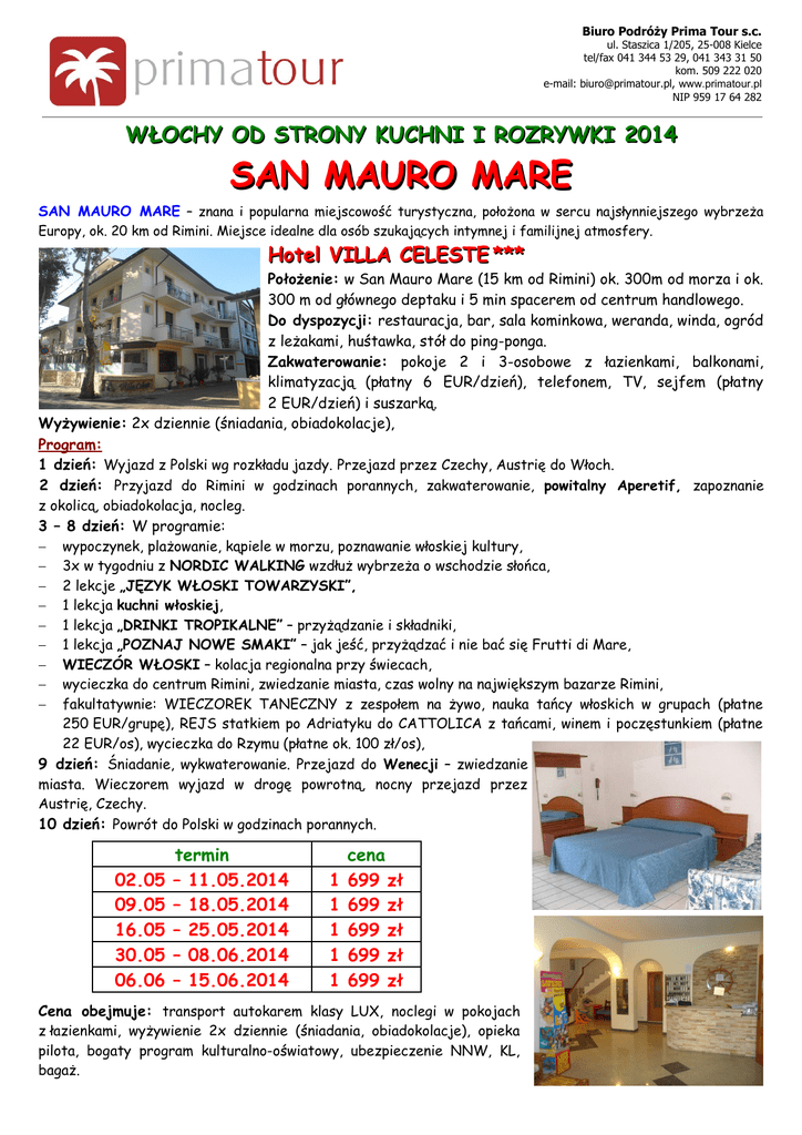 Biuro Podróży Prima Tour s.c. ul. Staszica 1/205, 25-008 Kielce tel/fax 041 344 53 29, 041 343 31 50 kom. 509 222 020 e-mail: [email protected], www.primatour.pl NIP 959 17 64 282 WŁOCHY OD STRONY KUCHNI I ROZRYWKI 2014 SAN MAURO MARE SAN MAURO MARE – znana i popularna miejscowość turystyczna, położona w sercu najsłynniejszego wybrzeża Europy, ok. 20 km od Rimini. Miejsce idealne dla osób szukających intymnej i familijnej atmosfery. Hotel VILLA CELESTE *** Położenie: w San Mauro Mare (15 km od Rimini) ok. 300m od morza i ok. 300 m od głównego deptaku i 5 min spacerem od centrum handlowego. Do dyspozycji: restauracja, bar, sala kominkowa, weranda, winda, ogród z leżakami, huśtawka, stół do ping-ponga. Zakwaterowanie: pokoje 2 i 3-osobowe z łazienkami, balkonami, klimatyzacją (płatny 6 EUR/dzień), telefonem, TV, sejfem (płatny 2 EUR/dzień) i suszarką. Wyżywienie: 2x dziennie (śniadania, obiadokolacje), Program: 1 dzień: Wyjazd z Polski wg rozkładu jazdy. Przejazd przez Czechy, Austrię do Włoch. 2 dzień: Przyjazd do Rimini w godzinach porannych, zakwaterowanie, powitalny Aperetif, zapoznanie z okolicą, obiadokolacja, nocleg. 3 – 8 dzień: W programie: − wypoczynek, plażowanie, kąpiele w morzu, poznawanie włoskiej kultury, − 3x w tygodniu z NORDIC WALKING wzdłuż wybrzeża o wschodzie słońca, − 2 lekcje „JĘZYK WŁOSKI TOWARZYSKI”, − 1 lekcja kuchni włoskiej, − 1 lekcja „DRINKI TROPIKALNE” – przyżądzanie i składniki, − 1 lekcja „POZNAJ NOWE SMAKI” – jak jeść, przyżądzać i nie bać się Frutti di Mare, − WIECZÓR WŁOSKI – kolacja regionalna przy świecach, − wycieczka do centrum Rimini, zwiedzanie miasta, czas wolny na największym bazarze Rimini, − fakultatywnie: WIECZOREK TANECZNY z zespołem na żywo, nauka tańcy włoskich w grupach (płatne 250 EUR/grupę), REJS statkiem po Adriatyku do CATTOLICA z tańcami, winem i poczęstunkiem (płatne 22 EUR/os), wycieczka do Rzymu (płatne ok. 100 zł/os), 9 dzień: Śniadanie, wykwaterowanie. Przejazd do Wenecji – zwiedzanie miasta. Wieczorem wyjazd w drogę powrotną, nocny przejazd przez Austrię, Czechy. 10 dzień: Powrót do Polski w godzinach porannych. 02.05 09.05 16.05 30.05 06.06 termin – 11.05.2014 – 18.05.2014 – 25.05.2014 – 08.06.2014 – 15.06.2014 1 1 1 1 1 cena 699 zł 699 zł 699 zł 699 zł 699 zł Cena obejmuje: transport autokarem klasy LUX, noclegi w pokojach z łazienkami, wyżywienie 2x dziennie (śniadania, obiadokolacje), opieka pilota, bogaty program kulturalno-oświatowy, ubezpieczenie NNW, KL, bagaż.