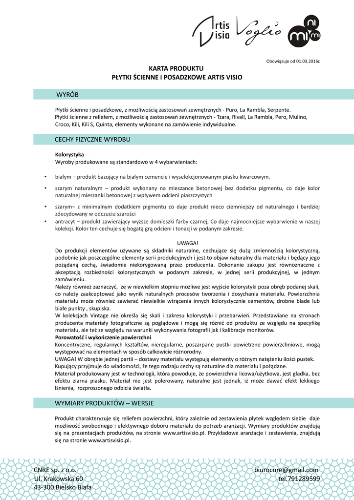 Obowiązuje od 01.03.2016r. KARTA PRODUKTU PŁYTKI ŚCIENNE i POSADZKOWE ARTIS VISIO WYRÓB Płytki ścienne i posadzkowe, z możliwością zastosowań zewnętrznych - Puro, La Rambla, Serpente. Płytki ścienne z reliefem, z możliwością zastosowań zewnętrznych - Tzara, Rivall, La Rambla, Pero, Mulino, Croco, Kili, Kili S, Quinta, elementy wykonane na zamówienie indywidualne. CECHY FIZYCZNE WYROBU Kolorystyka Wyroby produkowane są standardowo w 4 wybarwieniach: • białym – produkt bazujący na białym cemencie i wyselekcjonowanym piasku kwarcowym. • szarym naturalnym – produkt wykonany na mieszance betonowej bez dodatku pigmentu, co daje kolor naturalnej mieszanki betonowej z wpływem odcieni piaszczystych • szarym– z minimalnym dodatkiem pigmentu co daje produkt nieco ciemniejszy od naturalnego i bardziej zdecydowany w odczuciu szarości antracyt – produkt zawierający wyższe domieszki farby czarnej, Co daje najmocniejsze wybarwienie w naszej kolekcji. Kolor ten cechuje się bogatą grą odcieni i tonacji w podanym zakresie. • UWAGA! Do produkcji elementów używane są składniki naturalne, cechujące się dużą zmiennością kolorystyczną, podobnie jak poszczególne elementy serii produkcyjnych i jest to objaw naturalny dla materiału i będący jego pożądaną cechą, świadomie niekorygowaną przez producenta. Dokonanie zakupu jest równoznaczne z akceptacją rozbieżności kolorystycznych w podanym zakresie, w jednej serii produkcyjnej, w jednym zamówieniu. Należy również zaznaczyć, że w niewielkim stopniu możliwe jest wyjście kolorystyki poza obręb podanej skali, co należy zaakceptować jako wynik naturalnych procesów tworzenia i dosychania materiału. Powierzchnia materiału może również zawierać niewielkie wtrącenia innych kolorystycznie cementów, drobne blade lub białe punkty , skupiska. W kolekcjach Vintage nie określa się skali i zakresu kolorystyki i przebarwień. Przedstawiane na stronach producenta materiały fotograficzne są poglądowe i mogą się różnić od produktu ze względu na specyfikę materiału, ale też ze względu na warunki wykonywania fotografii jak i kalibracje monitorów. Porowatość i wykończenie powierzchni Koncentryczne, regularnych kształtów, nieregularne, poszarpane pustki powietrzne powierzchniowe, mogą występować na elementach w sposób całkowicie różnorodny. UWAGA! W obrębie jednej partii – dostawy materiału występują elementy o różnym natężeniu ilości pustek. Kupujący przyjmuje do wiadomości, że tego rodzaju cechy są naturalne dla materiału i pożądane. Materiał produkowany jest w technologii, która powoduje, że powierzchnia licowa/użytkowa, jest gładka, bez efektu ziarna piasku. Materiał nie jest polerowany, naturalne jest jednak, iż może dawać efekt lekkiego lśnienia, rozproszonego odbicia światła. WYMIARY PRODUKTÓW – WERSJE Produkt charakteryzuje się reliefem powierzchni, który zależnie od zestawienia płytek względem siebie daje możliwość swobodnego i efektywnego doboru materiału do potrzeb aranżacji. Wymiary produktów znajdują się na prezentacjach produktów, na stronie www.artisvisio.pl. Przykładowe aranżacje i zestawienia, znajdują się na stronie www.artisvisio.pl. CNRE sp. z o.o. Ul. Krakowska 60 43-300 Bielsko Biała [email protected] tel.791289599 Płytki produkowane są z założeniem niewielkich odstępstw wymiarowych świadomie dających efekt niedokładnego dopasowania. W przypadku rozbieżności wymiarowych, w wymiarach liniowych 2D stanowią one do 3 mm na każdym boku w stosunku do wymiarów schematycznych. W przypadku rozbieżności wymiaru w grubości płytki mogą one wynosić do +/- 5 mm. PARAMETRY TECHNICZNE Badanie parametrów technicznych zostało wykonane przez Centrum Usług Badawczo Projektowych Budownictwa „LABUD” Jan Mroczko a) Klasa wytrzymałości nie niższa jak C25/35 b) Mrozoodporność F 150 c) Nasiąkliwość materiału nieimpregnowanego średnia < 6,5% d) Odporność na ścieranie: Klasa 4i e) Reakcja na ogień: Klasa A1 Materiały posiadają certyfikat zgodności CE. Wyrób nie zawiera w swoim składzie azbestu. NORMY SPEŁNIONE PRZEZ PRODUKT/WYRÓB PN-EN 14992+A1:2012 – Prefabrykaty z betonu. Elementy ścian. PN-EN 13748 – 2:2006/Ap1:2006 - Płytki lastrykowe. Część 2. Płytki do zastosowań zewnętrznych. Badania Typu LBMB-01/04/2015 -CUBPB-Labud/CNRE. Certyfikat zgodności CE – deklaracja PŁ -OK-1/2015-CNRE-P8 Do produktów zindywidualizowanych stosuje się DWU – indywidualne Deklaracje Właściwości Użytkowych PAKOWANIE, TRANSPORT, PRZECHOWYWANIE PRODUKTU Wszystkie produkty – płytki Artis Visio, są pakowane w kartonach, przygotowane do wysyłki na paletach. Zabezpieczenie przed wpływem warunków atmosferycznych jest strech całej palety. Przesyłki dostarczane są transportem zewnętrznym lub własnym. Przesyłki są ubezpieczone. Spedytor każdorazowo przed załadunkiem ocenia sposób pakowania i potwierdza jego prawidłowość. W przypadku uszkodzenia przesyłki podstawą do reklamacji jest protokół zniszczenia, wykonany wraz z kurierem. Brak zgłoszenia usterki i dostarczenia takiego protokołu jest równoznaczne z odmową przyjęcia reklamacji produktu, a nowa dostawa produktu odbywa się ponownie na koszt zamawiającego. Produkt należy przechowywać w pomieszczeniach zamkniętych suchych, w temperaturze od +5 do +25 stopni Celsjusza. Płytki przed montażem powinny być rozpakowane, rozłożone na płaskiej powierzchni, z wyprzedzeniem 3 dni do daty montażu. Przed montażem należy wykonać próbne ułożenie produktu tak, aby świadomie zaplanować rozłożenie możliwych istniejących różnic w tonacji płytek. Zabrania się składowania płyt na powierzchniach wilgotnych, lub mających z nimi bezpośredni kontakt. IMPREGNACJA I OBRÓBKA Wskazanym do prawidłowego użytkowania płyt jest wykonanie impregnacji płytek ogólnodostępnymi środkami impregnującymi do b