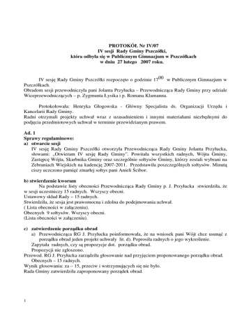 PROTOKÓŁ Nr IV/07 IV sesji Rady Gminy Pszczółki, która odbyła się w Publicznym Gimnazjum w Pszczółkach w dniu 27 lutego 2007 roku. IV sesję Rady Gminy Pszczółki rozpoczęto o godzinie 1700 w Publicznym Gimnazjum w Pszczółkach. Obradom sesji przewodniczyła pani Jolanta Przyłucka – Przewodnicząca Rady Gminy przy udziale Wiceprzewodniczących – p. Zygmunta Łysika i p. Romana Klamanna. Protokołowała: Henryka Głogowska - Główny Specjalista ds. Organizacji Urzędu i Kancelarii Rady Gminy. Radni otrzymali projekty uchwał wraz z uzasadnieniem i innymi materiałami niezbędnymi do podjęcia przedmiotowych uchwał w terminie przewidzianym prawem. Ad. 1 Sprawy regulaminowe: a) otwarcie sesji IV sesję Rady Gminy Pszczółki otworzyła Przewodnicząca Rady Gminy Jolanta Przyłucka, słowami: „Otwieram IV sesję Rady Gminy”. Powitała wszystkich radnych, Wójta Gminy, Zastępcę Wójta, Skarbnika Gminy oraz szczególnie sołtysów Gminy, którzy zostali wybrani na Zebraniach Wiejskich na kadencję 2007-2011. Przedstawiła poszczególnych sołtysów. Minutą ciszy uczczono pamięć zmarłej sołtys pani Anieli Ścibor. b) stwierdzenie kworum Na podstawie listy obecności Przewodnicząca Rady Gminy p. J. Przyłucka stwierdziła, że w sesji uczestniczy 15 radnych. Wszyscy obecni. Ustawowy skład Rady – 15 radnych. Stwierdziła, że sesja jest prawomocna i zdolna do podejmowania uchwał. ( Lista obecności w załączeniu). Obecnych 9 sołtysów. Wszyscy obecni. (Lista obecności w załączeniu). c) zatwierdzenie porządku obrad a) Przewodnicząca RG J. Przyłucka poinformowała, że na wniosek pani Wójt chce usunąć z porządku obrad jeden projekt uchwały lit. d). Poprosiła radnych o jego wykreślenie. Zapytała radnych, czy są propozycje dot. porządku obrad. Propozycji nie zgłoszono. Przewod. RG J. Przyłucka zarządziła głosowanie nad przyjęciem proponowanego porządku obrad. Obecnych – 15 radnych. Wynik głosowania: za – 15, przeciw i wstrzymujących się nie było. Rada Gminy zatwierdziła zaproponowany porządek obrad. 1 1. a) b) c) d) e) f) Porządek obrad IV sesji Rady Gminy Pszczółki przedstawiał się następująco: Sprawy regulaminowe: otwarcie sesji, stwierdzenie kworum, zatwierdzenie porządku obrad, przyjęcie protokołu III sesji, interpelacje i zapytania radnych oraz zapytania sołtysów, odpowiedzi na interpelacje i zapytania. 2. Rozpatrzenie projektów i podjęcie uchwał w sprawie: a) zmiany budżetu Gminy Pszczółki na 2007 rok – referuje p. Jolanta Żbikowska Skarbnik Gminy, b) zmiany w załączniku do uchwały nr XXVIII/286/06 Rady Gminy Pszczółki z dnia 17 marca 2006 roku w sprawie uchwalenia Regulaminu zbiorowego zaopatrzenia w wodę i zbiorowego odprowadzania ścieków w gminie Pszczółki – referuje p. Hanna Brejwo Wójt Gminy, c) zmiany w uchwale nr II/17/06 Rady Gminy Pszczółki z dnia 6 grudnia 2006 roku w sprawie ustalenia wysokości opłat za wodę pobraną z wiejskich urządzeń wodociągowych i za wprowadzanie ścieków do wiejskich urządzeń kanalizacyjnych – referuje p. Hanna Brejwo Wójt Gminy, d) zmiany uchwały nr XXXV/340/06 Rady Gminy Pszczółki z dnia 25 października 2006 roku w sprawie zaciągnięcia pożyczki długoterminowej na budowę kanalizacji sanitarnej w Kolniku – referuje p. Hanna Brejwo Wójt Gminy. e) zatwierdzenia Planu Pracy Komisji Rewizyjnej Rady Gminy Pszczółki na 2007 rok – referuje p. Janina Jakowska Przewodnicząca Komisji. 3. Plan Pracy Komisji Gospodarczej i Rozwoju Gminy Rady Gminy Pszczółki na 2007 rok – przedstawia p. Krzysztof Sądej Przewodniczący Komisji. 4. Plan Pracy Komisji Oświaty, Zdrowia, Opieki Społecznej, Kultury i Sportu Rady Gminy Pszczółki na 2007 rok – przedstawia p. Helena Grzesiuk Przewodnicząca Komisji. 5. Wolne wnioski i informacje. 6. Zamknięcie obrad sesji Rady Gminy. Ad. e) przyjęcie protokołu III sesji: Przewodnicząca Rady Gminy J. Przyłucka stwierdziła, że protokół III sesji Rady Gminy był wyłożony do wglądu i radni nie wnieśli żadnych poprawek. Protokół Nr III/06 został zatwierdzony przy braku sprzeciwu. Ad. f) interpelacje i zapytania radnych oraz zapytania sołtysów: Nie było. Ad. 2 Rozpatrzenie projektów i podjęcie następujących uchwał: a) w sprawie zmiany budżetu Gminy Pszczółki na 2007 rok omówiła Skarbnik Gminy Jolanta Żbikowska. Wójt Gminy H. Brejwo poprosiła o naniesienie autopoprawki w załączniku nr 7 do projektu uchwały tj. w Lp. 1, 1.2 dopisać należy słowa: „i w Pszczółkach”. 2 Skarbnik Gminy J. Żbikowska poprosiła o dopisanie w Załączniku nr 2 działu 010 – rozdział 01010 pozostałe wydatki 6.000,- oraz działu 630- rozdział 63003 pozostałe wydatki 7.000,-. Zmieni się treść projektu uchwały dot. przychodów, które wyniosą 4.143.000 zł, wydatki 20.398.178,-, deficyt 3.301.046 zł. Zmieni się w załączniku nr 3 kwota Razem – przychody i wyniesie 4.143.000,- zł. Następnie Skarbnik Gminy szczegółowo omówiła poszczególne załączniki do projektu uchwały. Radny R. Klamann zapytał o nadwyżkę budżetową? Skarbnik Gminy J. Żbikowska wyjaśniła, że to nie jest nadwyżka, tylko wolne środki zgodnie z ustawą o finansach publicznych. Została już rozdysponowana. Aby wprowadzić ostateczną kwotę musimy poczekać na ostatnie sprawozdanie. Innych pytań nie było. Przewodnicząca Rady Gminy J. Przyłucka zarządziła głosowanie nad projektem uchwały. Obecnych na sesji 15 radnych. Ustawowy skład Rady Gminy – 15 radnych. Wynik głosowania: za – 15 radnych., głosów przeciw i wstrzymujących się nie było. Uchwała Nr IV/35/07 została podjęta. b) Projekt uchwały w sprawie zmiany w załączniku do uchwały nr XXVIII/286/06 Rady Gminy Pszczółki z dnia 17 marca 2006 roku w sprawie uchwalenia Regulaminu zbiorowego zaopatrzenia w wodę i zbiorowego odprowadzania ścieków w gminie Pszczółki przedstawiła p. Hanna Brejwo Wójt Gminy. Pytań nie był