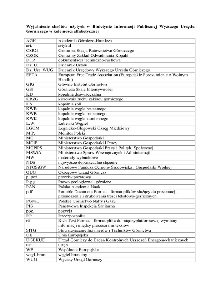 Wyjaśnienie skrótów użytych w Biuletynie Informacji Publicznej Wyższego Urzędu Górniczego w kolejności alfabetycznej AGH art. CSRG CZOK DTR Dz. U. Dz. Urz. WUG EFTA GIG GSI KD KRZG KS KWB KWB KWK L.W. LGOM M.P. MG MGiP MGPiPS MSWiA MW NDS NFOŚiGW OUG p. poż. P.g.g. PAN pdf PGNiG PIS poz. RP rtf SITG UE UGBKUE ust. WE węgl. brun. WUG Akademia Górniczo-Hutnicza artykuł Centralna Stacja Ratownictwa Górniczego Centralny Zakład Odwadniania Kopalń dokumentacja techniczno-ruchowa Dziennik Ustaw Dziennik Urzędowy Wyższego Urzędu Górniczego European Free Trade Association (Europejskie Porozumienie o Wolnym Handlu) Główny Instytut Górnictwa Górnicza Skala Intensywności kopalnia doświadczalna kierownik ruchu zakładu górniczego kopalnia soli kopalnia węgla brunatnego kopalnia węgla brunatnego kopalnia węgla kamiennego Lubelski Węgiel Legnicko-Głogowski Okręg Miedziowy Monitor Polski Ministerstwo Gospodarki Ministerstwo Gospodarki i Pracy Ministerstwo Gospodarki Pracy i Polityki Społecznej Ministerstwo Spraw Wewnętrznych i Administracji materiały wybuchowe najwyższe dopuszczalne stężenie Narodowy Fundusz Ochrony Środowiska i Gospodarki Wodnej Okręgowy Urząd Górniczy przeciw pożarowy Prawo geologiczne i górnicze Polska Akademia Nauk Portable Document Format - format plików służący do prezentacji, przenoszenia i drukowania treści tekstowo-graficznych Polskie Górnictwo Nafty i Gazu Państwowa Inspekcja Sanitarna pozycja Rzeczpospolita Rich Text Format - format pliku do międzyplatformowej wymiany informacji między procesorami tekstów Stowarzyszenie Inżynierów i Techników Górnictwa Unia Europejska Urząd Górniczy do Badań Kontrolnych Urządzeń Energomechanicznych ustęp Wspólnota Europejska węgiel brunatny Wyższy Urząd Górniczy z późn. zm. ze zm. ZG ZGE zm. ZZGNiG z późniejszymi zmianami ze zmianami zakład górniczy Zakład Górniczo-Energetyczny zmieniony Zielonogórski Zakład Górnictwa Nafty i Gazu