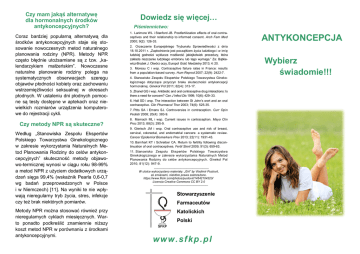 Czy mam jakąś alternatywę dla hormonalnych środków antykoncepcyjnych? Coraz bardziej popularną alternatywą dla środków antykoncepcyjnych staje się stosowanie nowoczesnych metod naturalnego planowania rodziny (NPR). Metody NPR często błędnie utożsamiane są z tzw. „kalendarzykiem małżeńskim”. Nowoczesne naturalne planowanie rodziny polega na systematycznych obserwacjach szeregu objawów płodności kobiety oraz zachowaniu wstrzemięźliwości seksualnej w okresach płodnych. W ustaleniu dni płodnych pomocne są testy dostępne w aptekach oraz niewielkich rozmiarów urządzenia komputerowe do rejestracji cykli. Czy metody NPR są skuteczne? Według „Stanowiska Zespołu Ekspertów Polskiego Towarzystwa Ginekologicznego w zakresie wykorzystania Naturalnych Metod Planowania Rodziny do celów antykoncepcyjnych” skuteczność metody objawowo-termicznej wynosi w ciągu roku 98-99% a metod NPR z użyciem dodatkowych urządzeń sięga 99,4% (wskaźnik Pearla 0,6-0,7 wg badań przeprowadzonych w Polsce i w Niemczech) [11]. Na wyniki te nie wpływają nieregularny tryb życia, stres, infekcje czy też brak niektórych pomiarów. Metody NPR można stosować również przy nieregularnych cyklach miesięcznych. Warto ponadto podkreślić znamiennie niższy koszt metod NPR w porównaniu z środkami antykoncepcyjnymi. Dowiedz się więcej… Piśmiennictwo: 1. Larimore WL i Stanford JB. Postfertilization effects of oral contraceptives and their relationship to informed consent. Arch Fam Med 2000; 9(2): 126-33. 2. Orzeczenie Europejskiego Trybunału Sprawiedliwości z dnia 18.10.2011 r. „Zapłodnienie jest początkiem życia ludzkiego i w imię ludzkiej godności wyklucza możliwość jakiejkolwiek procedury, która zakłada niszczenie ludzkiego embrionu lub tego wymaga.” Za: Bątkiewicz-Brożek J. Otwórz oczy, Europo! Gość Niedzielny 2013; 4: 20. 3. Moreau C i wsp. Contraceptive failure rates in France: results from a population-based survey. Hum Reprod 2007; 22(9): 2422-7. 4. Stanowisko Zespołu Ekspertów Polskiego Towarzystwa Ginekologicznego dotyczące przyczyn braku skuteczności antykoncepcji hormonalnej. Ginekol Pol 2011; 82(4): 313-17. 5. Zhanel GG i wsp. Antibiotic and oral contraceptive drug interactions: Is there a need for concern? Can J Infect Dis 1999; 10(6): 429–33. 6. Hall SD i wsp. The interaction between St John's wort and an oral contraceptive. Clin Pharmacol Ther 2003; 74(6): 525-35. 7. Pitts SA i Emans SJ. Controversies in contraception. Curr Opin Pediatr 2008; 20(4): 383-9. 8. Marnach ML i wsp. Current issues in contraception. Mayo Clin Proc 2013; 88(3): 295-9. 9. Gierisch JM i wsp. Oral contraceptive use and risk of breast, cervical, colorectal, and endometrial cancers: a systematic review. Cancer Epidemiol Biomarkers Prev 2013; 22(11): 1931-43. ANTYKONCEPCJ A 10. Barnhart KT i Schreiber CA. Return to fertility following discontinuation of oral contraceptives. Fertil Steril 2009; 91(3): 659-63. 11. Stanowisko Zespołu Ekspertów Polskiego Towarzystwa Ginekologicznego w zakresie wykorzystania Naturalnych Metod Planowania Rodziny do celów antykoncepcyjnych. Ginekol Pol 2010; 81(12): 947-9. ______________________________________________ W ulotce wykorzystano materiały: „Girl” by Vladimir Pustovit, ze zmianami, niektóre prawa zastrzeżone. https://www.flickr.com/photos/pustovit/14542104320/ Licencja Creative Commons CC BY 2.0 ______________________________________________ Stowarzyszenie Farmaceutów Katolickich Polski w w w . sf k p .p l ANTYKONCEPCJA Wybierz świadomie!!! Czy wiesz, jak to działa? Hormonalne środki antykoncepcyjne (tabletki, plastry itp.) zawierają syntetyczne estrogeny z dodatkiem gestagenów lub same gestageny, które wpływają na organizm na trzy sposoby: 1. Hamują owulację (jajeczkowanie). Obecnie stosowane dawki hormonów w środkach antykoncepcyjnych są na tyle niskie, że czasami dochodzi do owulacji [1]. 2. Utrudniają penetrację plemników poprzez zmiany składu śluzu w szyjce macicy. 3. Zapobiegają zagnieżdżeniu zapłodnionej komórki jajowej w błonie śluzowej macicy w przypadku niezadziałania powyższych mechanizmów [1]. Ten ostatni mechanizm odpowiada za zabicie dopiero co poczętego człowieka [2]. Czy środki antykoncepcyjne są stuprocentowo skuteczne? 50 do 65% nieplanowanych ciąż jest wynikiem niepowodzenia antykoncepcji [3]. W badaniach w USA zanotowano 12,4% niepowodzeń doustnej antykoncepcji w pierwszym roku jej stosowania. To znaczy, jej skuteczność wyniosła 87,6% [4]. Często podkreślana wysoka skuteczność hormonalnych środków antykoncepcyjnych jest osiągana wyłącznie przy bezwarunkowej dyscyplinie stosowania, gdy nie ma zaburzeń zdrowotnych (biegunki, wymioty) i nie dochodzi do niepożądanych interakcji lekowych (np. z antybiotykami, preparatami dziurawca, lekami przeczyszczającymi itd.) [5,6]. Według „Stanowiska Zespołu Ekspertów Polskiego Towarzystwa Ginekologicznego dotyczącego przyczyn braku skuteczności antykoncepcji hormonalnej” rzeczywiste ryzyko nieskuteczności antykoncepcji hormonalnej jest od 3 do 30-krotnie wyższe niż w warunkach perfekcyjnego stosowania tej metody [4]. Czy te środki są bezpieczne? Doustne środki antykoncepcyjne mogą powodować działania niepożądane takie jak: bóle zlokalizowane w różnych częściach ciała, duszność, nadciśnienie tętnicze i inne. Szczególnie niebezpieczne jest 2 do 7-krotnie podwyższone ryzyko zaburzeń zakrzepowo-zatorowych w naczyniach krwionośnych (skutkujące np. zawałem serca, udarem mózgu itp.) [7,8], które w skrajnych przypadkach mogą prowadzić do śmierci. W celu uzyskania szczegółowej informacji na temat możliwości wystąpienia działań niepożądanych przeczytaj dokładnie ulotkę dołączoną do opakowania. Czy środki antykoncepcyjne wpływają na rozwój nowotworów? U kobiet stosujących antykoncepcję częściej obserwuje się raka piersi i szyjki macicy [9]. Zwiększone ry