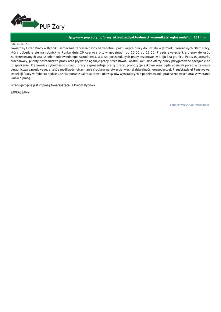 PUP Żory http://www.pup.zory.pl/formy_aktywizacji/aktualnosci_komunikaty_ogloszenia/idn:651.html (2016-06-15) Powiatowy Urząd Pracy w Rybniku serdecznie zaprasza osoby bezrobotne i poszukujące pracy do udziału w Jarmarku Sezonowych Ofert Pracy, który odbędzie się na rybnickim Rynku dnia 20 czerwca br., w godzinach od 10.00 do 12.00. Przedsięwzięcie kierujemy do osób zainteresowanych znalezieniem odpowiedniego zatrudnienia, a także poszukujących pracy sezonowej w kraju i za granicą. Podczas Jarmarku pracodawcy, punkty pośrednictwa pracy oraz prywatne agencje pracy przedstawią Państwu aktualne oferty pracy przygotowane specjalnie na to spotkanie. Pracownicy rybnickiego urzędu pracy zaprezentują oferty pracy, propozycje szkoleń oraz będą udzielali porad w zakresie poradnictwa zawodowego, a także możliwości otrzymania środków na otwarcie własnej działalności gospodarczej. Przedstawiciel Państwowej Inspekcji Pracy w Rybniku będzie udzielał porad z zakresu praw i obowiązków wynikających z podejmowania prac sezonowych oraz zawierania umów o pracę. Przedsięwzięcie jest imprezą towarzyszącą IX Dniom Rybnika. ZAPRASZAMY!!! zobacz wszystkie aktualności