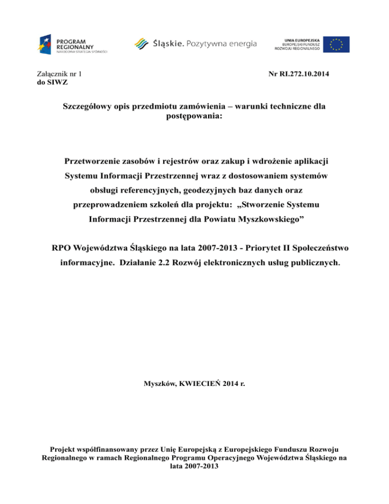 Załącznik nr 1 do SIWZ Nr RI.272.10.2014 Szczegółowy opis przedmiotu zamówienia – warunki techniczne dla postępowania: Przetworzenie zasobów i rejestrów oraz zakup i wdrożenie aplikacji Systemu Informacji Przestrzennej wraz z dostosowaniem systemów obsługi referencyjnych, geodezyjnych baz danych oraz przeprowadzeniem szkoleń dla projektu: „Stworzenie Systemu Informacji Przestrzennej dla Powiatu Myszkowskiego” RPO Województwa Śląskiego na lata 2007-2013 - Priorytet II Społeczeństwo informacyjne. Działanie 2.2 Rozwój elektronicznych usług publicznych. Myszków, KWIECIEŃ 2014 r. Projekt współfinansowany przez Unię Europejską z Europejskiego Funduszu Rozwoju Regionalnego w ramach Regionalnego Programu Operacyjnego Województwa Śląskiego na lata 2007-2013 Spis treści 1 Wstęp ............................................................................................................................................... 3 1.1 Kategorie kosztów inwestycyjnych projektu: .................................................................... 3 2 Uzasadnienie, opis i cele projektu SIP_PM-PM ............................................................................ 3 2.1 Oczekiwane produkty i rezultaty projektu ......................................................................... 5 2.2 Wymagane efekty prac ....................................................................................................... 6 3 Regulacje prawne ............................................................................................................................ 6 4 Wytyczne techniczne oraz zakres przetworzenia zasobów i rejestrów do postaci cyfrowej. .......... 8 4.1 Charakterystyka obiektu oraz wymagany zakres prac. ...................................................... 9 4.2 Wymagania w zakresie technologii przetworzenia zasobów i rejestrów do postaci cyfrowej w zakresie baz danych referencyjnych. .................................................................................... 13 4.3 Wymagania w zakresie technologii przetworzenia zasobów i rejestrów do postaci cyfrowej w zakresie baz danych dziedzinowych ..................................................................................... 20 5 Techniczne i funkcjonalne wymagania w zakresie dostarczenia i wdrożenia zintegrowanych struktur SIP_PM_PM funkcjonujących w oparciu o dane dostarczone w wyniku przetworzenia i konwersji danych oraz zintegrowane i zharmonizowane z produktami dostarczonymi w wyniku realizacji zadania II. ........................................................................................................................... 24 5.1 Cechy architektury SIP_PM-PM ..................................................................................... 24 5.1.1 Architektura logiczna ............................................................................................25 5.2 Infrastruktura funkcjonalna SIP_PM ............................................................................... 26 5.3 Podsystem centralnej bazy danych i serwera danych przestrzennych. ............................ 27 5.4 Podsystem aplikacji użytkownika .................................................................................... 28 5.4.1 Aplikacja dostępu do baz danych przestrzennych oraz 3D SIP_PM_DP ............29 5.4.2 Aplikacja dostępu do danych ewidencji gruntów i budynków SIP_PM_EGiB ...32 5.4.3 Aplikacja prezentacji struktury własności nieruchomości SIP_PM_WN ............33 5.4.4 Aplikacja integracji spraw i decyzji administracyjnych z przestrzenią SIP_PM_ISP ... 34 5.4.5 Podsystem obsługi metadanych SIP_PM_metaOM ............................................37 5.4.6 Aplikacja prezentacji metadanych SIP_PM_metaOP...........................................38 5.4.7 Podsystem administracji systemem i użytkownikami ..........................................39 5.4.8 Podsystem publikacji danych przestrzennych SIP_PM_PDP ..............................41 5.4.9 Portal interaktywnego planu powiatu SIP_PM_IPP ............................................43 5.4.10 Portal inwestora SIP_PM_Iwest .........................................................................43 6 Techniczne i funkcjonalne wymagania w zakresie dostarczenia i wdrożenia systemów obsługi referencyjnych, geodezyjnych baz danych dostosowanych do wymogów nowych regulacji prawnych w dziedzinie geodezji - SIP_PM_ZS_GBD. ..................................................................... 43 7 Plan wdrożenia oraz pozostała dokumentacja ............................................................................... 54 8 załącznik graficzny do zadania I .................................................................................................... 56 Projekt współfinansowany przez Unię Europejską z Europejskiego Funduszu Rozwoju Regionalnego w ramach Regionalnego Programu Operacyjnego Województwa Śląskiego na lata 2007-2013 2 1 Wstęp Projekt pod nazwą „Stworzenie Systemu Informacji Przestrzennej dla Powiatu Myszkowskiego” realizowany będzie przez Powiat Myszkowski w ramach Regionalnego Programu Operacyjnego Województwa Śląskiego na lata 2007 – 2013 i współfinansowany ze środków Europejskiego Funduszu Rozwoju Regionalnego. Beneficjentem głównym projektu i jednostką odpowiedzialną za jego realizacje jest Powiat Myszkowski. Akronimem dla powyższego tytułu projektu w dalszej części niniejszego opisu jest: „SIP_PM-PM” W projekcie wezmą udział: Starostwo Powiatowe w Myszkowie – beneficjent bezpośredni użytkownicy kwalifikowani i niekwalifikowani systemu. 1.1 Kategorie kosztów inwestycyjnych projektu: Przedmiot zamówienia obejmuje następujące kategorie kosztów inwestycyjnych projektu zgodnie z Wnioskiem o dofinansowanie projektu: Kategoria 7. Zakup i wdrożenie aplikacji Systemu Informacji Przestrzennej: Aplikacje Kategoria 8. Zakup i wdrożenie aplikacji Systemu Informacji Przestrzennej: Wdr