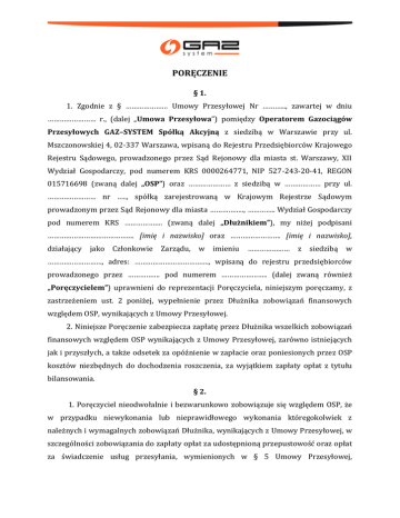 PORĘCZENIE § 1. 1. Zgodnie z § ………………… Umowy Przesyłowej Nr ………..., zawartej w dniu …………………… r., (dalej „Umowa Przesyłowa”) pomiędzy Operatorem Gazociągów Przesyłowych GAZ–SYSTEM Spółką Akcyjną z siedzibą w Warszawie przy ul. Mszczonowskiej 4, 02-337 Warszawa, wpisaną do Rejestru Przedsiębiorców Krajowego Rejestru Sądowego, prowadzonego przez Sąd Rejonowy dla miasta st. Warszawy, XII Wydział Gospodarczy, pod numerem KRS 0000264771, NIP 527-243-20-41, REGON 015716698 (zwaną dalej „OSP”) oraz ………………… z siedzibą w ……………… przy ul. …………………… nr ….., spółką zarejestrowaną w Krajowym Rejestrze Sądowym prowadzonym przez Sąd Rejonowy dla miasta …………….., ………….. Wydział Gospodarczy pod numerem KRS ………………. (zwaną dalej „Dłużnikiem”), my niżej podpisani ……………………………………. [imię i nazwisko] oraz ……………………. [imię i nazwisko], działający jako Członkowie Zarządu, w imieniu ………………… z siedzibą w ………………………, adres: ………………………………., wpisaną do rejestru przedsiębiorców prowadzonego przez ……………. pod numerem ………………….. (dalej zwaną również „Poręczycielem”) uprawnieni do reprezentacji Poręczyciela, niniejszym poręczamy, z zastrzeżeniem ust. 2 poniżej, wypełnienie przez Dłużnika zobowiązań finansowych względem OSP, wynikających z Umowy Przesyłowej. 2. Niniejsze Poręczenie zabezpiecza zapłatę przez Dłużnika wszelkich zobowiązań finansowych względem OSP wynikających z Umowy Przesyłowej, zarówno istniejących jak i przyszłych, a także odsetek za opóźnienie w zapłacie oraz poniesionych przez OSP kosztów niezbędnych do dochodzenia roszczenia, za wyjątkiem zapłaty opłat z tytułu bilansowania. § 2. 1. Poręczyciel nieodwołalnie i bezwarunkowo zobowiązuje się względem OSP, że w przypadku niewykonania lub nieprawidłowego wykonania któregokolwiek z należnych i wymagalnych zobowiązań Dłużnika, wynikających z Umowy Przesyłowej, w szczególności zobowiązania do zapłaty opłat za udostępnioną przepustowość oraz opłat za świadczenie usług przesyłania, wymienionych w § 5 Umowy Przesyłowej, Poręczyciel wykona takie zobowiązanie Dłużnika, z zastrzeżeniem §1 ust. 2 niniejszego Poręczenia. 2. Niniejsze Poręczenie jest ograniczone do wysokości ……………………….. złotych (słownie: ………………). 3. Niniejsze Poręczenie pozostanie w mocy przez okres od daty wystawienia do ………………………..r. 4. Poręczyciel oświadcza, że zobowiązania z tytułu niniejszego Poręczenia wykona niezwłocznie po zawiadomieniu go przez OSP o opóźnieniu w spłacie przez Dłużnika należności wynikających z Umowy Przesyłowej, poprzez zapłatę kwoty zadłużenia na rachunek bankowy wskazany przez OSP w terminie 7 dni od otrzymania w/w zawiadomienia. Dniem zapłaty będzie dzień, w którym rachunek bankowy OSP zostanie uznany sumą wskazaną w w/w zawiadomieniu. 5. Wszelkie wpłaty dokonane przez Poręczyciela na rzecz OSP na mocy niniejszego Poręczenia będą wolne od jakichkolwiek potrąceń i odliczeń. § 3. 1. Niniejsze Poręczenie podlega prawu polskiemu. W sprawach nieuregulowanych niniejszym Poręczeniem zastosowanie mają obowiązujące przepisy prawa, a w szczególności: ustawa z dnia 23 kwietnia 1964 r. Kodeks cywilny (Dz. U. Nr 16, poz. 93, z późn. zm.). 2. Wszystkie spory mogące wyniknąć z niniejszego Poręczenia będą rozstrzygane przez sąd powszechny właściwy dla miejsca siedziby OSP. Podpisano w ……………………….. w dniu ………………………….., ……………….r. W imieniu i na rzecz ……………………………………………………… __________________ [imię i nazwisko] OSP oświadcza, iż przyjmuje złożone Poręczenie. ____________________ [imię i nazwisko] _________________ [imię i nazwisko]