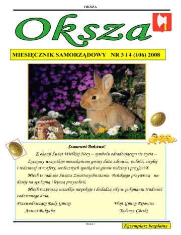 OKSZA MIESIĘCZNIK SAMORZĄDOWY NR 3 i 4 (106) 2008 ! $ " # * # & # # # % & & # & ! # # " ! ' $ ' # $ ( ) ! $ # " ( + , ' , + - . / Strona 1 , ' Egzemplarz bezpłatny OKSZA ! , ! & ! # & # + Strona 2 Strona 2 , & $ & OKSZA N a XVII Sesji Rady Gminy radni podjęli u c h w a ł y w spr awi e przystąpienia Gminy do stowarzyszenia Lokalnej Grupy Działania PROMENADA S 12 obejmującej gminy: Rejowiec, Rejowiec Fabryczny, Siedliszcze, Chełm i miasto Rejowiec Fabryczny. LGD ma za zadanie pobudzenie aktywności mieszkańców w celu zrównoważonego rozwoju obszarów wiejskich, ochrony i promocji środowiska naturalnego, krajobrazu i zasobów historyczno – kulturalnych, turystyki oraz popularyzacji i rozwoju produkcji wyrobów regionalnych. Będzie opiniować wnioski składane do Programu Rozwoju Obszarów Wiejskich i do programu LIDER. Uchwała przyjęta jednogłośnie. *** - w sprawie utworzenia spółki pn. „BIOENERGETYKA REJOWIECKA spółka z. o. o.” wspólnie z gminą Rejowiec Fabryczny i miastem Rejowiec Fabryczny. Utworzenie spółki stwarza szansę rozpoczęcia produkcji energii elektrycznej i ciepła na bazie zielonki z kukurydzy. Rolnicy będą mieli możliwość zawarcia umowy kontraktacyjnej z zapewnieniem zbytu kukurydzy po korzystnych cenach, jak też pozyskania sprzętu potrzebnego do uprawy. Otrzymają również gwarancję udziału w zyskach. W/ w produkcja to tańsza energia dla Rejowca i ciepło do ogrzewania. Uchwała przyjęta jednogłośnie. *** w sprawie likwidacji zakładu budżetowego – Zakładu Usług Komunalnych. Majątek nieruchomy znajdujący się w jego użytkowaniu przechodzi pod zarząd Wójta i zostanie zagospodarowany na zasadach obowiązujących w gospodarowaniu gminnym zasobem nieruchomości. Uchwała - w sprawie strategii Rozwoju Gminy przyjęta 13 głosami „ za”, 2 głosy Rejowiec na lata 2008 – 2015. Posia- wstrzymujące się. danie aktualnej strategii Rozwoju *** wraz z wynikającym z niej Wieloletnim Planem Inwestycyjnym ( WPI ) - w sprawie likwidacji zakładu bupozwoli na ubieganie się o środki dżetowego – Zakładu Usług Komufinansowe z Regionalnego Programu nalnych. Majątek nieruchomy znajduOperacyjnego ( RPO ) woj. lubelskie- jący się w jego użytkowaniu przechogo na lata 2007 – 2013. Uchwała dzi pod zarząd Wójta i zostanie zagoprzyjęta jednogłośnie. spodarowany na zasadach obowiązujących w gospodarowaniu gminnym *** - zasobem nieruchomości. Uchwała przyjęta 13 głosami „ za”, 2 głosy wstrzymujące się. *** - w sprawie zamiaru likwidacji Szkoły Filialnej w Maryninie. Wcześniej odbyło się zebranie rodziców uczniów tej szkoły i nauczycieli z udziałem Wójta T. Górskiego, Przew. Rady A. Bukraby i radnych I. Jędruszczak, J. Danielczuk, M. Kościa.Uchwała przyjęta 14 głosami „ za”, 1 głos wstrzymujący się. *** - w sprawie zamiaru likwidacji Szkoły Podstawowej im. 4 Brygady Wojska Polskiego w Zawadówce, uczniowie będą mieli możliwość kontynuowania nauki w Szkole Podstawowej w Leonowie. W Zawadówce odbyły się dwa zebrania mieszkańców z Wójtem, Przew. Rady i radnymi, w trakcie których nie osiągnięto porozumienia w temacie racjonalnej sieci szkół w gminie. Po wszechstronnej analizie na dwu wspólnych posiedzeniach wszystkich Komisji Rady ( 12 lutego z udziałem 13 radnych, 18 lutego z udziałem 12 radnych ). Rada uznała za celowe pozostawienie Szkoły w Leonowie odległej od Zawadówki 2, 8 km. Uchwała przyjęta13 głosami „ za” , 2 głosy przeciw. Janina Danielczuk OGŁOSZENIE Wójt Gminy Rejowiec informuje, że na stronie internetowej Gminy Rejowiec https:// portal.rejowiec.bip-gov.info.pl oraz na tablicy ogłoszeń Urzędu Gminy został zamieszczony wykaz nieruchomości stanowiącej własność gminy przeznaczonej do sprzedaży, położonej w Aleksandrii Niedziałowskiej - działka nr 154. .OGŁOSZENIE Wójt Gminy Rejowiec informuje, że na stronie internetowej Gminy Rejowiec https://portal.rejowiec.bip-gov.info.pl oraz na tablicy ogłoszeń Urzędu Gminy został zamieszczony wykaz nieruchomości stanowiącej własność gminy przeznaczonej do sprzedaży w trybie bezprzetargowym, położonej w Zawadówce - działka nr 60. Strona 3 OKSZA ( słownie: jeden milion czterysta tysięcy zł. ) i rozchody budżetu w kwocie 1. 680. 676 zł. ( słownie: jeden milion sześćset osiemdziesiąt tysięcy sześćset siedemdziesiąt sześć zł. ). Określa się dochody budżetu Nadwyżkę budżetu gminy w kwocie gminy w kwocie 14. 660. 916 zł. 280. 676 zł. przeznacza się na spłatę ( słownie: czternaście milionów rat kredytów i pożyczek. sześćset sześćdziesiąt tysięcy dzie*** więćset szesnaście zł. ) z tego : dochody bieżące 14. 389. 416 zł. Tworzy się rezerwy: dochody majątkowe 271. 500 zł. ogólną w kwocie 130. 000 zł( słoww tym – dotacje celowe na realizację nie: sto trzydzieści tysięcy zł. ) zadań z zakresu administracji rządo- celową w kwocie 60. 000 zł. z przewej i innych zadań zleconych gminie znaczeniem na realizację zadań w ustawami w kwocie 2. 389. 571 zł. zakresie zarządzania kryzysowego. ( słownie: dwa miliony trzysta osiem*** dziesiąt dziewięć tysięcy pięćset siedemdziesiąt jeden zł. ) Wydatki na zadania inwestydochody z tytułu wydawania zezwo- cyjne nie objęte wieloletnimi prograleń na sprzedaż napojów alkoholomami inwestycyjnymi 1 080. 000 zł. wych, w kwocie ( słownie: jeden milion osiemdziesiąt tysięcy zł. ) w tym: 60. 000 zł. ( słownie: sześćdziesiąt tysięcy zł. ) wykup działek pod zbiornik retencyjny – 10. 000 zł *** systemu oczyszczania ścieOkreśla się wydatki budżetu budowa ków – 280. 000 zł. gminy w kwocie 14. 380. 240 zł. ( słownie: czternaście milionów trzy- budowa cmentarza – 20. 000 zł. sta osiemdziesiąt tysięcy dwieście modernizacja dróg gminnych – 300. 000 zł. czterdzieści zł. ) z tego: informatyzacja gminy – 50. 000 zł wydatki bieżące 13. 300. 240 zł. ( słown