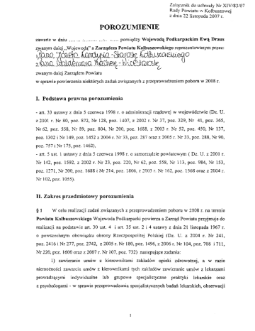 szpitalnej oraz badań psychologicznych poborowych, zgodnie ze zleceniem powiatowej komisji lekarskiej, 2) pokrycie kosztów specjalistycznych badań lekarskich, obserwacji szpitalnej oraz badań psychologicznych, 3) w ramach przyznanej dotacji na zadania zlecone z zakresu administracji rządowej przekazanie środków finansowych wójtom, burmistrzom, prezydentom miast z terenu Powiatu na pokrycie kosztów związanych z wypłaceniem poborowym stającym do poboru w 2008 r. na wezwanie wójta, burmistrza, prezydenta miasta, świadczeń na zasadach określonych w art. 52 ust. 2 i 3 cyt. ustawy o powszechnym obowiązku obrony Rzeczypospolitej Polskiej. III. Warunki realizacji porozumienia §2 1. Zarząd Powiatu Kolbuszowskiego zobowiązuje się : 1) pokryć koszty wykonania specjalistycznych badań lekarskich i obserwacji szpitalnej poborowych oraz badań psychologicznych zgodnie z cennikiem usług medycznych obowiązującym w danym zakładzie opieki zdrowotnej, do którego poborowy został skierowany z zastrzeżeniem, że ceny badań specjalistycznych nie mogą być wyższe od cen ujętych w cenniku usług medycznych właściwego Regionalnego Oddziału Narodowego Funduszu Zdrowia, 2) przekazać wójtom, burmistrzom, prezydentom miast środki finansowe na pokrycie świadczeń, o których mowa w § 1 pkt 3 niniejszego porozumienia, na podstawie odrębnie zawartych umów z wójtami, burmistrzami, prezydentami miast z obszaru Powiatu, 3) prowadzić wyodrębnioną ewidencję księgową otrzymanej dotacji oraz wydatków dokonywanych z tych środków. 2. Wojewoda przyznaje na realizację zadań, o których mowa w § 1 pkt 1 i 2 dotację celową w kwocie nie wyższej niż 10.000,00 zł (słownie: dziesięć tysięcy złotych) sklasyfikowaną w budżecie Wojewody na 2008 rok; dział 750 - Administracja Publiczna, rozdział 75045 - Komisje Poborowe, § 2120 - dotacje celowe na zadania bieżące realizowane przez Powiat na podstawie porozumień z organami administracji rządowej. 3. Środki finansowe na realizację zadania, o którym mowa w § 1 pkt 3 przekazane w ramach dotacji zostaną celowej, sklasyfikowanej w budżecie Wojewody na 2008 r. : 2 dział 750 - Administracja Publiczna, rozdział 75045 - Komisje Poborowe, § 2110 - dotacje celowe przekazane z budżetu państwa na zadania bieżące z zakresu administracji rządowej oraz inne zadania zlecone ustawami realizowane przez Powiat - na podstawie odrębnej decyzji. 4. Kwoty dotacji przyznanych na realizację zadań określonych w niniejszym porozumieniu mogą ulec zmianie po ostatecznym rozliczeniu wykonanych zadań. 5. Zmiana wysokości w/w dotacji nie wymaga aneksu do niniejszego porozumienia, zostanie określona w pisemnym zawiadomieniu Wojewody przesłanym po zatwierdzeniu rozliczenia, o którym mowa w § 3. §3 1. Zarząd Powiatu rozliczając koszty przeprowadzenia poboru, zobowiązany jest przedstawić : 1) wykaz specjalistycznych badań lekarskich, obserwacji szpitalnych oraz badań psychologicznych poborowych z podaniem jednostkowych kosztów wykonania tych badań oraz nazwisk i imion poborowych, których poddano wymienionym badaniom i obserwacji szpitalnej na zlecenie powiatowej komisji lekarskiej, jak również faktury obciążeniowe wystawione przez zakłady opieki zdrowotnej bądź lekarzy prowadzących indywidualne lub grupowe specjalistyczne praktyki lekarskie oraz przez psychologów, 2) kserokopie (potwierdzone za zgodność z oryginałem odpowiednio według właściwości przez wójta, burmistrza, prezydenta miasta) dokumentów stanowiących podstawę wypłaty świadczeń poniesionych przez wójta, burmistrza, prezydenta miasta, o których mowa w art. 52 ust. 2 i 3 cyt. wyżej ustawy o powszechnym obowiązku obrony Rzeczypospolitej Polskiej, 3) kopie umów zawartych z wójtami, burmistrzami, prezydentami miast, na podstawie których zostały pokryte koszty świadczeń, o których mowa wyżej. 2. Kserokopie dokumentów przedkładanych do rozliczeń winny być zatwierdzone pod względem merytorycznym i formalno rachunkowym oraz potwierdzone za zgodność z oryginałem przez uprawnionych pracowników starostwa powiatowego i ujęte w zestawieniu według wzoru stanowiącego załącznik Nr 1 do niniejszego porozumienia. 3. Rozliczenie kosztów przeprowadzenia poboru powinno nastąpić najpóźniej w ciągu jednego miesiąca od daty zakończenia poboru w Powiecie. 3 §4 1. Środki finansowe z budżetu Wojewody, określone w § 2 ust. 2, przekazywane będą na rachunek Powiatu Kolbuszowskiego w następujących transzach: 1/ pierwsza transza dotacji, w wysokości 7.000,00 zl (słownie: siedem tysięcy złotych) przed rozpoczęciem poboru, 2/ druga transza dotacji, w wysokości stanowiącej różnicę pomiędzy wysokością rzeczywistych kosztów realizacji zadań określonych w § 1 pkt 1 i 2 al transzą, w terminie do 21 dni od daty przedłożenia rozliczenia końcowego kosztów poboru. 2. Dotacja, o której mowa w § 2 ust. 3, przekazywana będzie na rachunek Powiatu Kolbuszowskiego w terminach określonych w ust. 1, w kwotach wynikających z harmonogramu realizacji wydatków, nie przekraczających planu określonego w decyzji Wojewody. 3. W przypadku stwierdzenia nieprawidłowości w przedkładanych rozliczeniach, termin określony w ust. 1 pkt 2 będzie liczony od daty ich wyjaśnienia. 4. Środki finansowe przekazane w ramach przyznanej dotacji wykorzystane niezgodnie z przeznaczeniem, pobrane nienależnie lub w nadmiernej wysokości podlegają zwrotowi na zasadach określonych w ustawie z dnia 30 czerwca 2005 r. o finansach publicznych (Dz. U. Nr 249, poz. 2104 ze zm.). § 5 Przekazanie dotacji w terminach określonych w § 4 ust. 1 nie powoduje skutków finansowych dla Wojewody za nieterminowe realizowanie przez Zarząd Powiatu płatności dotyczących wykonania powierzonego zadania. § 6 Wojewoda sprawuje nadzór nad realizacją zadań objętych niniejszym porozumieniem za pomocą Dyrektora Wydziału Spraw Obywatelskich i Cudzozie