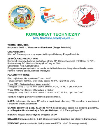 KOMUNIKAT TECHNICZNY Trzej Królowie przybywajcie … TERMIN I MIEJSCE: 6 stycznia 2016 r., Warszawa – Kamionek (Praga Południe) ORGANIZATOR: Klub InO Stowarzysze przy wsparciu Urzędu Dzielnicy Praga-Południe. ZESPÓŁ ORGANIZACYJNY: Kierownik imprezy, budowa dojściówki i trasy TP: Dariusz Mazurek (PInO leg. nr 721). Budowa trasy TO: Barbara Szmyt (PInO leg. nr 660). Sekretariat: Ania Kadłubowska. Przygotowanie poczęstunku na mecie: Ania Kadłubowska, Magdalena Senderowska. Pomoc: Renata Łaska, Dariusz Walczyna. PARAMETRY TRAS: Etap dojściowy „Na spotkanie Trzech Króli” - długość trasy: 1500 m, brak limitu czasu, 10 PK, 1 punkt na OInO Trasa (TP) „Gwiazda drogę Wam wskaże” – długość trasy: 3700 m, limit czasu: 90 min. + 25ʹ, 14 PK, 1 pkt. na OInO Trasa (TO) „Trzy Korony i Gwizdaka z Nieba” – długość trasy: 3900 m, limit czasu: 110 min. + 30ʹ, 16 PK, 1 pkt. na OInO TEREN: miejsko-parkowy o zmiennej przebieżności. MAPA: kolorowa, dla trasy TP pełna z wycinkami, dla trasy TO niepełna, z wycinkami i drobnymi przekształceniami. START: czynny od godz. 17.30 do 18.10 zlokalizowany będzie na świeżym powietrzu, przy Rogatce Grochowskiej – Fabryka Wdzięku, ul. J. Zamoyskiego 55. META: w miejscu startu czynna do godz. 20.30. DOJAZD: tramwajem linii 3, 6, 22, 26 do przystanku Lubelska lub własnym transportem. WPISOWE: płatne na starcie, 5 zł (członkowie PTTK i KInO Stowarzysze 4 zł). ŚWIADCZENIA: mapa dla każdego uczestnika, okolicznościowa naklejka, potwierdzenie punktów do OInO (możliwość zakupu na imprezie książeczki OInO), napój i słodki poczęstunek na mecie upominki dla uczestników, w tym prezent dla najmłodszego z nich, co najmniej 5 atrakcyjnych nagród do rozlosowania wśród zwycięzców. WYPOSAŻENIE UCZESTNIKA: dobry humor, ubiór odpowiedni do warunków pogodowych, kompas, latarka, przybory do kreślenia i pisania. REFERAT WERYFIKACYJNY: Na imprezie będzie możliwość weryfikacji Odznaki Imprez na Orientację (w stopniach od popularnego do małego złotego), Odznaki Lampion oraz Odznaki TRInO – z możliwością zakupu blach. POSTANOWIENIA KOŃCOWE: Impreza odbędzie się bez względu na pogodę, za szkody wynikłe wobec uczestników, jak i osób trzecich organizator nie odpowiada. Członkowie PTTK objęci będą ubezpieczeniem od NNW członków Towarzystwa, pozostali uczestnicy ubezpieczają się we własnym zakresie. Na imprezie obowiązuje punktacja KInO ZG PTTK, ostateczna interpretacja regulaminu należy do Organizatorów. Do zobaczenia na starcie!