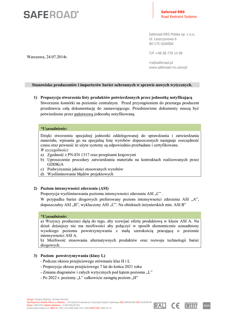 Saferoad RRS Road Restraint Systems Saferoad RRS Polska sp. z o.o. Ul. Leszczynowa 6 80-175 GDAŃSK T/F +48 58 770 14 99 Warszawa, 24.07.2014r. [email protected] www.saferoad-rrs.com/pl Stanowisko producentów i importerów barier ochronnych w sprawie nowych wytycznych. 1) Propozycja stworzenia listy produktów potwierdzonych przez jednostkę notyfikującą Stworzenie komórki na poziomie centralnym. Przed przystąpieniem do przetargu producent przedstawia całą dokumentację do zamawiającego. Przedstawione dokumenty muszą być potwierdzone przez państwową jednostkę notyfikowaną. *Uzasadnienie: Dzięki stworzeniu specjalnej jednostki oddelegowanej do sprawdzania i zatwierdzania materiału, wpisania go na specjalną listę wyrobów dopuszczonych następuje oszczędność czasu oraz pewność że użyte systemy są odpowiednio przebadane i certyfikowane. W szczególności: a) Zgodność z PN-EN 1317 oraz przepisami krajowymi b) Uproszczenie procedury zatwierdzania materiału na kontraktach realizowanych przez GDDKiA c) Podwyższenie jakości stosowanych wyrobów d) Wyeliminowanie błędów projektowych 2) Poziom intensywności zderzenia (ASI) Propozycja wyeliminowania poziomu intensywności zderzenia ASI „C” . W przypadku barier drogowych preferowany poziom intensywności zderzenia ASI „A”, dopuszczalny ASI „B”, wykluczony ASI „C”. Na obiektach inżynierskich min. ASI B” *Uzasadnienie: a) Wszyscy producenci dążą do tego, aby rozwijać ofertę produktową w klasie ASI A. Na dzień dzisiejszy nie ma możliwości aby połączyć w sposób ekonomicznie uzasadniony wysokiego poziomu powstrzymywania z małą szerokością pracującą o poziomie intensywności ASI A. b) Możliwość stosowania alternatywnych produktów oraz rozwoju technologii barier drogowych. 3) Poziom powstrzymywania (klasy L) - Podczas okresu przejściowego zrównanie klas H i L - Propozycja okresu przejściowego 7 lat do końca 2021 roku - Zmiana diagramów i całych wytycznych pod kątem poziomu „L” - Po 2022 r. poziomy „L” całkowicie zastąpią poziom „H” Zarząd: Grzegorz Bagiński, Jarosław Boniecki Sąd Rejonowy Gdańsk-Północ w Gdańsku – VII Wydział Gospodarczy Krajowego Rejestru Sądowego KRS 0000265582 NIP 7010038700 Regon 140671591 Kapitał zakładowy 13.050.000,00 PLN Nordea Bank Polska S.A. IBAN 09 1440 1101 0000 0000 1431 9298 SWIFT-BIC NDEA PL P2 Saferoad RRS Road Restraint Systems *Uzasadnienie: a) Możliwość uzyskiwania certyfikatów na tego typu produkty możliwe jest od początku 2013r. Proces certyfikacji jest czasochłonny i wymaga dużych nakładów finansowych. Z dużą dozą prawdopodobieństwa można stwierdzić że produkty znajdujące się w obecnej ofercie producentów barier przejdą pozytywnie testy zderzeniowe wymagane do uzyskania poziomów powstrzymywania L. Brak okresu przejściowego spowoduje znaczące ograniczenie rynku dostawców barier. b) Klasa L jest jedynie zwiększona o dodatkowy test zderzeniowy samochodem osobowym. Nie ma większego wpływu na działanie bariery, jeżeli porównamy klasy H i L. 4) Obowiązywanie nowych wytycznych Nowe wytyczne obowiązują od dnia …… ( publikacji podpisanego dokumentu) dla wszystkich projektów dla których nie został ogłoszony przetarg na projektowanie. (str. 5 Rozdział 1 – wprowadzenie) *Uzasadnienie: W celu uniknięcia roszczeń o dodatkowe wynagrodzenie ze strony Generalnych Wykonawców do GDDKiA 5) Projektant wyznacza graniczne parametry projektowanej bariery ochronnej. W projekcie powinny zostać wpisane graniczne parametry systemu jakim powinna odpowiadać bariera. Na przykład gdy zaprojektowana jest bariera o szerokości pracującej W6 może zostać zastosowana inna bariera o mniejszej szerokości pracującej pod warunkiem zachowania przyjętego poziomu intensywności zderzenia. 6) Ugięcie dynamiczne (str. 28 pkt.8 – obiekty inżynierskie) Propozycja wykreślenia (pkt. 8) „Wartość znormalizowanego ugięcia dynamicznego skrajnej bariery ochronnej nie może przekroczyć więcej niż o 0,20 m wielkości odległości lica bariery ochronnej przed odkształceniem do krawędzi pomostu, co zapewnia spełnienie warunku uniemożliwienia zjechania koła pojazdu poza krawędź obiektu”. *Uzasadnienie: Ugięcie dynamiczne nie jest parametrem określającym pozycję koła podczas testów zderzeniowych barier mostowych. Podawane w certyfikatach ugięcie dynamiczne określa maksymalne wychylenie lica bariery np. poręczy. 7) Siły działające na kapę obiektu inżynierskiego. Siły działające na kapę obiektu inżynierskiego powinny zostać przyjęte przez projektanta wg Eurokodu EN 1991-2:2003: Pkt 4.7.3.3 Siły uderzenia w bariery ochronne. Obowiązująca norma PN EN 1317 nie obejmuje tego zagadnienia oraz żadne inne obowiązujące normatywy nie podają metody badania sił działających na kapę w miejscach mocowania słupków do konstrukcji w czasie badania zderzeniowego. 8) Certyfikat zgodności, deklaracja zgodności (str. 46) Dodanie: Certyfikatu stałości właściwości użytkowych i deklaracji zgodności użytkowych. Zarząd: Grzegorz Bagiński, Jarosław Boniecki Sąd Rejonowy Gdańsk-Północ w Gdańsku – VII Wydział Gospodarczy Krajowego Rejestru Sądowego KRS 0000265582 NIP 7010038700 Regon 140671591 Kapitał zakładowy 13.050.000,00 PLN Nordea Bank Polska S.A. IBAN 09 1440 1101 0000 0000 1431 9298 SWIFT-BIC NDEA PL P2 Saferoad RRS Road Restraint Systems 9) Balustrada z liną (str.25 pkt. 8) Propozycja modyfikacji zapisu o skreślenie: „Dla prędkości obliczeniowej V obl.<50 km/h za element powstrzymujący przed zjechaniem z jezdni uznaje się krawężnik wystający ponad poziom jezdni, nie mniej niż 0,15 m i balustradę z liną w poręczy lub rozwiązanie równoważne” *Uzasadnienie: Wskazanie konkretnego rozwiązania technicznego a nie parametrów funkcjonalnych. 10) Systemy badane bez krawężnika (str.25 pkt. 9). Propozycja wyrzucenia: „Na kapie chodnikowej 
