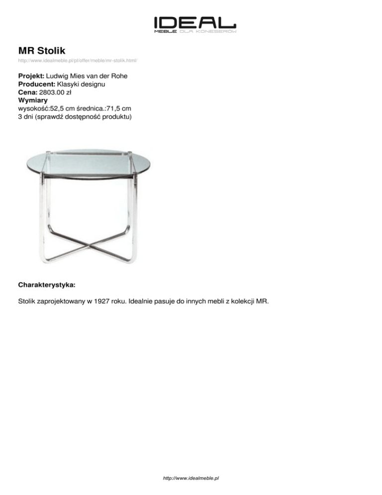 MR Stolik http://www.idealmeble.pl/pl/offer/meble/mr-stolik.html/ Projekt: Ludwig Mies van der Rohe Producent: Klasyki designu Cena: 2803.00 zł Wymiary wysokość:52,5 cm średnica.:71,5 cm 3 dni (sprawdź dostępność produktu) Charakterystyka: Stolik zaprojektowany w 1927 roku. Idealnie pasuje do innych mebli z kolekcji MR. http://www.idealmeble.pl http://www.idealmeble.pl Zdjęcia produktu: http://www.idealmeble.pl Powered by TCPDF (www.tcpdf.org)