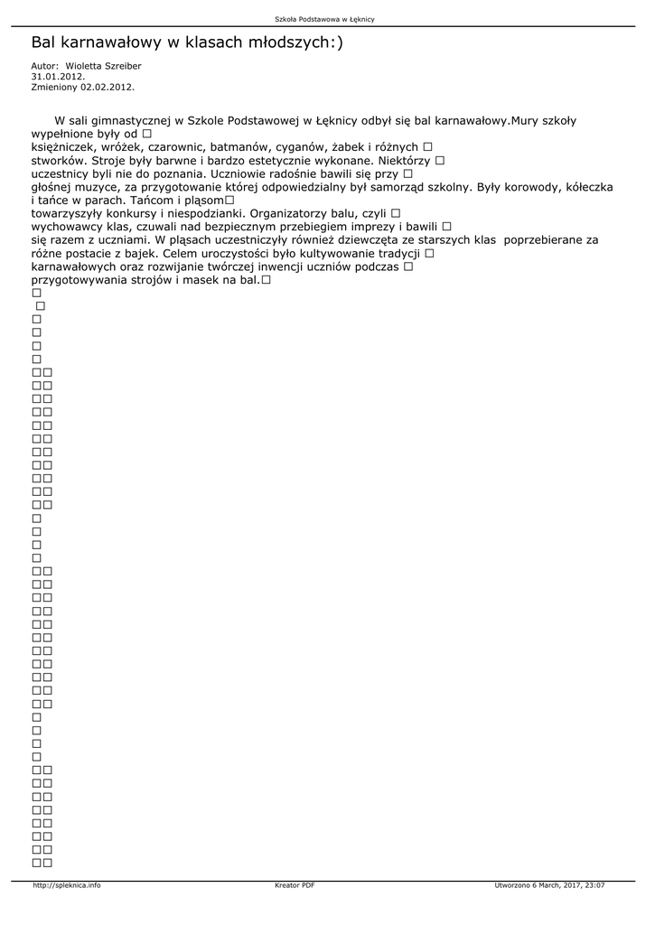 Szkoła Podstawowa w Łęknicy Bal karnawałowy w klasach młodszych:) Autor: Wioletta Szreiber 31.01.2012. Zmieniony 02.02.2012. W sali gimnastycznej w Szkole Podstawowej w Łęknicy odbył się bal karnawałowy.Mury szkoły wypełnione były od księżniczek, wróżek, czarownic, batmanów, cyganów, żabek i różnych stworków. Stroje były barwne i bardzo estetycznie wykonane. Niektórzy uczestnicy byli nie do poznania. Uczniowie radośnie bawili się przy głośnej muzyce, za przygotowanie której odpowiedzialny był samorząd szkolny. Były korowody, kółeczka i tańce w parach. Tańcom i pląsom towarzyszyły konkursy i niespodzianki. Organizatorzy balu, czyli wychowawcy klas, czuwali nad bezpiecznym przebiegiem imprezy i bawili się razem z uczniami. W pląsach uczestniczyły również dziewczęta ze starszych klas poprzebierane za różne postacie z bajek. Celem uroczystości było kultywowanie tradycji karnawałowych oraz rozwijanie twórczej inwencji uczniów podczas przygotowywania strojów i masek na bal. http://spleknica.info Kreator PDF Utworzono 6 March, 2017, 23:07 Szkoła Podstawowa w Łęknicy http://spleknica.info Kreator PDF Utworzono 6 March, 2017, 23:07
