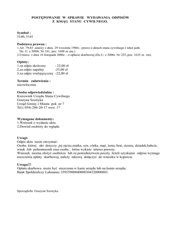POSTĘPOWANIE W SPRAWIE WYDAWANIA ODPISÓW Z KSIĄG STANU CYWILNEGO. Symbol : 5140, 5141 Podstawa prawna : 1.Art .79,83 ustawy z dnia 29 września 1986r.- prawo o aktach stanu cywilnego ( tekst jedn. Dz. U. z 2004r. Nr 161, poz. 1688 ze zm.) 2.Ustawa z dnia 16 listopada 2006r. - o opłacie skarbowej (Dz.U. z 2006r. Nr 225,.poz. 1635 ze zm) Opłaty: 1.za odpis skrócony - 22,00 zł 2.za odpis zupełny -33,00 zł 3.za odpis wielojęzyczny -22,00 zł Termin załatwienia : niezwłocznie Osoba odpowiedzialna : Kierownik Urzędu Stanu Cywilnego Grażyna Szortyka Urząd Gminy i Miasta pok .nr 7 Tel.( 054) 286-20-17 wew. 17 Wymagane dokumenty: 1.Wniosek o wydanie aktu. 2.Dowód osobisty do wglądu Uwagi: Odpis aktu może otrzymać: Osoba której akt dotyczy ,jej ojciec,matka, syn, córka, mąż, żona, brat, siostra, dziadek,babcia, wnuk lub pełnomocnik oraz osoba , która wykaże interes prawny. Wniosek można złożyć osobiście lub za pośrednictwem poczty. Jeżeli uzyskanie odpisu wymaga uiszczenia opłaty skarbowej, należy takową dołączyć do wniosku w kopercie. Uwaga!!! Opłata skarbowa może być uiszczona w kasie urzędu lub na konto urzędu: Bank Spółdzielczy Lubraniec 25955900040000304320000003. Sporządziła: Grażyna Szortyka Lubraniec,dnia ........................................... .............................................................. (imię i nazwisko osoby wnoszącej podanie) ........................................................................... (miejsce zamieszkania) URZĄD STANY CYWILNEGO w ....................................................... WNIOSEK Proszę o wydanie odpisu skróconego/zupełnego/ aktu: /należy wypełnić pozycje pobieranego dokumentu/ URODZENIA : (imię i nazwisko rodowe ,data i miejsce urodzenia ) 1) ................................................................................................................................................. 2) ................................................................................................................................................. 3)................................................................................................................................................................................ MAŁŻEŃSTWA : (imię i nazwisko ,nazwisko rodowe -data i miejsce zawarcia małżeństwa) 1)..................................................................................................................................................... 2) .................................................................................................................................................... . 3) ......................................................................................................................................... ZGONU: ( imię i nazwisko -data i miejsce zgonu) 1).................................................................................................................................................... 2) .................................................................................................................................................... 3) ................................................................................................................................................... Dokument dotyczy mojej osoby /mojego (podać stopień pokrewieństwa)............................ i przeznaczony będzie do złożenia w sprawie :........................................................................ ....................................................................................................................................................... *niepotrzebne skreślić .............................................................. Miejsce na opłatę skarbową: -22zł odpis skrócony -33zł odpis zupełny . (podpis) USC.5141/ /2008 data wpływu............................................................. +opłata skarbowa w wysk.zł.....................................