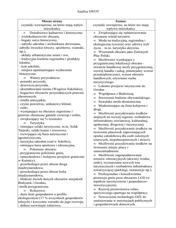 Analiza SWOT Mocne strony czynniki wewnętrzne, na które mają wpływ mieszkańcy • Dziedzictwo kulturowe i historyczne: - wielokulturowość obszaru, - bogaty zarys historyczny, - zabytki sakralne i architektura drewniana, zabytki świeckie (dwory, spichlerze, wiatraki, itp.), - układy urbanistyczne miast i wsi, - tradycyjna kuchnia regionalna i produkty lokalne, - koń sokólski, - miejsca upamiętniające wydarzenia historyczne. • Walory przyrodnicze: - pomniki przyrody, - dziewicza przyroda, - ukształtowanie terenu (Wzgórza Sokólskie), - bogactwo obszarów przyrodniczych prawnie chronionych, - źródła artezyjskie, - czyste powietrze, unikatowy klimat, - rzeki, - występujące na obszarze zagrożone i prawnie chronione gatunki zwierząt i roślin, - zwiększający się % lesistości. • Turystyka: - istniejące szlaki turystyczne, m.in. Szlak Tatarski, szlaki konne i rowerowe, - rozwijająca się baza turystyczna i agroturystyczna, - turystyka sakralna (cud w Sokółce), - istniejąca baza sportowa i rekreacyjna, • Położenie obszaru: - przygraniczne położenie gmin, - samochodowe i kolejowe przejście graniczne w Kuźnicy), - przechodząca przez obszar droga międzynarodowa, - przechodząca przez obszar kolej międzynarodowa, - bliskość dwóch dużych obszarów miejskich Białystok i Grodno, -strefa przygraniczna. • Rolnictwo: - duża ilość gospodarstw o profilu ekologicznym (17 % wszystkich gospodarstw rolnych) i korzystne warunki do jego rozwoju, - dobrze rozwinięte rolnictwo, Szanse czynniki zewnętrzne, na które nie mają wpływu mieszkańcy • Zwiększające się zainteresowanie obszarem wśród turystów. • Moda na tradycyjną, regionalną i ekologiczną żywność oraz zdrowy tryb życia – m.in. turystyka aktywna. • Wizerunek obszaru jako Zielonych Płuc Polski. • Możliwości wynikające z przygranicznej lokalizacji obszaru otwarcie handlowej strefy przygranicznej, rozwój handlu i usług, potencjalny wzrost przedsiębiorczości, wzrost obrotów handlowych, ożywienie ruchu turystycznego. • Lokalne przejście turystyczne do Grodna. • Współpraca z Białorusią. • Stworzenie budżetu obywatelskiego. • Suwalska strefa ekonomiczna. • Modernizująca się linia kolejowa i drogi. • Możliwość pozyskiwania środków unijnych na rozwój regionu: rozbudowa infrastruktury oświatowej, kulturalnej, społecznej, drogowej i turystycznej. • Możliwość pozyskiwania środków na tworzenie placówek zapewniających opiekę całodobową dla osób zależnych (starszych, niepełnosprawnych i dzieci). • Możliwość pozyskiwania środków na tworzenie miejsc pracy i samozatrudnienie. • Możliwość zagospodarowania terenów rekreacyjnych (akweny wodne, rzeki), wyznaczenie nowych tras turystycznych i rozbudowa infrastruktury towarzyszącej (parkingi, restauracje itp.). • Profesjonalna i konsekwentna promocja gmin poza obszarem LGD (w aspekcie turystycznym i gospodarczoinwestycyjnym). • Rozwój przetwórstwa rolnospożywczego opartego na współpracy. • Nowoczesne technologie OZE do zastosowania w instytucjach publicznych i gospodarstwach domowych. Analiza SWOT - gospodarstwa rolne od lat w rękach indywidualnych rolników (niewiele PGR-ów). • Społeczność: - uczciwi, rzetelni mieszkańcy, - otwarta, gościnna i tolerancyjna lokalna społeczność, -aktywna społeczność lokalna w Krynkach i Sokółce, - rozwijająca się działalność sektora organizacji pozarządowych i wolontariat Krynki i Sokółka, - rosnące doświadczenie wnioskodawców aplikujących o środki, - slow life, - przedsiębiorczy mieszkańcy, np. Kruszyniany. • Szkoły i edukacja: - dobrze wyposażone szkoły wiejskie w Sidrze, - wzrost poziomu wykształcenia mieszkańców. Słabe strony czynniki wewnętrzne, na które mają wpływ mieszkańcy • Turystyka: - zły stan zabytków, niska estetyka miejscowości, - niewystarczająca promocja regionu, niewykorzystanie potencjału turystycznego: brak materiałów promocyjnoinformacyjnych niewypromowane produkty lokalne, brak wspólnej identyfikacji wizualnej regionu - brak współpracy przygranicznej w zakresie turystyki, - niewystarczająco rozwinięta infrastruktura turystyczna: brak informacji turystycznej; brak wykwalifikowanych przewodników mogących oprowadzić turystów, brak inwentaryzacji obiektów; brak ścieżek rowerowych, zaniedbane lub niezagospodarowane rekreacyjne zbiorniki wodne; niewystarczająca baza noclegowa; za mało wypożyczalni rowerów; • Stworzenie infrastruktury służącej integracji i promocji społeczności lokalnej „sali wystawowo-konferencyjnointegracyjnej” dla spotkań promujących i integrujących społeczność lokalną. Zagrożenia czynniki zewnętrzne, na które nie mają wpływu mieszkańcy • Zła polityka rządu wobec samorządu i rolnictwa. • Obciążenia firm (ZUS), wysoki poziom fiskalizmu i skomplikowane procedury prowadzenia działalności. • Częste zmiany w przepisach podatkowych i prawnych. • Niedostosowanie polskich przepisów do prawodawstwa. • Brak warunków do rozwoju przedsiębiorczości (ulgi podatkowe) • Niestabilne ceny produktów takich jak opał, paliwo, energia. • Ograniczenia wynikające z istniejących obszarów ochronnych. • Utrudnienia w ruchu granicznym. • Niewystarczające wsparcie finansowe organizacji pozarządowych. • Niekontrolowany handel używkami (przemyt z Białorusi). • Zwiększający się ruch ciężarowy na niedostosowanych drogach. • Zanieczyszczenie środowiska (wysypisko śmieci) i degradacja krajobrazu Analiza SWOT słabe oznakowanie szlaków i słaba infrastruktura towarzysząca. • Położenie obszaru, komunikacja: - zły stan infrastruktury drogowej, słaba dostępność komunikacyjna (PKP, PKS) i transportowa, - brak dostępu do Internetu i sieci telekomunikacyjnej w miejscowościach peryferyjnych. • Gospodarka, rolnictwo i rynek pracy: - słabo zróżnicowana i słabo rozwinięta gospodarka, przem