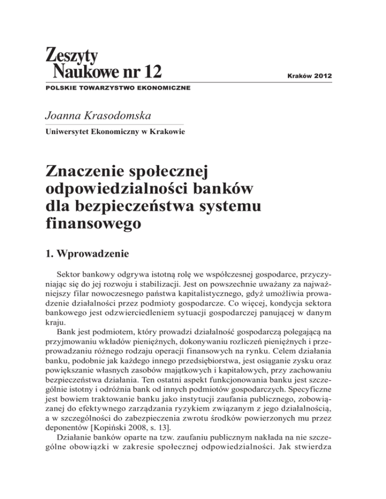 Zeszyty Naukowe nr 12 Kraków 2012 POLSKIE TOWARZYSTWO EKONOMICZNE Joanna Krasodomska Uniwersytet Ekonomiczny w Krakowie Znaczenie społecznej odpowiedzialności banków dla bezpieczeństwa systemu finansowego 1. Wprowadzenie Sektor bankowy odgrywa istotną rolę we współczesnej gospodarce, przyczyniając się do jej rozwoju i stabilizacji. Jest on powszechnie uważany za najważniejszy filar nowoczesnego państwa kapitalistycznego, gdyż umożliwia prowadzenie działalności przez podmioty gospodarcze. Co więcej, kondycja sektora bankowego jest odzwierciedleniem sytuacji gospodarczej panującej w danym kraju. Bank jest podmiotem, który prowadzi działalność gospodarczą polegającą na przyjmowaniu wkładów pieniężnych, dokonywaniu rozliczeń pieniężnych i przeprowadzaniu różnego rodzaju operacji finansowych na rynku. Celem działania banku, podobnie jak każdego innego przedsiębiorstwa, jest osiąganie zysku oraz powiększanie własnych zasobów majątkowych i kapitałowych, przy zachowaniu bezpieczeństwa działania. Ten ostatni aspekt funkcjonowania banku jest szczególnie istotny i odróżnia bank od innych podmiotów gospodarczych. Specyficzne jest bowiem traktowanie banku jako instytucji zaufania publicznego, zobowiązanej do efektywnego zarządzania ryzykiem związanym z jego działalnością, a w szczególności do zabezpieczenia zwrotu środków powierzonych mu przez deponentów [Kopiński 2008, s. 13]. Działanie banków oparte na tzw. zaufaniu publicznym nakłada na nie szczególne obowiązki w zakresie społecznej odpowiedzialności. Jak stwierdza 152 Joanna Krasodomska D. Korenik [2009a, s. 269]: „(…) banki swymi działaniami i oddziaływaniem na otoczenie mogą pomóc w ograniczaniu lub przeciwnie – wzmagać narastanie tzw. kluczowych problemów społeczno-ekonomicznych, nękających współczesne społeczeństwa (…)”. Zagadnienie społecznej odpowiedzialności banków jest problemem szeroko poruszanym w kontekście światowego kryzysu ekonomicznego, który w dużym stopniu jest wynikiem braku tej odpowiedzialności [Egzamin… 2008, s. 14; Społeczna odpowiedzialność… 2009, s. 7, 19, 37, 45; Achum, Borlea i Breban 2010, s. 60–61; Korenik 2011, s. 22–41; Juan 2011, s. 152]. W przypadku sektora finansowego zaufanie i dobra reputacja mają kluczowe znaczenie dla długoterminowego sukcesu. Jak łatwo można je utracić, dowiódł ostatni kryzys, będący przyczyną spektakularnych klęsk renomowanych instytucji finansowych, takich jak Citigroup, UBS, Merrill Lynch, Lehman Brothers, Goldman Sachs czy Morgan Stanley. Według Komisji Europejskiej odzyskanie utraconego w dobie kryzysu zaufania ma nastąpić poprzez przyjęcie przez podmioty dodatkowych obowiązków w ramach społecznej odpowiedzialności biznesu. Do końca 2014 r. wszystkie duże firmy europejskie mają zobowiązać się do przestrzegania wytycznych w tym zakresie opracowanych przez OECD, UN Global Compact lub zawartych w normach ISO 26000 [CSR… 2012]. Unia Europejska zwraca także uwagę na istotną rolę społecznej odpowiedzialności w realizacji strategii „Europa 2020” ukierunkowanej na osiągnięcie inteligentnego, zrównoważonego wzrostu gospodarczego, w tym w walce z bezrobociem będącym następstwem kryzysu [Komunikat… 2011, s. 4]. Jak pisze B. Rok [Egzamin… 2008, s. 14]: „(…) rozwój organizacji, która np. dostarcza innowacyjne rozwiązania z obszaru bankowości, jest potrzebny nie tylko po to, aby akcjonariusze mogli mieć wyższą dywidendę, a menedżerowie wyższe wynagrodzenia. Taka organizacja powinna koncentrować się na tym, co jest społecznie najważniejsze i jednocześnie ekonomicznie uzasadnione (…). W efekcie korzyść odnieść mogą wszyscy”. Celem artykułu jest przybliżenie specyfiki społecznej odpowiedzialności banku komercyjnego oraz wskazanie jej znaczenia dla odbudowy bezpiecznego systemu finansowego. 2. Społeczna odpowiedzialność jako wyraz służebnej roli banku w gospodarce Od początków funkcjonowania banków do ich obowiązków względem klientów i pozostałych podmiotów znajdujących się w ich otoczeniu należy bezpieczeństwo działania, istotne nie tylko dla deponentów, ale i dla stabilności całej Znaczenie społecznej odpowiedzialności banków... 153 gospodarki. W ostatnich latach zaczęto zwracać uwagę także na inne aspekty społecznego zaangażowania banków, takie jak: etyka funkcjonowania, reagowanie na potrzeby lokalnej społeczności, przejrzystość raportowania, dbanie o rozwój i satysfakcję pracowników. Wszystkie te działania wpisane w realizowaną przez bank strategię mają szansę przełożyć się na jego przyszłe wyniki finansowe, budując również jego pozytywny wizerunek. Należy bowiem podkreślić, że dobra reputacja ma szczególnie istotne znaczenie w przypadku funkcjonowania banków. Oferują one bowiem produkty trudne do odróżnienia przez przeciętnego konsumenta, stąd wizerunek banku, który dany produkt oferuje, jest bardzo ważny [Szpringer 2009, s. 114, 118]. Z przedstawionymi powyżej aspektami funkcjonowania banków wiąże się koncepcja społecznej odpowiedzialności przedsiębiorstw (Corporate Social Responsibility – CSR). Oznacza ona odpowiedzialność banku za wpływ podjętych przez niego decyzji i działań na społeczeństwo i środowisko, przejawiającą się w przejrzystym i etycznym zachowaniu, które: – przyczynia się do zrównoważonego rozwoju, w tym zdrowia i dobrobytu społeczeństwa, – bierze pod uwagę oczekiwania interesariuszy, – jest zgodne z obowiązującym prawem i spójne z międzynarodowymi normami zachowania, – jest zintegrowane z bankiem i praktykowane w jego relacjach [ISO 26000… 2010]. W literaturze przypisuje się bankom podwójną rolę do spełnienia w gospodarce i społeczeństwie – komercyjną i służebną. Rola komercyjna polega na postrzeganiu banku jako przedsiębiorstwa funkcjonującego w gospodarce rynkowej, dział