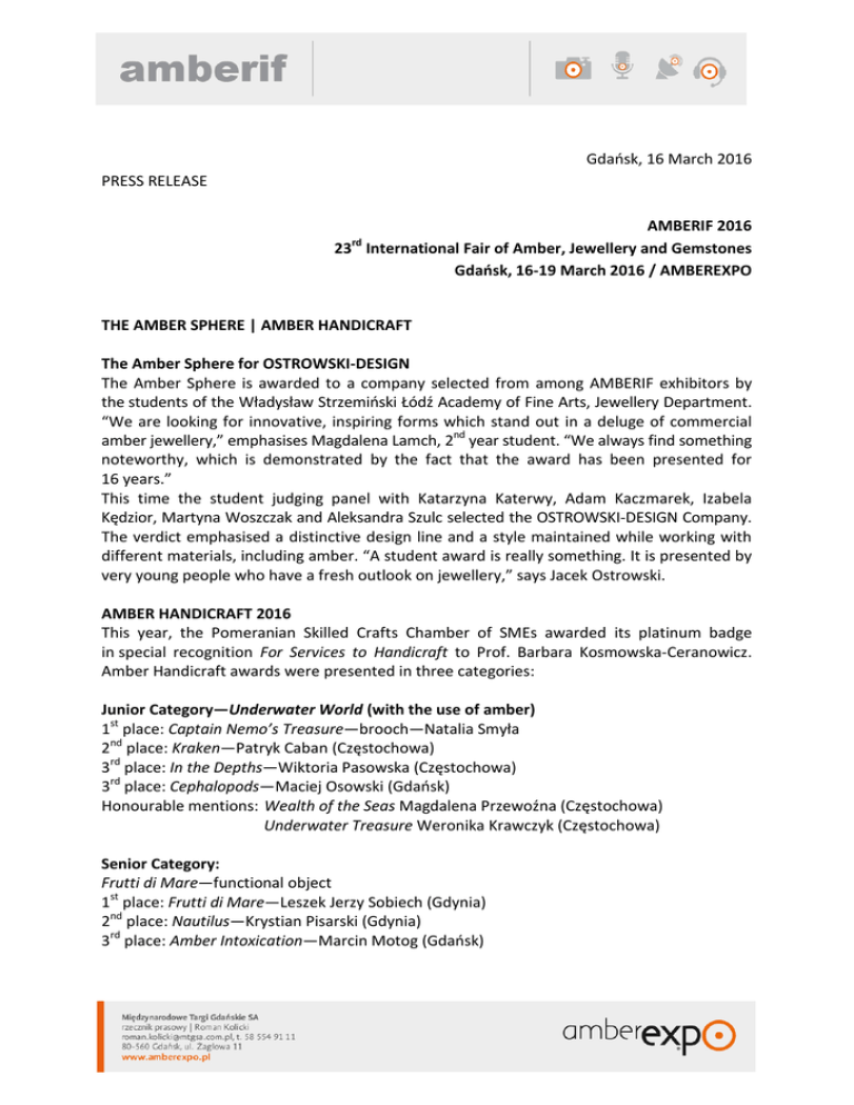 Gdańsk, 16 March 2016 PRESS RELEASE AMBERIF 2016 23 International Fair of Amber, Jewellery and Gemstones Gdańsk, 16-19 March 2016 / AMBEREXPO rd THE AMBER SPHERE | AMBER HANDICRAFT The Amber Sphere for OSTROWSKI-DESIGN The Amber Sphere is awarded to a company selected from among AMBERIF exhibitors by the students of the Władysław Strzemiński Łódź Academy of Fine Arts, Jewellery Department. “We are looking for innovative, inspiring forms which stand out in a deluge of commercial amber jewellery,” emphasises Magdalena Lamch, 2nd year student. “We always find something noteworthy, which is demonstrated by the fact that the award has been presented for 16 years.” This time the student judging panel with Katarzyna Katerwy, Adam Kaczmarek, Izabela Kędzior, Martyna Woszczak and Aleksandra Szulc selected the OSTROWSKI-DESIGN Company. The verdict emphasised a distinctive design line and a style maintained while working with different materials, including amber. “A student award is really something. It is presented by very young people who have a fresh outlook on jewellery,” says Jacek Ostrowski. AMBER HANDICRAFT 2016 This year, the Pomeranian Skilled Crafts Chamber of SMEs awarded its platinum badge in special recognition For Services to Handicraft to Prof. Barbara Kosmowska-Ceranowicz. Amber Handicraft awards were presented in three categories: Junior Category—Underwater World (with the use of amber) 1st place: Captain Nemo’s Treasure—brooch—Natalia Smyła 2nd place: Kraken—Patryk Caban (Częstochowa) 3rd place: In the Depths—Wiktoria Pasowska (Częstochowa) 3rd place: Cephalopods—Maciej Osowski (Gdańsk) Honourable mentions: Wealth of the Seas Magdalena Przewoźna (Częstochowa) Underwater Treasure Weronika Krawczyk (Częstochowa) Senior Category: Frutti di Mare—functional object 1st place: Frutti di Mare—Leszek Jerzy Sobiech (Gdynia) 2nd place: Nautilus—Krystian Pisarski (Gdynia) 3rd place: Amber Intoxication—Marcin Motog (Gdańsk) Amber Route Jewellery—jewellery 1st place: Little Egg—pendant—Paweł Rojewski (Warsaw) 2nd place: Amber Artist’s Navigator—Agnieszka Mroczkowska (Gdynia) 3rd place: Gdańsk Atrium—Dawid Krzysteczko (Chorzów) Honourable mention: Ambra monamour—Kornel Krajewski (Gdynia) AMBERIF 2016 | www.amberif.pl 18 March, 10:00–18:00 19 March, 10:00–17:00 AMBEREXPO | ul. Żaglowa 11, Gdańsk, Poland ORGANISED BY MTG SA Gdańsk International Fair Co. CONTACT FOR THE MEDIA AMBERIF Project Director: Ewa Rachoń [email protected] | t. +48 58 55 49 134