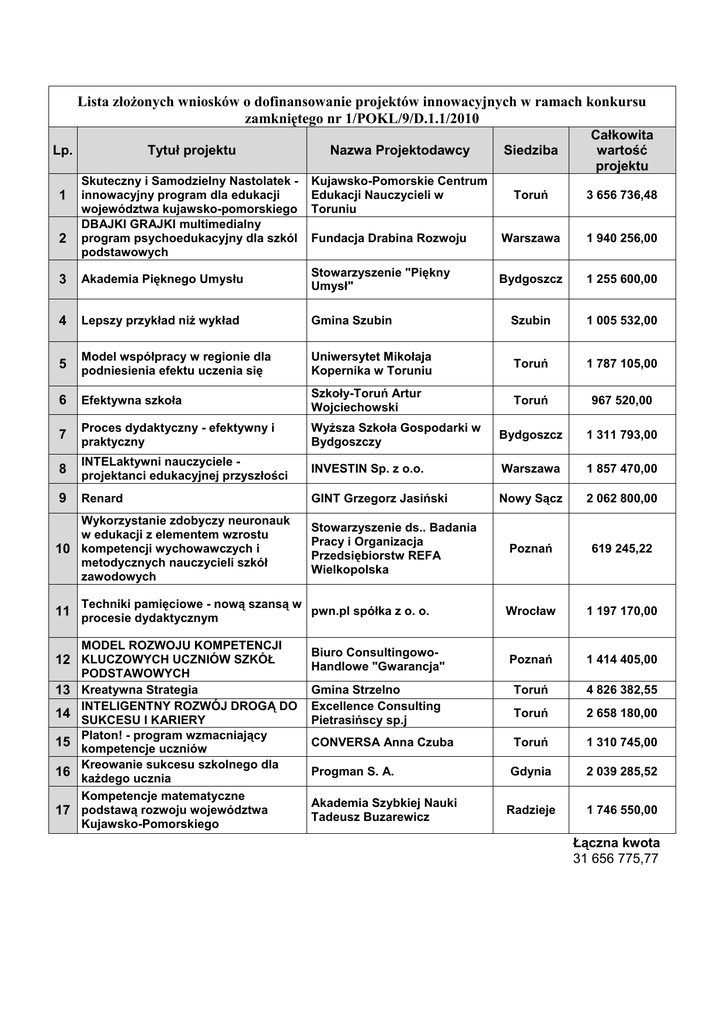 Lista złoŜonych wniosków o dofinansowanie projektów innowacyjnych w ramach konkursu zamkniętego nr 1/POKL/9/D.1.1/2010 Tytuł projektu Nazwa Projektodawcy Siedziba Całkowita wartość projektu Skuteczny i Samodzielny Nastolatek innowacyjny program dla edukacji województwa kujawsko-pomorskiego DBAJKI GRAJKI multimedialny program psychoedukacyjny dla szkól podstawowych Kujawsko-Pomorskie Centrum Edukacji Nauczycieli w Toruniu Toruń 3 656 736,48 Fundacja Drabina Rozwoju Warszawa 1 940 256,00 Bydgoszcz 1 255 600,00 Lp. 1 2 3 Akademia Pięknego Umysłu Stowarzyszenie "Piękny Umysł" 4 Lepszy przykład niŜ wykład Gmina Szubin Szubin 1 005 532,00 5 Model współpracy w regionie dla podniesienia efektu uczenia się Uniwersytet Mikołaja Kopernika w Toruniu Toruń 1 787 105,00 6 Efektywna szkoła Szkoły-Toruń Artur Wojciechowski Toruń 967 520,00 7 Proces dydaktyczny - efektywny i praktyczny WyŜsza Szkoła Gospodarki w Bydgoszczy Bydgoszcz 1 311 793,00 8 INTELaktywni nauczyciele projektanci edukacyjnej przyszłości INVESTIN Sp. z o.o. Warszawa 1 857 470,00 9 Renard GINT Grzegorz Jasiński Nowy Sącz 2 062 800,00 Stowarzyszenie ds.. Badania Pracy i Organizacja Przedsiębiorstw REFA Wielkopolska Poznań 619 245,22 pwn.pl spółka z o. o. Wrocław 1 197 170,00 Biuro ConsultingowoHandlowe "Gwarancja" Poznań 1 414 405,00 Toruń 4 826 382,55 Toruń 2 658 180,00 CONVERSA Anna Czuba Toruń 1 310 745,00 Progman S. A. Gdynia 2 039 285,52 Radzieje 1 746 550,00 Wykorzystanie zdobyczy neuronauk w edukacji z elementem wzrostu 10 kompetencji wychowawczych i metodycznych nauczycieli szkół zawodowych Techniki pamięciowe - nową szansą w 11 procesie dydaktycznym MODEL ROZWOJU KOMPETENCJI 12 KLUCZOWYCH UCZNIÓW SZKÓŁ 13 14 15 16 17 PODSTAWOWYCH Kreatywna Strategia INTELIGENTNY ROZWÓJ DROGĄ DO SUKCESU I KARIERY Platon! - program wzmacniający kompetencje uczniów Kreowanie sukcesu szkolnego dla kaŜdego ucznia Kompetencje matematyczne podstawą rozwoju województwa Kujawsko-Pomorskiego Gmina Strzelno Excellence Consulting Pietrasińscy sp.j Akademia Szybkiej Nauki Tadeusz Buzarewicz Łączna kwota 31 656 775,77