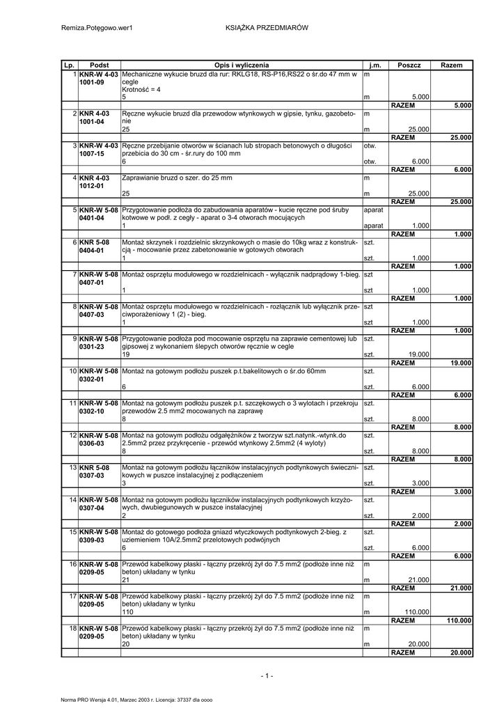 Remiza.Potęgowo.wer1 KSIĄŻKA PRZEDMIARÓW Lp. Podst Opis i wyliczenia 1 KNR-W 4-03 Mechaniczne wykucie bruzd dla rur: RKLG18, RS-P16,RS22 o śr.do 47 mm w cegle 1001-09 Krotność = 4 5 2 KNR 4-03 1001-04 Ręczne wykucie bruzd dla przewodow wtynkowych w gipsie, tynku, gazobetonie 25 j.m. m m m otw. 4 KNR 4-03 1012-01 Zaprawianie bruzd o szer. do 25 mm m 25 m 6 KNR 5-08 0404-01 otw. aparat 7 KNR-W 5-08 Montaż osprzętu modułowego w rozdzielnicach - wyłącznik nadprądowy 1-bieg. szt 0407-01 1 szt 8 KNR-W 5-08 Montaż osprzętu modułowego w rozdzielnicach - rozłącznik lub wyłącznik prze- szt ciwporażeniowy 1 (2) - bieg. 0407-03 1 szt 10 KNR-W 5-08 Montaż na gotowym podłożu puszek p.t.bakelitowych o śr.do 60mm 0302-01 6 13 KNR 5-08 0307-03 szt. szt. 25.000 6.000 RAZEM 6.000 25.000 RAZEM 25.000 1.000 RAZEM 1.000 1.000 RAZEM 1.000 1.000 RAZEM 1.000 1.000 RAZEM 1.000 19.000 RAZEM 19.000 6.000 RAZEM 6.000 8.000 RAZEM 8.000 8.000 RAZEM 8.000 3.000 RAZEM 3.000 2.000 RAZEM 2.000 6.000 RAZEM 6.000 21.000 RAZEM 21.000 110.000 RAZEM 110.000 20.000 RAZEM 20.000 szt. szt. 14 KNR-W 5-08 Montaż na gotowym podłożu łączników instalacyjnych podtynkowych krzyżowych, dwubiegunowych w puszce instalacyjnej 0307-04 2 szt. 15 KNR-W 5-08 Montaż do gotowego podłoża gniazd wtyczkowych podtynkowych 2-bieg. z uziemieniem 10A/2.5mm2 przelotowych podwójnych 0309-03 6 szt. 16 KNR-W 5-08 Przewód kabelkowy płaski - łączny przekrój żył do 7.5 mm2 (podłoże inne niż beton) układany w tynku 0209-05 21 m 17 KNR-W 5-08 Przewód kabelkowy płaski - łączny przekrój żył do 7.5 mm2 (podłoże inne niż beton) układany w tynku 0209-05 110 m 18 KNR-W 5-08 Przewód kabelkowy płaski - łączny przekrój żył do 7.5 mm2 (podłoże inne niż beton) układany w tynku 0209-05 20 m Norma PRO Wersja 4.01, Marzec 2003 r. Licencja: 37337 dla oooo 25.000 RAZEM szt. Montaż na gotowym podłożu łączników instalacyjnych podtynkowych świeczni- szt. kowych w puszce instalacyjnej z podłączeniem 3 szt. -1- 5.000 szt. 11 KNR-W 5-08 Montaż na gotowym podłożu puszek p.t. szczękowych o 3 wylotach i przekroju szt. przewodów 2.5 mm2 mocowanych na zaprawę 0302-10 8 szt. 12 KNR-W 5-08 Montaż na gotowym podłożu odgałęźników z tworzyw szt.natynk.-wtynk.do 2.5mm2 przez przykręcenie - przewód wtynkowy 2.5mm2 (4 wyloty) 0306-03 8 5.000 RAZEM aparat Montaż skrzynek i rozdzielnic skrzynkowych o masie do 10kg wraz z konstruk- szt. cją - mocowanie przez zabetonowanie w gotowych otworach 1 szt. 9 KNR-W 5-08 Przygotowanie podłoża pod mocowanie osprzętu na zaprawie cementowej lub gipsowej z wykonaniem ślepych otworów ręcznie w cegle 0301-23 19 Razem m 3 KNR-W 4-03 Ręczne przebijanie otworów w ścianach lub stropach betonowych o długości przebicia do 30 cm - śr.rury do 100 mm 1007-15 6 5 KNR-W 5-08 Przygotowanie podłoża do zabudowania aparatów - kucie ręczne pod śruby kotwowe w podł. z cegły - aparat o 3-4 otworach mocujących 0401-04 1 Poszcz szt. szt. m m m Remiza.Potęgowo.wer1 KSIĄŻKA PRZEDMIARÓW Lp. Podst Opis i wyliczenia 19 KNR-W 5-08 Przewód kabelkowy płaski - łączny przekrój żył do 7.5 mm2 (podłoże inne niż beton) układany w tynku 0209-05 65 j.m. m m 20 KNR-W 5-08 Przewody kabelkowe o łącznym przekroju żył do 30 mm2 układane w gotowych m bruzdach na podłożu innym niż beton 0210-03 4 m 21 KNR 5-08 0502-03 22 KNR 5-08 0515-01 Przygotowanie podłoża pod oprawy oświetleniowe przykręcane na gipsie, gazo- kpl. betonie mocowane na kołkach plast. (il.mocowań 2) 8 kpl. Montaż z podłączeniem na gotowym podłożu opraw świetlówkowych do oświet- szt. lenia pomieszczeń przemysłowych-oprawy strugo-,pyłoodporne, pyłoszczelne w obudowie metalowej z odbłyśnikiem-zawieszane końcowe-2x40W 8 szt. 23 KNR-W 4-03 Pierwszy pomiar rezystancji izolacji instalacji elektrycznych w obwodzie 1-fazo- pomiar wym 1208-01 2 pomiar 24 KNR-W 4-03 Sprawdzenie i pomiar kompletnego 2,3-fazowego obwodu elektrycznego niskiego napięcia 1202-02 1 pomiar. 25 KNR-W 4-03 Sprawdzenie samoczynnego wyłączenia zasilania - pierwsza próba działania wyłącznika różnicowoprądowego 1209-01 1 prób. 26 KNR-W 4-03 Następny pomiar skutecznosci zerowania 1205-06 8 pomiar. prób. pomiar. -2- Norma PRO Wersja 4.01, Marzec 2003 r. Licencja: 37337 dla oooo pomiar. Poszcz Razem 65.000 RAZEM 65.000 4.000 RAZEM 4.000 8.000 RAZEM 8.000 8.000 RAZEM 8.000 2.000 RAZEM 2.000 1.000 RAZEM 1.000 1.000 RAZEM 1.000 8.000 RAZEM 8.000