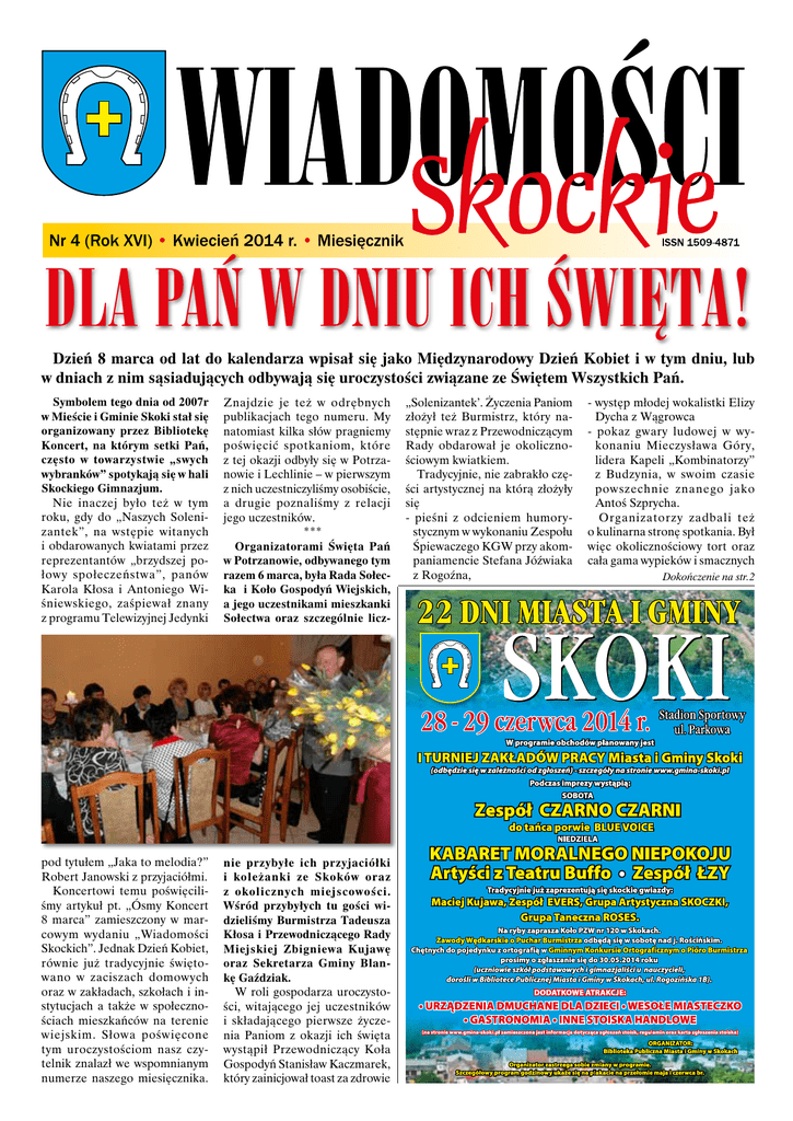 Nr 4 (Rok XVI) • Kwiecień 2014 r. • Miesięcznik dla pań w dniu ich święta! Dzień 8 marca od lat do kalendarza wpisał się jako Międzynarodowy Dzień Kobiet i w tym dniu, lub w dniach z nim sąsiadujących odbywają się uroczystości związane ze Świętem Wszystkich Pań. Symbolem tego dnia od 2007r w Mieście i Gminie Skoki stał się organizowany przez Bibliotekę Koncert, na którym setki Pań, często w towarzystwie „swych wybranków” spotykają się w hali Skockiego Gimnazjum. Nie inaczej było też w tym roku, gdy do „Naszych Solenizantek”, na wstępie witanych i obdarowanych kwiatami przez reprezentantów „brzydszej połowy społeczeństwa”, panów Karola Kłosa i Antoniego Wiśniewskiego, zaśpiewał znany z programu Telewizyjnej Jedynki Znajdzie je też w odrębnych publikacjach tego numeru. My natomiast kilka słów pragniemy poświęcić spotkaniom, które z tej okazji odbyły się w Potrzanowie i Lechlinie – w pierwszym z nich uczestniczyliśmy osobiście, a drugie poznaliśmy z relacji jego uczestników. *** Organizatorami Święta Pań w Potrzanowie, odbywanego tym razem 6 marca, była Rada Sołecka i Koło Gospodyń Wiejskich, a jego uczestnikami mieszkanki Sołectwa oraz szczególnie licz- pod tytułem „Jaka to melodia?” Robert Janowski z przyjaciółmi. Koncertowi temu poświęciliśmy artykuł pt. „Ósmy Koncert 8 marca” zamieszczony w marcowym wydaniu „Wiadomości Skockich”. Jednak Dzień Kobiet, równie już tradycyjnie świętowano w zaciszach domowych oraz w zakładach, szkołach i instytucjach a także w społecznościach mieszkańców na terenie wiejskim. Słowa poświęcone tym uroczystościom nasz czytelnik znalazł we wspomnianym numerze naszego miesięcznika. nie przybyłe ich przyjaciółki i koleżanki ze Skoków oraz z okolicznych miejscowości. Wśród przybyłych tu gości widzieliśmy Burmistrza Tadeusza Kłosa i Przewodniczącego Rady Miejskiej Zbigniewa Kujawę oraz Sekretarza Gminy Blankę Gaździak. W roli gospodarza uroczystości, witającego jej uczestników i składającego pierwsze życzenia Paniom z okazji ich święta wystąpił Przewodniczący Koła Gospodyń Stanisław Kaczmarek, który zainicjował toast za zdrowie „Solenizantek’. Życzenia Paniom złożył też Burmistrz, który następnie wraz z Przewodniczącym Rady obdarował je okolicznościowym kwiatkiem. Tradycyjnie, nie zabrakło części artystycznej na którą złożyły się - pieśni z odcieniem humorystycznym w wykonaniu Zespołu Śpiewaczego KGW przy akompaniamencie Stefana Jóźwiaka z Rogoźna, - występ młodej wokalistki Elizy Dycha z Wągrowca - pokaz gwary ludowej w wykonaniu Mieczysława Góry, lidera Kapeli „Kombinatorzy” z Budzynia, w swoim czasie powszechnie znanego jako Antoś Szprycha. Organizatorzy zadbali też o kulinarna stronę spotkania. Był więc okolicznościowy tort oraz cała gama wypieków i smacznych Dokończenie na str.2 2 Dokończenie ze str.1 potraw, które z wdziękiem do stołu serwowali panowie: Michał Bochyński, Rafał Nowak, Krzesimir Kaczmarek, Paweł Bochyński i Krzysztof Bochyński. Burmistrz Miasta i Gminy Skoki oraz Związek Międzygminny “Puszcza Zielonka” mają zaszczyt zaprosić na IV Noc Kościołów Drewnianych 16 maj (piątek) 2014 18.00 koncert Zespołu JRM - w celtyckim klimacie św. Patryka kościół pw. Św. Mikołaja Biskupa w SKOKACH Dopełnieniem Święta Pań w Potrzanowie była zabawa taneczna, która przeciągnęła się do wczesnych godzin kolejnego marcowego dnia. *** Inicjatorem uroczystości w Lechlinie była Rada Sołecka, która w dniu siódmego marca wszystkie Panie zaprosiła do pięknie odrestaurowanej świetlicy Rolniczej Spółdzielni Produkcyjnej na wieczór przy kawie i słodkościach. Szczególnymi gośćmi uroczystości byli współmieszkańcy „lechliniaków”: Zastępca Przewodniczącego Rady Powiatu Wągrowieckiego Grzegorz Owczarzak z małżonką oraz Komendant Gminny Ochotniczej Straży Pożarnej Skokach Marek Gramza. Z zaproszenia organizatorów skorzystali również i wraz z mieszkańcami Dzień Kobiet świętowali, znani i lubiani już w Lechlinie członkowie Emeryckiego Zespołu Śpiewaczego „Harfa” pod dyrekcją Antoniego Wiśniewskiego. Po oficjalnym powitaniu i złożeniu paniom życzeń przez sołtysa Pawła Grabińskiego i życzeniach od Panów Owczarzaka i Gramzy oraz odśpiewaniu przez męskich uczestników spotkania wiązanki „Sto lat dla Pań”, „Solenizantki” zostały obdarowane pięknym tulipanami i słodkim upominkiem. W trakcie uroczystości odczytano też życzenia przekazane dla uczestniczek spotkania od przebywającej na 20.00 koncert Grzegorza Kloca kościół w SŁAWNIE 22.00 koncert Moniki Kuszyńskiej kościół w WĘGLEWIE ORGANIZATOR: szczegółowy program na www.puszcza-zielonka.pl Burmistrz Miasta i Gminy Skoki oraz Związek Miedzygminny “Puszcza Zielonka” zapraszają na XI RAJD PUSZCZA WPUSZCZA 18 MAJA 2014 (niedziela) META RAJDU - Targowisko w Skokach TRASA ROWEROWA RAJDU: SKOCKA PĘTELKA ok. 30 km, start godz. 10.00 - Targowisko w Skokach, TRASY NORDIC WALKING RAJDU: wokół jez. Rościńskiego - ok 8 km: TRASA REKREACYJNA: start godz. 10.00 - Targowisko w Skokach, TRASA SPORTOWA: start godz. 10.30 - Targowisko w Skokach, Udział w Rajdzie jest nieodpłatny egzaminach w Poznaniu radnej Rady Miejskiej w Skokach Małgorzaty Zaganiaczyk. Świąteczny nastrój uroczystości podkreślały też piosenki i pieśni w wykonaniu „Harfy”, w tym znane pieśni biesiadne, miedzy innymi: „Marianna” „Cicha woda” i :”Serca dwa”, które do wspólnego śpiewu wciągnęły wszystkich uczestników. Dzień Kobiet w Lechlinie, który stał się kolejnym spotkaniem integracyjnym mieszkańców i „śpiewaków „Harfy””, był możliwy dzięki sponsorującym go: Monice Bielawskiej z Wągrowca oraz Krzysztofowi Migasiewiczowi i Janowi Dziurce ze Skoków, którym w tym miejscu za naszym pośrednictwem dziękują