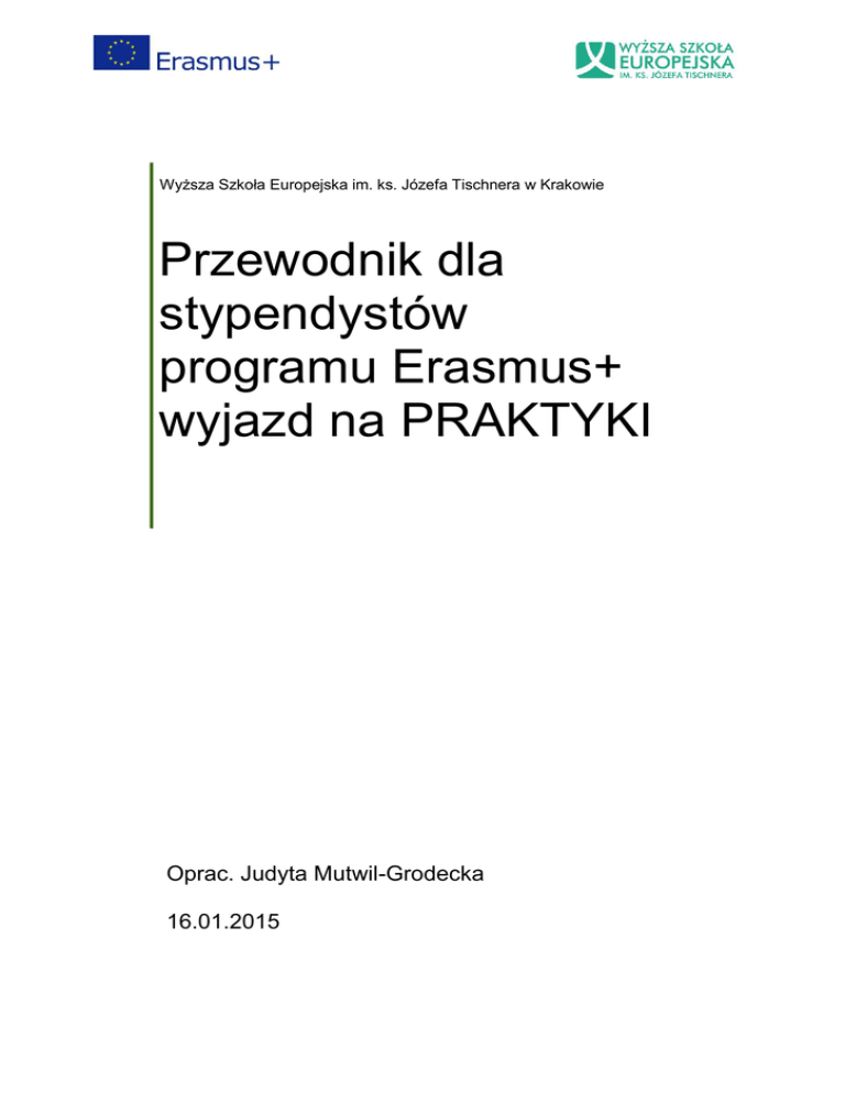 Wyższa Szkoła Europejska im. ks. Józefa Tischnera w Krakowie Przewodnik dla stypendystów programu Erasmus+ wyjazd na PRAKTYKI Oprac. Judyta Mutwil-Grodecka 16.01.2015 Spis treści A. Procedura komunikacji Student-Koordynator programu Erasmus+ WSE ..........................................................................3 B. Formalności przedwyjazdowe ................................................4 C. Zaliczenie stypendium ...........................................................6 D. Checklista ..............................................................................7 E. Pakiet dokumentów stypendysty programu Erasmus+ ........13 2 Przewodnik dla stypendystów programu Erasmus+ A. Procedura komunikacji Student-Koordynator programu Erasmus+ WSE 1. Ustalenie przebiegu komunikacji między Studentem, Koordynatorem programu Erasmus+ w Wyższej Szkole Europejskiej a opiekunem praktyki, m.in.: a. dodawanie adresu e-mail Koordynatora Erasmus+ WSE do wiadomości przesyłanych do instytucji partnerskiej, b. informowanie o odpowiedziach ze strony instytucji partnerskiej. 2. System korespondencji Studenta z Koordynatorem Erasmus+ WSE – na zasadzie odpowiedzi na poprzedniego maila, a nie tworzenia nowej wiadomości. 3. Spotkania Studenta z Koordynatorem Erasmus+ WSE: a. Po rekrutacji – obowiązek spotkania w tygodniu bezpośrednio po ogłoszeniu wyników rekrutacji. Możliwość przesunięcia terminu (ale nie dłużej niż do dwóch tygodni po ogłoszeniu wyników rekrutacji) na wyraźną prośbę Studenta. W trakcie spotkania m.in.: i. Omówienie Checklisty i innych dokumentów mówiących o prawach i obowiązkach Studentów przed, podczas i po stypendium. ii. Zebranie podpisów Studenta gwarantujących zapoznanie się Studenta z ww. dokumentami. b. Przed wyjazdem – obowiązek spotkania 2-3 tygodnie przed wyjazdem na stypendium – termin dowolnie wybrany przez Studenta. Konieczność podpisania umowy, która umożliwia wypłatę pierwszej raty grantu a tym samym wyjazd na stypendium. c. Po powrocie – obowiązkowe spotkanie. W trakcie spotkania m.in.: i. sprawdzenie dokumentów Studenta, ii. wskazanie ewentualnych dokumentów, które Student jest zobowiązany dostarczyć w celu rozliczenia grantu, iii. prośba o ogólne uwagi/komentarze. 3 Przewodnik dla stypendystów programu Erasmus+ B. Formalności przedwyjazdowe Słowniczek: Training Agreement (TA) dokument, w którym opisane są szczegóły dotyczące praktyki. Sporządzany w 3 kopiach. TA musi zostać podpisany przed wyjazdem Studenta przez: Studenta, Kierownika Biura Karier WSE, Przedstawiciela instytucji zagranicznej. Jeden egzemplarz Training Agreement Student jest zobowiązany zabrać ze sobą do instytucji zagranicznej, uzyskać podpis przedstawiciela instytucji zagranicznej a następnie PRZYWIEŹĆ ze sobą z powrotem do Krakowa. Confirmation Letter bardzo ważny dokument, stanowiący potwierdzenie z instytucji partnerskiej, że Student faktycznie zrealizował pobyt na stypendium W TAKIM OKRESIE w jakim zostało to pierwotnie zaplanowane i na który uzyskał grant. Student otrzymuje taki dokument przed wyjazdem od DWM i musi dopilnować, aby przed powrotem do Polski został on wypełniony i podpisany przez przedstawiciela instytucji zagranicznej. UWAGA!!! Jeśli długość pobytu wynikająca z Confirmation Letter, będzie KRÓTSZA niż długość pobytu określona w umowie podpisanej między Studentem a uczelnią przed wyjazdem, Student może zostać wezwany do ZWROTU części grantu! Należy zatem pamiętać, aby daty w Confirmation Letter zgadzały się z datami w umowie. 4 Przewodnik dla stypendystów programu Erasmus+ Procedura: 1. Po ogłoszeniu wyników rekrutacji student zobowiązany jest do kontaktu z instytucją, do której został zakwalifikowany (o ile nie był z nią wcześniej w kontakcie) w celu ustalenia dokładnego terminu praktyki. Koordynator Programu Erasmus+ może pomóc w tym kontakcie jeśli pojawią się jakieś problemy. W przypadku instytucji, które na etapie podpisywania umowy nie wyznaczyły dokładnych terminów praktyki, student ma możliwość negocjacji dogodnego dla siebie terminu. 2. Oprócz ustalenia terminu wyjazdu student musi skontaktować się z instytucją przyjmującą w celu ustalenia Training Agreement (wzór dostępny na stronie internetowej WSE), czyli dokładnego opisu zakresów obowiązków praktykanta, godzin pracy etc. Dokument ten musi zostać podpisany przez przedstawiciela danej instytucji i przesłany do DWM faksem lub skanem, a następnie także pocztą. 3. Kolejnym etapem jest podpisanie umowy między beneficjentem (wyjeżdżającym studentem) a WSE, określającej długość pobytu i wysokość grantu. Student podaje w umowie m.in. dane bankowe, w tym numer konta, na które przesłany ma zostać grant. 4. Przed wyjazdem na praktykę konieczne jest również zapewnienie sobie odpowiedniego ubezpieczenia. W tym celu koordynator programu Erasmus+ wystawia wszystkim wyjeżdżającym studentom zaświadczenie do NFZu o zakwalifikowaniu na stypendium. Zaświadczenie to wydawane jest w celu wyrobienia Europejskiej Karty Ubezpieczenia Zdrowotnego. Pozostałe kwestie dotyczące ubezpieczenia są zawarte w umowie. 5. W trakcie wyjazdu student zobowiązany jest wysyłać do DWM (na adres: [email protected]) odpowiednie sprawozdanie z praktyki oraz odpowiedni raport z postępów studenta wypełniony przez jego opiekuna w instytucji przyjmującej. UWAGA! Sprawą kluczową jest, aby na ostatnim sprawozdaniu opiekuna z pobytu studenta na praktyce znalazły się daty realizacji owej praktyki IDENTYCZNE z datami znajdującymi się na umowie podpisanej między studentem a uczelnią przed wyjazdem. UWAGA!!! Jeśli długość pobytu wynikająca z końcowego sprawozdania opiekuna, będzie KRÓTSZA niż długość pobytu określona w umowie podpisanej między studentem a uczelnią przed wyjazdem, student może zostać wezwany do ZWROTU części grantu! 5 Przewodnik dla stypendystów p