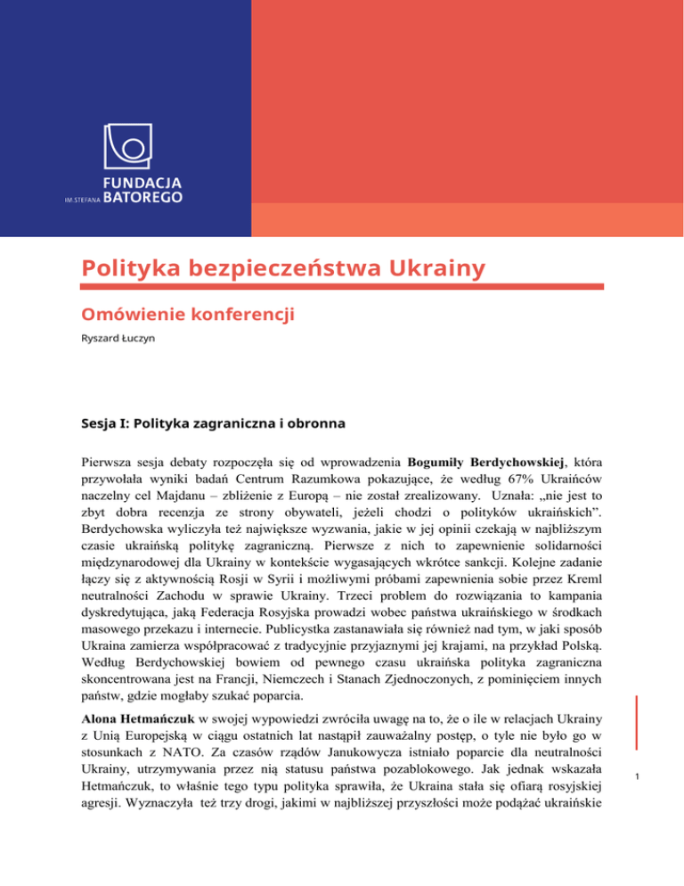Polityka bezpieczeństwa Ukrainy Omówienie konferencji Ryszard Łuczyn Sesja I: Polityka zagraniczna i obronna Pierwsza sesja debaty rozpoczęła się od wprowadzenia Bogumiły Berdychowskiej, która przywołała wyniki badań Centrum Razumkowa pokazujące, że według 67% Ukraińców naczelny cel Majdanu – zbliżenie z Europą – nie został zrealizowany. Uznała: „nie jest to zbyt dobra recenzja ze strony obywateli, jeżeli chodzi o polityków ukraińskich”. Berdychowska wyliczyła też największe wyzwania, jakie w jej opinii czekają w najbliższym czasie ukraińską politykę zagraniczną. Pierwsze z nich to zapewnienie solidarności międzynarodowej dla Ukrainy w kontekście wygasających wkrótce sankcji. Kolejne zadanie łączy się z aktywnością Rosji w Syrii i możliwymi próbami zapewnienia sobie przez Kreml neutralności Zachodu w sprawie Ukrainy. Trzeci problem do rozwiązania to kampania dyskredytująca, jaką Federacja Rosyjska prowadzi wobec państwa ukraińskiego w środkach masowego przekazu i internecie. Publicystka zastanawiała się również nad tym, w jaki sposób Ukraina zamierza współpracować z tradycyjnie przyjaznymi jej krajami, na przykład Polską. Według Berdychowskiej bowiem od pewnego czasu ukraińska polityka zagraniczna skoncentrowana jest na Francji, Niemczech i Stanach Zjednoczonych, z pominięciem innych państw, gdzie mogłaby szukać poparcia. Alona Hetmańczuk w swojej wypowiedzi zwróciła uwagę na to, że o ile w relacjach Ukrainy z Unią Europejską w ciągu ostatnich lat nastąpił zauważalny postęp, o tyle nie było go w stosunkach z NATO. Za czasów rządów Janukowycza istniało poparcie dla neutralności Ukrainy, utrzymywania przez nią statusu państwa pozablokowego. Jak jednak wskazała Hetmańczuk, to właśnie tego typu polityka sprawiła, że Ukraina stała się ofiarą rosyjskiej agresji. Wyznaczyła też trzy drogi, jakimi w najbliższej przyszłości może podążać ukraińskie 1 kierownictwo. Przede wszystkim możliwe jest obranie mniej lub bardziej jawnego kursu na członkostwo w NATO. Drugie rozwiązanie stanowi model szwedzki, polegający na osiągnięciu kompatybilności sił zbrojnych ze standardami NATO i stworzeniu możliwości natychmiastowego przystąpienia do Sojuszu, gdyby stało się to konieczne. Trzecia droga to pozostawanie przy neutralności bez formalnego ogłaszania jej. Zarówno jednak duże poparcie społeczeństwa dla kursu pronatowskiego, jak i jasne określenie Rosji jako przeciwnika w nowo uchwalonych dokumentach strategicznych wskazują na niewielką możliwość wybrania tej ostatniej drogi. Odnosząc się do kwestii integracji europejskiej, Hetmańczuk zwróciła uwagę na wysoką cenę, jaką przyszło Ukrainie zapłacić za umowę stowarzyszeniową z Unią, która nie daje jej nawet jasnej perspektywy członkostwa i nie gwarantuje ruchu bezwizowego. Wskazała też na pomyłkę państw Unii, jaką jest według niej wywieranie presji na realizację porozumień mińskich. Jak powiedziała, może to doprowadzić do „niemądrego pokoju”, szkodzącego stabilności politycznej Ukrainy. Hetmańczuk odniosła się też do trudności, jakie wydaje się sprawiać ukraińskim władzom reformowanie kraju. Według jej słów w Europie panuje „odczucie, że Ukraina jest krajem, który dobrze biega stumetrówki, ale bardzo ciężko jej z maratonami”, to znaczy, że łatwiej przychodzi jej rewolucja niż reformy. Jak powiedziała, Ukraina dostała teraz szansę udowodnienia, że potrafi im podołać. Nie jest jednak tak, że reformy nie są realizowane – przeprowadza się je, lecz trzeba jeszcze wiele wysiłku włożyć w to, aby uczynić je nieodwracalnymi. Według Hetmańczuk kluczowe będzie w tym kontekście wsparcie ze strony partnerów europejskich, w tym Polski. Z tym stwierdzeniem zgodził się Wołodymyr Fesenko, podkreślając jednocześnie, że mimo braku radykalnych reform ukraińskim władzom udało się ustabilizować sytuację. Społeczeństwo zaś nie jest gotowe na podwyższenie wieku emerytalnego czy powszechną prywatyzację. Ta niechęć zwiększa przestrzeń dla populizmu w kraju. Co więcej, według Fesenki radykalne zmiany mogłyby wzmocnić niestabilność ekonomiczną i społeczną. Dużym atutem w tej sferze jest nacisk zachodnich partnerów Ukrainy na reformy. Paradoksalnie również utrata Krymu i Donbasu miała pozytywny wpływ na elektorat – Fesenko pozostaje zatem, jak sam powiedział, „umiarkowanym optymistą”. Pewien postęp udało się według niego osiągnąć również w związku z porozumieniami mińskimi – została podpisana umowa o odprowadzeniu czołgów i artylerii. Nadal jednak istnieje problem z wyborami lokalnymi przeprowadzonymi przez rebeliantów w republikach separatystycznych, których Ukraina „kategorycznie nie uznaje”. Polityka rosyjska na tych terenach dąży obecnie, jak powiedział Fesenko, do zamrożenia konfliktu. Putin nie prowadzi działań wojennych i w ten sposób stara się uspokoić Zachód oraz doprowadzić do zniesienia sankcji. Jewhen Mahda skoncentrował się na kwestii wojny hybrydowej prowadzonej przez Rosję. Według panelisty stała się ona możliwa z powodu braku realnych reform na Ukrainie po 1991 roku. Co więcej, obecnie realizowane próby wasalizacji Ukrainy nie są niczym nowym. Jak powiedział Mahda, „już od wielu lat rosyjscy oficjele nazywali ją «państwem nieudanym» – walczyli wtedy o kontrolę nad ukraińskim systemem przesyłu ropy”. Sama wojna też nie wybuchła spontanicznie – świadczą o tym rozmiary przedsięwzięcia oraz zgromadzone zapasy. Cele Rosji – zdemoralizowanie ukraińskich obywateli i sprawienie, by utracili oni zaufanie do własnego państwa – nie zostały osiągnięte. Nie oznacza to jednak – choć 2 ukraińska armia ma już za sobą najcięższy okres – że problem został rozwiązany. Paradoksalnie to właśnie Rosja jako pierwsza uświadomiła sobie potencjał
