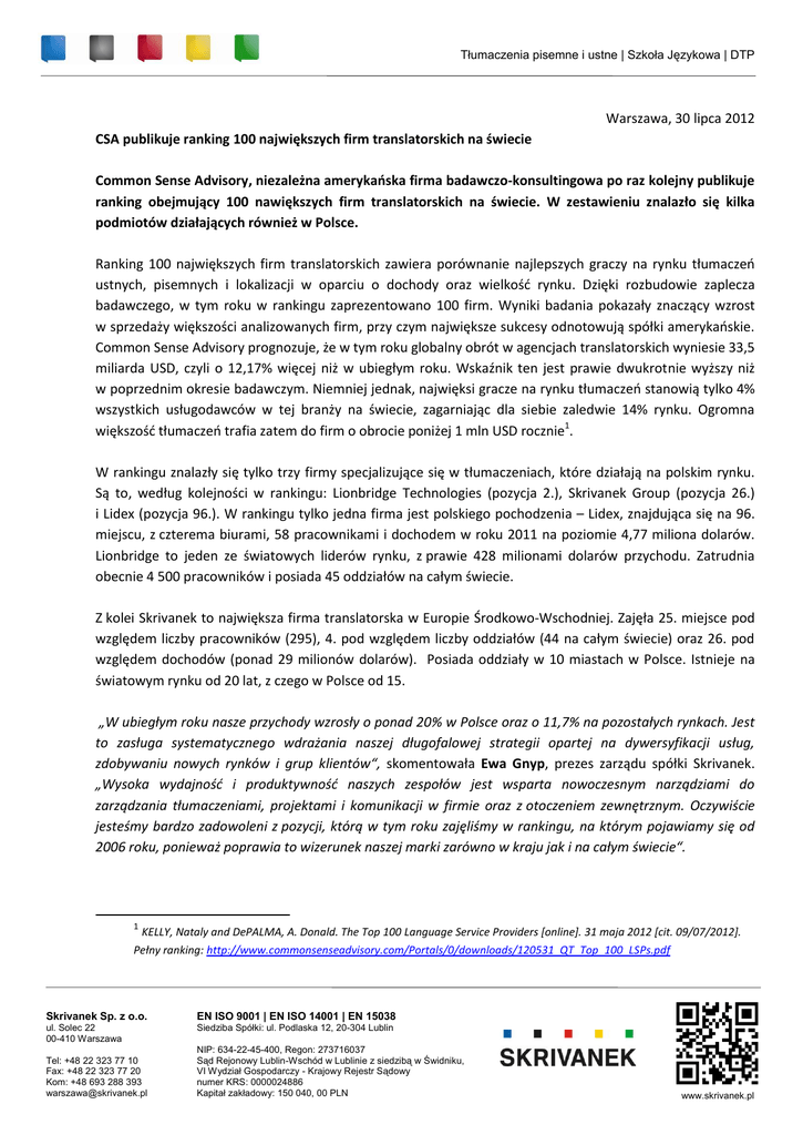 Tłumaczenia pisemne i ustne | Szkoła Językowa | DTP Warszawa, 30 lipca 2012 CSA publikuje ranking 100 największych firm translatorskich na świecie Common Sense Advisory, niezależna amerykańska firma badawczo-konsultingowa po raz kolejny publikuje ranking obejmujący 100 nawiększych firm translatorskich na świecie. W zestawieniu znalazło się kilka podmiotów działających również w Polsce. Ranking 100 największych firm translatorskich zawiera porównanie najlepszych graczy na rynku tłumaczeń ustnych, pisemnych i lokalizacji w oparciu o dochody oraz wielkość rynku. Dzięki rozbudowie zaplecza badawczego, w tym roku w rankingu zaprezentowano 100 firm. Wyniki badania pokazały znaczący wzrost w sprzedaży większości analizowanych firm, przy czym największe sukcesy odnotowują spółki amerykańskie. Common Sense Advisory prognozuje, że w tym roku globalny obrót w agencjach translatorskich wyniesie 33,5 miliarda USD, czyli o 12,17% więcej niż w ubiegłym roku. Wskaźnik ten jest prawie dwukrotnie wyższy niż w poprzednim okresie badawczym. Niemniej jednak, najwięksi gracze na rynku tłumaczeń stanowią tylko 4% wszystkich usługodawców w tej branży na świecie, zagarniając dla siebie zaledwie 14% rynku. Ogromna większość tłumaczeń trafia zatem do firm o obrocie poniżej 1 mln USD rocznie1. W rankingu znalazły się tylko trzy firmy specjalizujące się w tłumaczeniach, które działają na polskim rynku. Są to, według kolejności w rankingu: Lionbridge Technologies (pozycja 2.), Skrivanek Group (pozycja 26.) i Lidex (pozycja 96.). W rankingu tylko jedna firma jest polskiego pochodzenia – Lidex, znajdująca się na 96. miejscu, z czterema biurami, 58 pracownikami i dochodem w roku 2011 na poziomie 4,77 miliona dolarów. Lionbridge to jeden ze światowych liderów rynku, z prawie 428 milionami dolarów przychodu. Zatrudnia obecnie 4 500 pracowników i posiada 45 oddziałów na całym świecie. Z kolei Skrivanek to największa firma translatorska w Europie Środkowo-Wschodniej. Zajęła 25. miejsce pod względem liczby pracowników (295), 4. pod względem liczby oddziałów (44 na całym świecie) oraz 26. pod względem dochodów (ponad 29 milionów dolarów). Posiada oddziały w 10 miastach w Polsce. Istnieje na światowym rynku od 20 lat, z czego w Polsce od 15. „W ubiegłym roku nasze przychody wzrosły o ponad 20% w Polsce oraz o 11,7% na pozostałych rynkach. Jest to zasługa systematycznego wdrażania naszej długofalowej strategii opartej na dywersyfikacji usług, zdobywaniu nowych rynków i grup klientów“, skomentowała Ewa Gnyp, prezes zarządu spółki Skrivanek. „Wysoka wydajność i produktywność naszych zespołów jest wsparta nowoczesnym narządziami do zarządzania tłumaczeniami, projektami i komunikacji w firmie oraz z otoczeniem zewnętrznym. Oczywiście jesteśmy bardzo zadowoleni z pozycji, którą w tym roku zajęliśmy w rankingu, na którym pojawiamy się od 2006 roku, ponieważ poprawia to wizerunek naszej marki zarówno w kraju jak i na całym świecie“. 1 KELLY, Nataly and DePALMA, A. Donald. The Top 100 Language Service Providers [online]. 31 maja 2012 [cit. 09/07/2012]. Pełny ranking: http://www.commonsenseadvisory.com/Portals/0/downloads/120531_QT_Top_100_LSPs.pdf Skrivanek Sp. z o.o. EN ISO 9001 | EN ISO 14001 | EN 15038 ul. Solec 22 00-410 Warszawa Siedziba Spółki: ul. Podlaska 12, 20-304 Lublin Tel: +48 22 323 77 10 Fax: +48 22 323 77 20 Kom: +48 693 288 393 [email protected] NIP: 634-22-45-400, Regon: 273716037 Sąd Rejonowy Lublin-Wschód w Lublinie z siedzibą w Świdniku, VI Wydział Gospodarczy - Krajowy Rejestr Sądowy numer KRS: 0000024886 Kapitał zakładowy: 150 040, 00 PLN www.skrivanek.pl