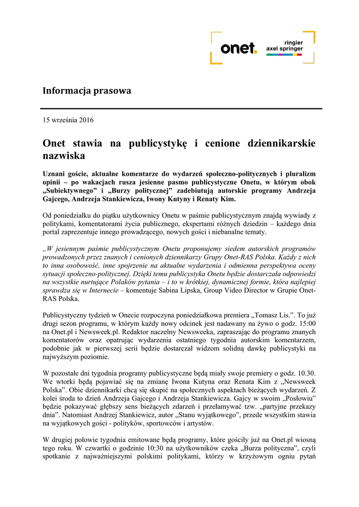 Informacjaprasowa 15 września 2016 Onet stawia na publicystykę i cenione dziennikarskie nazwiska Uznani goście, aktualne komentarze do wydarzeń społeczno-politycznych i pluralizm opinii – po wakacjach rusza jesienne pasmo publicystyczne Onetu, w którym obok „Subiektywnego” i „Burzy politycznej” zadebiutują autorskie programy Andrzeja Gajcego, Andrzeja Stankiewicza, Iwony Kutyny i Renaty Kim. Od poniedziałku do piątku użytkownicy Onetu w paśmie publicystycznym znajdą wywiady z politykami, komentatorami życia publicznego, ekspertami różnych dziedzin – każdego dnia portal zaprezentuje innego prowadzącego, nowych gości i niebanalne tematy. „W jesiennym paśmie publicystycznym Onetu proponujemy siedem autorskich programów prowadzonych przez znanych i cenionych dziennikarzy Grupy Onet-RAS Polska. Każdy z nich to inna osobowość, inne spojrzenie na aktualne wydarzenia i odmienna perspektywa oceny sytuacji społeczno-politycznej. Dzięki temu publicystyka Onetu będzie dostarczała odpowiedzi na wszystkie nurtujące Polaków pytania – i to w krótkiej, dynamicznej formie, która najlepiej sprawdza się w Internecie – komentuje Sabina Lipska, Group Video Director w Grupie OnetRAS Polska. Publicystyczny tydzień w Onecie rozpoczyna poniedziałkowa premiera „Tomasz Lis.”. To już drugi sezon programu, w którym każdy nowy odcinek jest nadawany na żywo o godz. 15:00 na Onet.pl i Newsweek.pl. Redaktor naczelny Newsweeka, zapraszając do programu znanych komentatorów oraz opatrując wydarzenia ostatniego tygodnia autorskim komentarzem, podobnie jak w pierwszej serii będzie dostarczał widzom solidną dawkę publicystyki na najwyższym poziomie. W pozostałe dni tygodnia programy publicystyczne będą miały swoje premiery o godz. 10.30. We wtorki będą pojawiać się na zmianę Iwona Kutyna oraz Renata Kim z „Newsweek Polska”. Obie dziennikarki chcą się skupić na społecznych aspektach bieżących wydarzeń. Z kolei środa to dzień Andrzeja Gajcego i Andrzeja Stankiewicza. Gajcy w swoim „Posłowiu” będzie pokazywać głębszy sens bieżących zdarzeń i przełamywać tzw. „partyjne przekazy dnia”. Natomiast Andrzej Stankiewicz, autor „Stanu wyjątkowego”, przede wszystkim stawia na wyjątkowych gości - polityków, sportowców i artystów. W drugiej połowie tygodnia emitowane będą programy, które gościły już na Onet.pl wiosną tego roku. W czwartki o godzinie 10:30 na użytkowników czeka „Burza polityczna”, czyli spotkanie z najważniejszymi polskimi politykami, którzy w krzyżowym ogniu pytań Informacjaprasowa Agnieszki Burzyńskiej, dziennikarki działu politycznego „Faktu”, tłumaczą się z działań własnej formacji partyjnej. Z kolei piątek to dzień „Subiektywnego” Bartosza Węglarczyka, który zamierza poświęcać dużo uwagi polityce zagranicznej i wydarzeniom międzynarodowym. To już drugi sezon programowy na łamach Onet.pl. Wiosną tego roku Grupa Onet-RAS Polska zaprezentowała ponad 30 własnych produkcji wideo. Niebawem w serwisach Grupy zadebiutują kolejne programy publicystyczne, lifestylowe, rozrywkowe i sportowe, które będą stanowić istotne dopełnienie oferty Onetu w obszarze wideo. Kontakt dla mediów: Piotr Kaniowski Group Communications Manager Grupa Onet-RAS Polska [email protected] +48 690 110 025