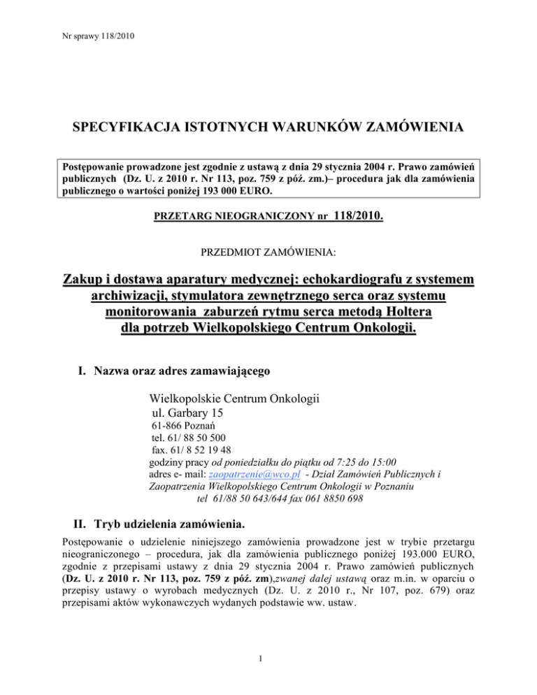 Nr sprawy 118/2010 SPECYFIKACJA ISTOTNYCH WARUNKÓW ZAMÓWIENIA Postępowanie prowadzone jest zgodnie z ustawą z dnia 29 stycznia 2004 r. Prawo zamówień publicznych (Dz. U. z 2010 r. Nr 113, poz. 759 z póź. zm.)– procedura jak dla zamówienia publicznego o wartości poniżej 193 000 EURO. PRZETARG NIEOGRANICZONY nr 118/2010. PRZEDMIOT ZAMÓWIENIA: Zakup i dostawa aparatury medycznej: echokardiografu z systemem archiwizacji, stymulatora zewnętrznego serca oraz systemu monitorowania zaburzeń rytmu serca metodą Holtera dla potrzeb Wielkopolskiego Centrum Onkologii. I. Nazwa oraz adres zamawiającego Wielkopolskie Centrum Onkologii ul. Garbary 15 61-866 Poznań tel. 61/ 88 50 500 fax. 61/ 8 52 19 48 godziny pracy od poniedziałku do piątku od 7:25 do 15:00 adres e- mail: [email protected] - Dział Zamówień Publicznych i Zaopatrzenia Wielkopolskiego Centrum Onkologii w Poznaniu tel 61/88 50 643/644 fax 061 8850 698 II. Tryb udzielenia zamówienia. Postępowanie o udzielenie niniejszego zamówienia prowadzone jest w trybie przetargu nieograniczonego – procedura, jak dla zamówienia publicznego poniżej 193.000 EURO, zgodnie z przepisami ustawy z dnia 29 stycznia 2004 r. Prawo zamówień publicznych (Dz. U. z 2010 r. Nr 113, poz. 759 z póź. zm),zwanej dalej ustawą oraz m.in. w oparciu o przepisy ustawy o wyrobach medycznych (Dz. U. z 2010 r., Nr 107, poz. 679) oraz przepisami aktów wykonawczych wydanych podstawie ww. ustaw. 1 Nr sprawy 118/2010 1) Zamawiający dopuszcza możliwość składania ofert częściowych, odpowiadających poszczególnym pakietom wyspecyfikowanym w załączniku nr 7 do niniejszej specyfikacji. Przedmiot zamówienia został podzielony na 3 pakiety. 2) Zamawiający NIE dopuszcza możliwości składania ofert wariantowych; 3) Zamawiający NIE przewiduje zawarcia umowy ramowej; 4) Zamawiający dopuszcza możliwość złożenia ofert równoważnych, jeżeli z opisu zamieszczonego w SIWZ mogłoby wynikać, iż przedmiot zamówienia określony został poprzez wskazanie znaków towarowych, patentów lub pochodzenia. W przypadku składania ofert równoważnych w ofercie należy podać proponowane odpowiedniki i zamieścić opis dotyczący właściwości odpowiedników – warunek bezwzględny. Brak: wskazania proponowanych odpowiedników i opisu dotyczącego właściwości zastosowanych odpowiedników stanowi podstawę do odrzucenia oferty – art. 89 ust. 1 pkt. 2 ustawy Prawo zamówień publicznych. 5) Zamawiający nie przewiduje możliwości udzielenia zamówień uzupełniających, o których mowa w art. 67 ust. 1 pkt. 7 ustawy. 6) Zamawiający NIE przewiduje wyboru oferty najkorzystniejszej z zastosowaniem aukcji elektronicznej. 7) Zamawiający żąda wskazania przez wykonawcę w ofercie części zamówienia, której wykonanie powierzy podwykonawcom- zgodnie z art. 36 ust.4 ustawy – załącznik nr 5 do niniejszej specyfikacji. Stosownie do dyspozycji art. 36 ust. 5 ustawy Prawo zamówień publicznych - Zamawiający nie określa, która część zamówienia nie może być powierzona podwykonawcą. 8) Przewidywany okres realizacji umowy – do 4 tygodni od daty podpisania umowy. 9) Wymagany przez Zamawiającego termin płatności w zakresie objętym przedmiotem zamówienia – wynosi 30 dni. 10) Rabaty naturalne nie będą uwzględniane. III. 1. Opis przedmiotu zamówienia. Zakup i dostawa aparatury medycznej: echokardiografu wraz z systemem archiwizacji, stymulatora zewnętrznego serca oraz systemu monitorowania zaburzeń rytmu serca metodą Holtera dla potrzeb Wielkopolskiego Centrum Onkologii. Nomenklatura wg Wspólnego Słownika Zamówień (CPV): 33.11.23.40-3 echokardiografy 33.15.82.10-7 stymulatory 33.10.00.00-1 urządzenia medyczne 2 Nr sprawy 118/2010 Szczegółowy opis przedmiotu zamówienia: Przedmiot zamówienia obejmuje: Zakup i dostawę: Pakiet I: echokardiografu z systemem archiwizacji – 1 szt, Pakiet II: stymulatora zewnętrznego serca – 2 szt. Pakiet III: systemu monitorowania zaburzeń rytmu serca metodą Holtera – 2 szt. dla potrzeb Wielkopolskiego Centrum Onkologii szczegółowo opisanych w Formularzu oceny technicznej/Opisie przedmiotu zamówienia stanowiącym załącznik nr 7 do niniejszej specyfikacji istotnych warunków zamówienia. 2. Pozostałe oczekiwania Zamawiającego w zakresie realizacji przedmiotu zamówienia: 1. Wymagany dla urządzeń objętych przedmiotem zamówienia termin produkcji – nie wcześniej niż pierwsza połowa 2010r. 2. Wykonawca zapewnia w cenie dostawy: instalację urządzeń w miejscu wskazanym przez Zamawiającego, uruchomienie, przeprowadzenie testu sprawności, oraz przeszkolenie personelu w zakresie właściwej obsługi i konserwacji urządzeń, w miejscu użytkowania przedmiotu zamówienia. 3. Wymagany przez Zamawiającego termin płatności 30 dni, 4. Wymagany termin realizacji – patrz pkt III niniejszej SIWZ, 5. Wykonawca udzieli gwarancji jakości na oferowane urządzenia – przedmiot zamówienia przez okres co najmniej 24 miesiące , licząc od dnia przekazania przedmiotu zamówienia do eksploatacji i podpisania protokołu odbioru. Oferowany przez Wykonawcę okres gwarancji należy wpisać w formularzu ofertowym – załącznik nr 1 do SIWZ. 6. W okresie, co najmniej 24 miesiące, od podpisania protokołu odbioru Zamawiający korzysta bez wyłączeń z prawa do rękojmi z tytułu wad fizycznych przedmiotu zamówienia. Oferowany przez Wykonawcę okres korzystania z prawa do rękojmi należy wpisać w formularzu ofertowym – załącznik nr 1 do SIWZ. 7. Wykonawca w okresie trwania gwarancji zapewnia serwis eksploatacyjny, w zakresie nie gorszym, niż ustalony przez producenta urządzenia – przedmiotu zamówienia. Wymagany przez producenta serwis eksploatacyjny w okresie trwania gwarancji odbywa się na koszt Wykonawcy. 8. Wykonawca w okresie gwarancji zapewnia Zamawiającemu : - Wliczone w cenę przedmiotu zamówienia: wszystkie koszty związane z naprawą urządzeń – przedmiotu zam