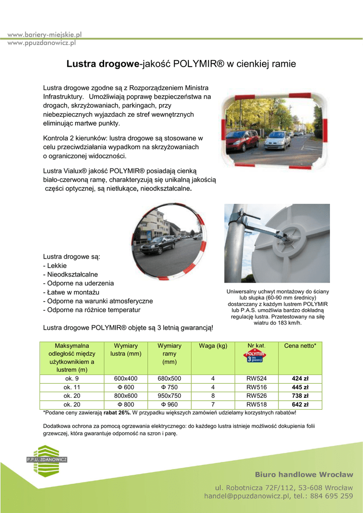Lustra drogowe-jakość POLYMIR® w cienkiej ramie Lustra drogowe zgodne są z Rozporządzeniem Ministra Infrastruktury. Umożliwiają poprawę bezpieczeństwa na drogach, skrzyżowaniach, parkingach, przy niebezpiecznych wyjazdach ze stref wewnętrznych eliminując martwe punkty. Kontrola 2 kierunków: lustra drogowe są stosowane w celu przeciwdziałania wypadkom na skrzyżowaniach o ograniczonej widoczności. Lustra Vialux® jakość POLYMIR® posiadają cienką biało-czerwoną ramę, charakteryzują się unikalną jakością części optycznej, są nietłukące, nieodkształcalne. Lustra drogowe są: - Lekkie - Nieodkształcalne - Odporne na uderzenia - Łatwe w montażu - Odporne na warunki atmosferyczne - Odporne na różnice temperatur Lustra drogowe POLYMIR® objęte są 3 letnią gwarancją! Maksymalna odległość między użytkownikiem a lustrem (m) ok. 9 ok. 11 ok. 20 ok. 20 Uniwersalny uchwyt montażowy do ściany lub słupka (60-90 mm średnicy) dostarczany z każdym lustrem POLYMIR lub P.A.S. umożliwia bardzo dokładną regulację lustra. Przetestowany na siłę wiatru do 183 km/h. Wymiary lustra (mm) Wymiary ramy (mm) Waga (kg) Nr kat. Cena netto* 600x400 Ф 600 800x600 Ф 800 680x500 Ф 750 950x750 Ф 960 4 4 8 7 RW524 RW516 RW526 RW518 424 zł 445 zł 738 zł 642 zł *Podane ceny zawierają rabat 26%. W przypadku większych zamówień udzielamy korzystnych rabatów! Dodatkowa ochrona za pomocą ogrzewania elektrycznego: do każdego lustra istnieje możliwość dokupienia folii grzewczej, która gwarantuje odporność na szron i parę.
