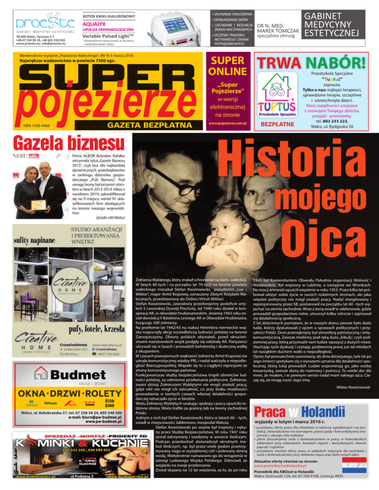 • USUWANIE OWŁOSIENIA • ODMŁADZANIE SKÓRY • USUWANIE I REDUKCJA ZMIAN NACZYNIOWYCH • LECZENIE TRĄDZIKU AKTYWNEGO I ZMIAN POTRĄDZIKOWYCH BOTOX KWAS HIALURONOWY AQUALYX LIPOLIZA FARMAKOLOGICZNA 78-600 Wałcz, Tęczowa 5-7 +48 67 250 90 18, +48 601 210 010 www.proeste.eu, [email protected] Variable Pulsed LightTM - dowiedziona skuteczność w leczeniu niedoskonałości skóry Weekendowe wydanie „Pojezierza Wałeckiego”. (Nr 9) 4 marca 2016 SUPER Największe wydawnictwo w powiecie 7500 egz. ISBN 1426-4366 GAZETA BEZPŁATNA Gazela biznesu Sprzedaż - Montaż Firma ALBOR Bolesław Rafałko otrzymała tytuł „Gazele Biznesu 2015", czyli laur dla najbardziej dynamicznych przedsiębiorstw w rankingu dziennika gospodarczego „Puls Biznesu". Pod uwagę brany był przyrost obrotów w latach 2012-2014. Albor z wynikiem 201% zakwalifikował się na 9 miejscu wśród 91 sklasyfikowanych firm działających na terenie naszego województwa. (źródło UM Wałcz) SUPER ONLINE TRWA NABÓR! Przedszkole Specjalne ”Tuptuś” „Super Pojezierze” w wersji elektronicznej na stronie www.pojezierze.com.pl BEZPŁATNE zaprasza. Tylko u nas: najlepsi terapeuci, sprawdzone terapie, szczęśliwe i uśmiechnięte dzieci. Masz wątpliwości związane z rozwojem Twojego dziecka, przyjdź - pomożemy. tel. 883 233 223, Wałcz, ul. Bydgoska 50 Historia mojego Ojca Żołnierza Wyklętego, który znalazł schronienie na ziemi wałeckiej. W latach 60-tych i na początku lat 70-tych na terenie powiatu wałeckiego mieszkał Stefan Kwaśniewski, pseudonim „Lux – Wiktor”, major Armii Krajowej, oznaczony Złotym Krzyżem Walecznych, przedstawiony do Orderu Virtuti Militari. Stefan Kwaśniewski, zawodowy przedwojenny podoficer artylerii 5 Lwowskiej Dywizji Piechoty, od 1940 roku działał w konspiracji AK, w obwodzie hrubieszowskim. Jesienią 1943 roku został dowódcą V Batalionu Leśnego AK w Obwodzie Hrubieszów, liczącego 300 żołnierzy. Na przełomie lat 1942/43 na rozkaz Himmlera niemieckie wojska rozpoczęły akcję wysiedleńczą ludności polskiej na terenie Zamojszczyzny. Obrony polskich obywateli, przed okrucieństwem nazistowskich wojsk podjęły się oddziały AK. Partyzanci ukrywali się w lasach i prowadzili bohaterską i skuteczną walkę z okupantem. W czasach powojennych większość żołnierzy Armii Krajowej nie uznała komunistycznej władzy PRL i nadal walczyła o niepodległość Rzeczypospolitej. Wiązało się to z ciągłymi represjami ze strony komunistycznego państwa. Funkcjonariusze służby bezpieczeństwa tropili obrońców ludności polskiej, za odmienne przekonania polityczne. Żołnierze, zwani dzisiaj Żołnierzami Wyklętymi nie mogli znaleźć pracy, gdyż nikt nie mógł ich zatrudniać, co przy braku możliwości prowadzenia w tamtych czasach własnej działalności gospodarczej oznaczało życie w biedzie. Wielu Żołnierzy Wyklętych szukając spokoju i pracy opuściło rodzinne strony. Wielu trafiło za granicę lub na tereny zachodniej Polski. Jednym z nich był Stefan Kwaśniewski, który w latach 60 – tych, osiadł w miejscowości Jabłonowo, nieopodal Wałcza. Stefan Kwaśniewski po wojnie był tropiony i nękany przez Służbę Bezpieczeństwa. W roku 1947 roku został zatrzymany i osadzony w areszcie śledczym. Podczas przesłuchań doświadczył okrutnych metod śledczych, np. był przez wiele godzin przetrzymywany nago w wyziębionej celi i polewany zimną wodą. Wielokrotnie namawiano go do wstąpienia w szeregi Ludowego Wojska Polskiego. Odmówił, ze względu na swoje przekonania. Został skazany na 12 lat więzienia, za to, że po roku 1945 był Komendantem Obwodu Południe organizacji Wolność i Niezawisłość. Był więziony w Lublinie, a następnie we Wronkach. Na mocy amnestii opuścił więzienie w roku 1953. Przez kilka lat próbował ułożyć sobie życie w swoich rodzinnych stronach, ale jako więzień polityczny nie mógł znaleźć pracy. Nadal inwigilowany i represjonowany przez SB, postanowił na początku lat 60 –tych wyjechać na ziemie zachodnie. Wraz z żoną osiadł w Jabłonowie, gdzie prowadził gospodarstwo rolne, utworzył kółka rolnicze i zajmował się działalnością społeczną. Z lat dziecinnych pamiętam, że w naszym domu zawsze było dużo ludzi, którzy dyskutowali z ojcem o sprawach politycznych i przyszłości Polski. Dom przesiąknięty był atmosferą patriotyczną i antykomunistyczną. Zawsze mieliśmy pod ręką dużo „bibuły’, czyli podziemnej prasy, którą przywozili nam ludzie opozycji z dużych miast. Słuchając tych dyskusji i czytając podziemną prasę już od młodych lat nasiąkłem duchem walki o niepodległość. Ojciec był powszechnie szanowany, do dnia dzisiejszego, tyle lat po Jego śmierci spotykam się z wyrazami uznania dla działalności społecznej, którą tutaj prowadził. Ludzie wspominają go, jako osobę towarzyską, zawsze skorą do rozmowy i pomocy. To wielki dar dla mnie, że miałem, i w pewnym sensie nadal mam takiego ojca. Cieszę się, że mogę nosić Jego imię. Wiktor Kwaśniewskii Praca w Holandii wyjazdy w lutym i marcu 2016 r. • posiadamy oferty pracy dla młodzieży w sektorze ogrodniczym i na produkcji, doświadczenie nie wymagane, prawo jazdy i komunikatywna znajomość j. obcego mile widziane • pilnie poszukujemy osób z doświadczeniem w pracy w holenderskich szklarniach przy sadzonkach, kwiatach ciętych i doniczkowych, zbiorze papryki i ogórków • posiadamy również oferty pracy w zakładach mięsnych dla rzeźników i osób z doświadczeniem przy dzieleniu mięsa oraz wiele innych ofert. Aktualne oferty również na stronie: www.posrednictwoholandia.pl Pośrednik dla ABOost w Holandii: Wałcz, Kościuszki 12A, tel. 67 258 4108, Licencja 4933 Horoskop Sudoku 285 (Medium) Baran: Chciałbyś wcielić w życie wielkie przedsięwzięcie? Skonsultuj się wcześniej z zaufanymi osobami, nieSudoku 285 (Medium) koniecznie z rodziny. Nie lekceważ p