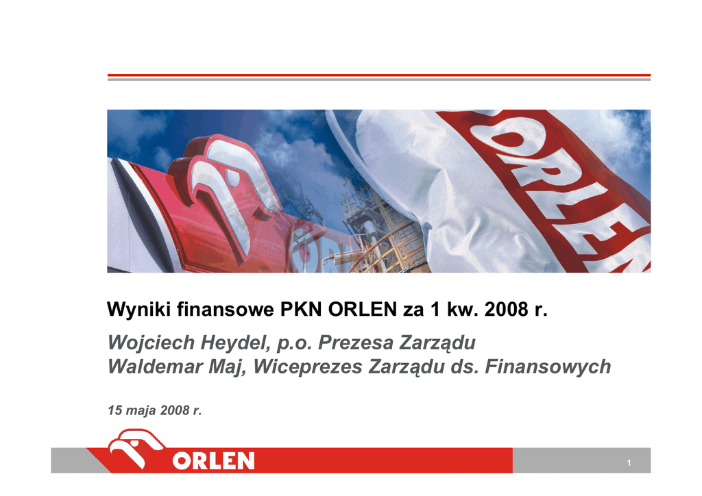Wyniki finansowe PKN ORLEN za 1 kw. 2008 r. Wojciech Heydel, p.o. Prezesa Zarządu Waldemar Maj, Wiceprezes Zarządu ds. Finansowych 15 maja 2008 r. 1 AGENDA Kluczowe wyniki finansowe i operacyjne w 1 kw. 2008 r. Główne czynniki kształtujące zysk operacyjny (EBIT) w 1 kw. 2008 r. Slajdy pomocnicze 2 WYNIKI FINANSOWE Wyniki finansowe Koncernu w 1 kw. 2008 r. są znacząco lepsze niż w 1 kw. 2007 r. Zysk operacyjny powiększony o amortyzację (EBITDA) wzrósł o blisko 160 mln PLN, a zysk netto o blisko 580 mln PLN. Zwiększyły się środki pieniężne z działalności operacyjnej i rentowność kapitału oraz obniżyła dźwignia finansowa. w mln PLN EBITDA1 Zysk netto akcjonariuszy jednostki dominującej Środki pieniężne z działalności operacyjnej ROACE (%) 2 Dźwignia finansowa (%) 3 Dług netto / EBITDA 4 1kw2007 4kw2007 1kw2008 zmiana r/r [%] zmiana kw/kw [%] 1 2 3 4=3/1 5=3/2 995 730 1 152 16% 58% 49 691 626 1178% -9% 594 -573 986 66% - 4,1% 1,1% 5,9% - - 39% 35% 37% - - 2,1 2,9 1,7 - - 1) Zysk operacyjny przed amortyzacją i opodatkowaniem 2) ROACE (rentowność zaangażowanego kapitału) = zysk operacyjny po opodatkowaniu / średni kapitał zaangażowany w okresie (kapitał własny + dług netto). 3) Dźwignia finansowa = dług netto/ kapitał własny. 4) Dług (odsetkowy) pomniejszony o gotówkę i papiery krótkoterminowe / (EBITDA + otrzymana dywidenda z Polkomtela). 3 ZYSK OPERACYJNY Zysk operacyjny Koncernu (EBIT) w 1 kw. 2008 r. jest wyższy o 190 mln PLN (ponad 50%) niż w 1 kw. 2007 r. Zysk operacyjny wzrósł znacząco w segmentach rafineryjnym (o 175 mln PLN) oraz detalicznym (o 35 mln PLN). w mln PLN EBIT, w tym segmenty: 1kw2007 4kw2007 1kw2008 zmiana r/r [%] zmiana kw/kw [%] 1 2 3 4=3/1 5=3/2 375 104 565 51% 443% Rafineria1 65 224 240 269% 7% Detal 68 67 103 51% 54% 370 56 232 -37% 314% 83 38 91 10% 139% -74 -45 1 - - -137 -236 -102 26% 57% Petrochemia Chemia Pozostałe2 Nieprzypisane3 1) Produkcja, Hurt i Logistyka. 2) Jednostki odpowiedzialne za media, działalność socjalną oraz spółki serwisowe PKN ORLEN. 3) Centrum korporacyjne PKN ORLEN oraz spółki grupy nie zaliczone do innych segmentów. 4 SPRZEDAŻ Wolumeny sprzedaży Koncernu w 1 kw. 2008 r. są znacząco wyższe niż w 1 kw. 2007 r. Sprzedaż produktów rafineryjnych w hurcie wzrosła o blisko 900 tys. ton (22%), a w detalu o blisko 120 tys. ton (9%). w tys. ton 1kw2007 4kw2007 1kw2008 zmiana r/r [%] zmiana kw/kw [%] 1 2 3 4=3/1 5=3/2 Wolumen sprzedaży, razem 6 434 6 465 7 423 15% 15% Wolumen sprzedaży w hurcie 4 095 4 167 4 982 22% 20% Wolumen sprzedaży paliw w detalu 1 053 1 153 1 147 9% -1% Wolumen sprzedaży petrochemicznej 763 766 779 2% 2% Wolumen sprzedaży chemicznej 523 379 515 -1% 36% 5 PRODUKCJA Przerób ropy i wolumeny produkcji w 1 kw. 2008 r. są znacząco wyższe niż w 1 kw. 2007 r. Udział produkcji oleju napędowego (ON), lekkiego oleju opałowego (LOO) i paliwa lotniczego (JET) w 1 kw. 2008 wzrósł o ponad 2,5 pp r/r do poziomu ponad 50% w całkowitej produkcji rafineryjnej. w tys. ton 1kw2007 4kw2007 1kw2008 zmiana r/r [%] zmiana kw/kw [%] 1 2 3 4=3/1 5=3/2 Przerób ropy 5 768 5 234 6 501 13% 24% Produkcja, razem 5 815 5 435 6 765 16% 24% Produkcja rafineryjna, w tym: 4 677 4 283 5 308 13% 24% - ON, LOO, JET 2 261 2 181 2 702 20% 24% - Benzyna, LPG 1 307 1 200 1 624 24% 35% 1 109 902 982 -11% 9% Produkcja petrochemiczna 684 673 947 38% 41% Produkcja chemiczna 454 479 510 12% 6% - Pozostałe 1 1) Zawiera ciężki olej opałowy, bazy olejowe i inne produkty rafineryjne 6 REALIZACJA PROJEKTÓW W 1 kw. 2008 r. konsekwentnie wdrażano działania mające na celu wzrost produkcji i sprzedaży paliw, szczególnie oleju napędowego, oraz towarów i usług w segmencie detalicznym. Segment Rafineria Detal Chemia Zrealizowane działania Uzyskany efekt • Odbudowa kolumny destylacji próżniowej w Mazeikiu Nafta. • Sprzedaż zwiększonych wolumenów paliw po przywróceniu mocy produkcyjnych w Mazeikiu Nafta. • Uruchomienie instalacji do produkcji oleju napędowego (HONH)1) w Płocku w lutym 2008r. • Przywrócenie mocy produkcyjnych do 10 mln t/r. • Wzrost sprzedaży hurtowej o 22% r/r. • Kontynuacja strategii dwóch marek, wzrost ilości stacji w poszczególnych barwach (szt.): ORLEN (5), BLISKA (4), Benzina Plus (4), Benzina (2), STAR (11), ORLEN Lietuva (3) • Konsekwentne zarządzanie kategoriami produktów i usług pozapaliwowych; wprowadzenie oferty STOP Cafe. • Wzrost sprzedaży paliw o 9% r/r. • Maksymalizacja sprzedaży produktów nawozowych. • Wzrost sprzedaży nawozów o ok. 5% r/r. • Zwiększenie produkcji oleju napędowego o 190 tys. t/r. • Wzrost marży pozapaliwowej o ponad 25% r/r. 1) Hydrorafinacja Oleju Napędowego z Hydroodsiarczania Gudronu 7 MAZEIKIU NAFTA W 1 kw. 2008 r. rafineria w Mazeiku Nafta po odbudowie kolumny destylacji ropy systematycznie, miesiąc po miesiącu zwiększała przerób ropy i wsadów, osiągając a następnie przekraczając poziom produkcji sprzed awarii (w 2005 r.) Wykorzystanie mocy (w %) Przerób ropy i wsadów (w tys. ton) 854 708 594 849 709 90,5% 81,7% 94,8% 99,0% Mar'08 Kwi'08 57,3% 2005r. Sty'08 Średnie miesięczne Lut'08 Mar'08 Kwi'08 2005r. Sty'08 Lut'08 Średnie miesięczne Uzysk produktów białych1) (w %) 73,0% 72,5% 72,0% Produkcja głównych paliw w (w tys. ton) 73,0% Benzyna 301 220 Diesel + JET 328 271 245 185 196 222 333 252 68,0% 2005r. Średnie miesięczne Sty'08 Lut'08 Mar'08 Kwi'08 2005r. Średnie miesięczne 1) Uzysk produktów białych dotyczy udziału benzyny, LPG, oleju napędowego oraz JET w całkowitym przerobie ropy oraz wsadów. Sty'08 Lut'08 Mar'08 Kwi'08 Średnie miesięczne wykonanie z 2005 r 8 AGENDA Kluczowe wyniki finansowe i operacyjne w 1 kw. 2008 r. Główne czynniki kształtujące zysk operacyjny (EBIT) w 1 kw. 2008 r. Slajdy pomocnicze 9 WZROST EFEKTYWNOŚCI KONCERNU Wzrost efektywności Koncernu we wszystkich kluczowych spółkach przełożył się na wzrost EBIT o 190 mln 