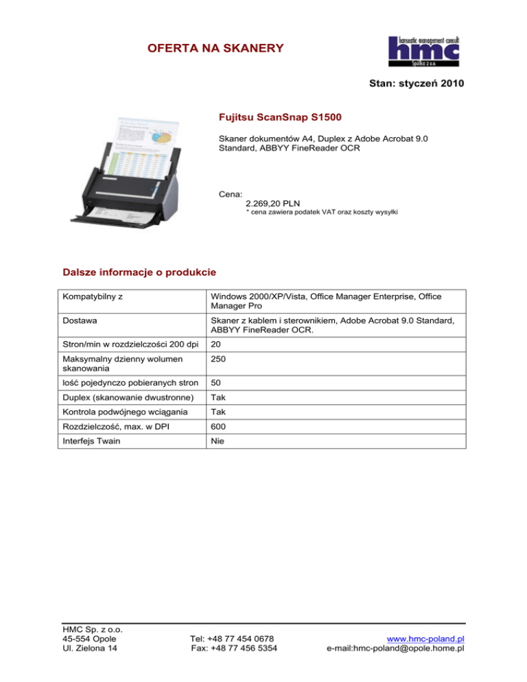 OFERTA NA SKANERY Stan: styczeń 2010 Fujitsu ScanSnap S1500 Skaner dokumentów A4, Duplex z Adobe Acrobat 9.0 Standard, ABBYY FineReader OCR Cena: 2.269,20 PLN * cena zawiera podatek VAT oraz koszty wysyłki Dalsze informacje o produkcie Kompatybilny z Windows 2000/XP/Vista, Office Manager Enterprise, Office Manager Pro Dostawa Skaner z kablem i sterownikiem, Adobe Acrobat 9.0 Standard, ABBYY FineReader OCR. Stron/min w rozdzielczości 200 dpi 20 Maksymalny dzienny wolumen skanowania 250 lość pojedynczo pobieranych stron 50 Duplex (skanowanie dwustronne) Tak Kontrola podwójnego wciągania Tak Rozdzielczość, max. w DPI 600 Interfejs Twain Nie HMC Sp. z o.o. 45-554 Opole Ul. Zielona 14 Tel: +48 77 454 0678 Fax: +48 77 456 5354 www.hmc-poland.pl e-mail:[email protected] OFERTA NA SKANERY Fujitsu ScanSnap S300 Przenośny skaner dokumentów A4 Cena: 1.378,60 PLN * cena zawiera podatek VAT oraz koszty wysyłki Dalsze informacje o produkcie Kompatybilny z Office Manager Enterprise, Office Manager Pro Dostawa Skaner z kablem i sterownikiem Stron/min w rozdzielczości 200 dpi 8 Maksymalny dzienny wolumen skanowania 80 lość pojedynczo pobieranych stron 10 Duplex (skanowanie dwustronne) Tak Kontrola podwójnego wciągania Nie Rozdzielczość, max. w DPI 600 Interfejs Twain Nie HMC Sp. z o.o. 45-554 Opole Ul. Zielona 14 Tel: +48 77 454 0678 Fax: +48 77 456 5354 www.hmc-poland.pl e-mail:[email protected] OFERTA NA SKANERY Sceye 3rd cyfrowa kamera do dokumentów – bez oświetlenia Sceye jest pierwszym przedstawicielem nowej generacji skanerów: dokumenty nie są wciągane, lecz fotografowane przez kamerę cyfrową. W tym celu kamera jest otwierana, kawałek papieru, książka lub segregator z dokumentacją umieszczany pod laserowym czytnikiem i w ciągu jednej sekundy zamieniany na formę elektroniczną. Możecie połączyć Sceye z Office Managerem przy pomocy interfejsu Twain i korzystać z niej przy pomocy szybkiego bezpośredniego łącza. Cena: 2.562,00 PLN * cena zawiera podatek VAT oraz koszty wysyłki Dalsze informacje o produkcie Kompatybilny z Office Manager Enterprise, Office Manager Pro, TWAIN, Windows 2000, XP,Vista 32, Vista 64, USB 2.0 Dostawa Kamera dokumentów z kablem USB i sterownikami, torba Kolor srebrny Oświetlenie brak HMC Sp. z o.o. 45-554 Opole Ul. Zielona 14 Tel: +48 77 454 0678 Fax: +48 77 456 5354 www.hmc-poland.pl e-mail:[email protected] OFERTA NA SKANERY Sceye 3rd cyfrowa kamera do dokumentów – z oświetleniem dokumentów Sceye jest pierwszym przedstawicielem nowej generacji skanerów: dokumenty nie są wciągane, lecz fotografowane przez kamerę cyfrową. W tym celu kamera jest otwierana, kawałek papieru, książka lub segregator z dokumentacją umieszczany pod laserowym czytnikiem i w ciągu jednej sekundy zamieniany na formę elektroniczną. Możecie połączyć Sceye z Office Managerem przy pomocy interfejsu Twain i korzystać z niej przy pomocy szybkiego bezpośredniego łącza. Cena: 3.037,80 PLN * cena zawiera podatek VAT oraz koszty wysyłki Dalsze informacje o produkcie Kompatybilny z TWAIN, Windows 2000, XP,Vista 32, Vista 64, USB 2.0, Office Manager Enterprise, Office Manager Pro, Dostawa Kamera dokumentów z kablem USB i sterownikami, torba, zasilacz sieciowy do uruchomienia LED Kolor Srebrny Oświetlenie Naświetlacz dokumentów – LED HMC Sp. z o.o. 45-554 Opole Ul. Zielona 14 Tel: +48 77 454 0678 Fax: +48 77 456 5354 www.hmc-poland.pl e-mail:[email protected] OFERTA NA SKANERY Fujitsu fi-6130 skaner dokumentów Duplex w kolorze – rozwiązanie skanowania dla typowego dziennego wolumenu pomiędzy 800 a 4.000 dokumentów (A4) przy prędkości opracowania do 40 stron/minutę wzgl. 80 obrazów/minutę przy dwustronnym skanowaniu (duplex). Cechy: • Prędkość 40 stron/minutę / 80 obrazów/minutę w czerń/biel z 200dpi 30 stron/minutę / 60 obrazów/minutę w kolorze z 200dpi • Bardzo dobry mechanizm pobierania • Do 600 dpi optycznej rozdzielczości • Duplex (skanowanie dwustronne) • Rozpoznawanie rozmiaru papieru / automatyczne przycinanie do formatu • Czarne i białe tło skanowania • Ultradźwiękowa kontrola podwójnego wciągania • 50 pojedynczo pobieranych stron • Interfejs Twain • Zawiera pakiet oprogramowania: Adobe Acrobat Standard 8.0 VRS Professional ScandAll Pro • Interfejs: USB 2.0 • Opcjonalny Imprinter • Małe rozmiary Cena: 3.483,00 PLN * cena zawiera podatek VAT oraz koszty wysyłki Dalsze informacje o produkcie Kompatybilny z Office Manager Enterprise, Office Manager Pro, TWAIN Dostawa Skaner z kablem i sterownikiem, Adobe Acrobat Standard, VRS Pro, ScandAll Pro Stron/min czerń/biel 200 dpi 40 Maksymalny dzienny wolumen skanowania 4.000 lość pojedynczo pobieranych stron 50 Duplex (skanowanie dwustronne) Tak Kontrola podwójnego wciągania Tak Rozdzielczość, max. w DPI 600 Interfejs Twain Tak HMC Sp. z o.o. 45-554 Opole Ul. Zielona 14 Tel: +48 77 454 0678 Fax: +48 77 456 5354 www.hmc-poland.pl e-mail:[email protected] OFERTA NA SKANERY Fujitsu fi-6230 skaner dokumentów Duplex w kolorze – rozwiązanie skanowania do pojedynczego pobierania stron oraz Flatbed dla typowego dziennego wolumenu pomiędzy 800 a 4.000 dokumentów (A4) przy prędkości opracowania do 40 stron/minutę wzgl. 80 obrazów/minutę przy dwustronnym skanowaniu (duplex). Cechy: • Prędkość 40 stron/minutę / 80 obrazów/minutę w czerń/biel z 200dpi 30 stron/minutę / 60 obrazów/minutę w kolorze z 200dpi • Bardzo dobry mechanizm pobierania • Do 600 dpi optycznej rozdzielczości • Duplex (skanowanie dwustronne) • Rozpoznawanie rozmiaru papieru / automatyczne przycinanie do formatu • Czarne i białe tło skanowania • Ultradźwiękowa kontrola podwójnego wciągania. • 50 pojedynczo pobieranych stron • Flatbed • Interfejs Twain • Zawiera pakiet oprogramowania: Adobe Acrobat Standard 8.0 VRS Professional ScandAll Pro • Interfejs: USB 2.0 Cena: 5.953,60 PLN * cena zawiera podatek VAT oraz koszty wysyłk