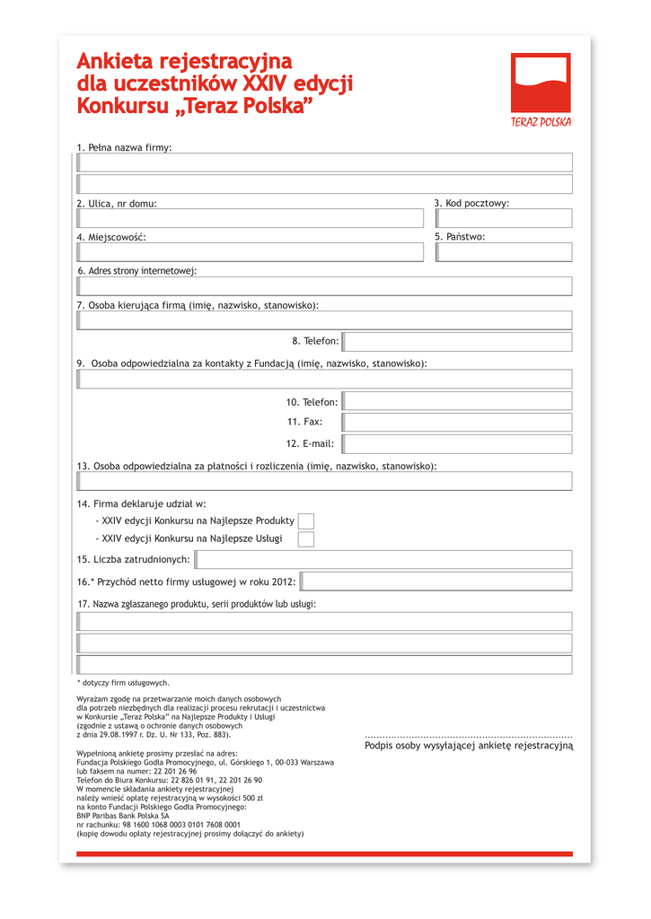 Ankieta rejestracyjna dla uczestników XXIV edycji Konkursu „Teraz Polska” 1. Pełna nazwa firmy: 2. Ulica, nr domu: 3. Kod pocztowy: 4. Miejscowość: 5. Państwo: 6. Adres strony internetowej: 7. Osoba kierująca firmą (imię, nazwisko, stanowisko): 8. Telefon: 9. Osoba odpowiedzialna za kontakty z Fundacją (imię, nazwisko, stanowisko): 10. Telefon: 11. Fax: 12. E-mail: 13. Osoba odpowiedzialna za płatności i rozliczenia (imię, nazwisko, stanowisko): 14. Firma deklaruje udział w: - XXIV edycji Konkursu na Najlepsze Produkty - XXIV edycji Konkursu na Najlepsze Usługi 15. Liczba zatrudnionych: 16.* Przychód netto firmy usługowej w roku 2012: 17. Nazwa zgłaszanego produktu, serii produktów lub usługi: * dotyczy firm usługowych. Wyrażam zgodę na przetwarzanie moich danych osobowych dla potrzeb niezbędnych dla realizacji procesu rekrutacji i uczestnictwa w Konkursie „Teraz Polska” na Najlepsze Produkty i Usługi (zgodnie z ustawą o ochronie danych osobowych z dnia 29.08.1997 r. Dz. U. Nr 133, Poz. 883). Wypełnioną ankietę prosimy przesłać na adres: Fundacja Polskiego Godła Promocyjnego, ul. Górskiego 1, 00-033 Warszawa lub faksem na numer: 22 201 26 96 Telefon do Biura Konkursu: 22 826 01 91, 22 201 26 90 W momencie składania ankiety rejestracyjnej należy wnieść opłatę rejestracyjną w wysokości 500 zł na konto Fundacji Polskiego Godła Promocyjnego: BNP Paribas Bank Polska SA nr rachunku: 98 1600 1068 0003 0101 7608 0001 (kopię dowodu opłaty rejestracyjnej prosimy dołączyć do ankiety) ....................................................................... Podpis osoby wysyłającej ankietę rejestracyjną