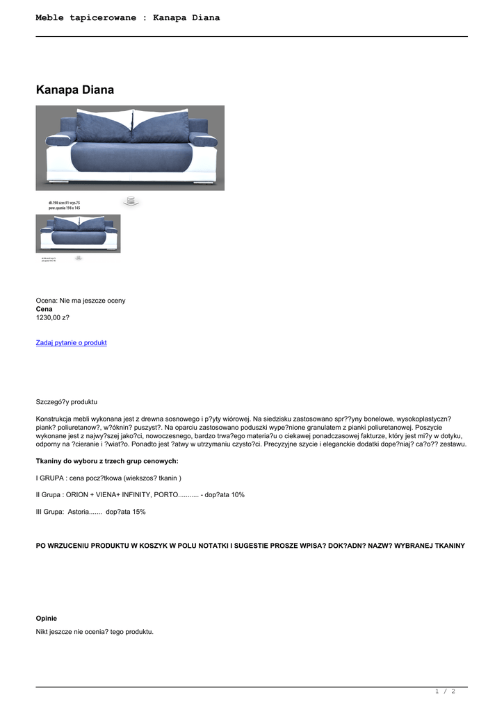 Meble tapicerowane : Kanapa Diana Kanapa Diana Ocena: Nie ma jeszcze oceny Cena 1230,00 z? Zadaj pytanie o produkt Szczegó?y produktu Konstrukcja mebli wykonana jest z drewna sosnowego i p?yty wiórowej. Na siedzisku zastosowano spr??yny bonelowe, wysokoplastyczn? piank? poliuretanow?, w?óknin? puszyst?. Na oparciu zastosowano poduszki wype?nione granulatem z pianki poliuretanowej. Poszycie wykonane jest z najwy?szej jako?ci, nowoczesnego, bardzo trwa?ego materia?u o ciekawej ponadczasowej fakturze, który jest mi?y w dotyku, odporny na ?cieranie i ?wiat?o. Ponadto jest ?atwy w utrzymaniu czysto?ci. Precyzyjne szycie i eleganckie dodatki dope?niaj? ca?o?? zestawu. Tkaniny do wyboru z trzech grup cenowych: I GRUPA : cena pocz?tkowa (wiekszos? tkanin ) II Grupa : ORION + VIENA+ INFINITY, PORTO........... - dop?ata 10% III Grupa: Astoria....... dop?ata 15% PO WRZUCENIU PRODUKTU W KOSZYK W POLU NOTATKI I SUGESTIE PROSZE WPISA? DOK?ADN? NAZW? WYBRANEJ TKANINY Opinie Nikt jeszcze nie ocenia? tego produktu. 1 / 2 Meble tapicerowane : Kanapa Diana 2 / 2 Powered by TCPDF (www.tcpdf.org)