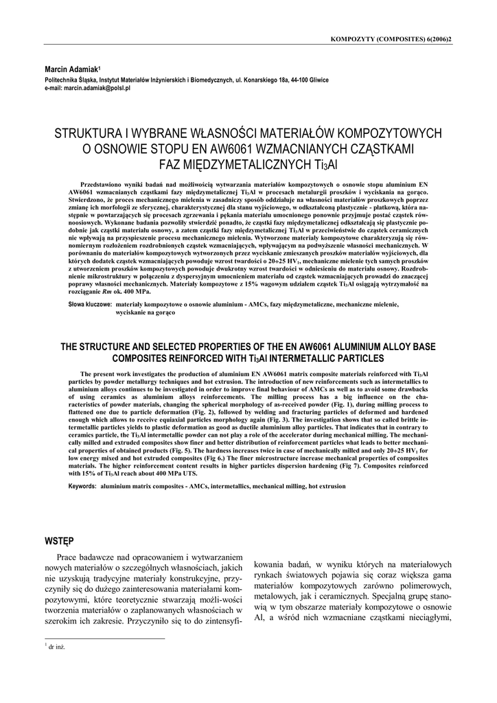 KOMPOZYTY (COMPOSITES) 6(2006)2 Marcin Adamiak1 Politechnika Śląska, Instytut Materiałów Inżynierskich i Biomedycznych, ul. Konarskiego 18a, 44-100 Gliwice e-mail: [email protected] STRUKTURA I WYBRANE WŁASNOŚCI MATERIAŁÓW KOMPOZYTOWYCH O OSNOWIE STOPU EN AW6061 WZMACNIANYCH CZĄSTKAMI FAZ MIĘDZYMETALICZNYCH Ti3Al Przedstawiono wyniki badań nad możliwością wytwarzania materiałów kompozytowych o osnowie stopu aluminium EN AW6061 wzmacnianych cząstkami fazy międzymetalicznej Ti3Al w procesach metalurgii proszków i wyciskania na gorąco. Stwierdzono, że proces mechanicznego mielenia w zasadniczy sposób oddziałuje na własności materiałów proszkowych poprzez zmianę ich morfologii ze sferycznej, charakterystycznej dla stanu wyjściowego, w odkształconą plastycznie - płatkową, która następnie w powtarzających się procesach zgrzewania i pękania materiału umocnionego ponownie przyjmuje postać cząstek równoosiowych. Wykonane badania pozwoliły stwierdzić ponadto, że cząstki fazy międzymetalicznej odkształcają się plastycznie podobnie jak cząstki materiału osnowy, a zatem cząstki fazy międzymetalicznej Ti3Al w przeciwieństwie do cząstek ceramicznych nie wpływają na przyspieszenie procesu mechanicznego mielenia. Wytworzone materiały kompozytowe charakteryzują się równomiernym rozłożeniem rozdrobnionych cząstek wzmacniających, wpływającym na podwyższenie własności mechanicznych. W porównaniu do materiałów kompozytowych wytworzonych przez wyciskanie zmieszanych proszków materiałów wyjściowych, dla których dodatek cząstek wzmacniających powoduje wzrost twardości o 20÷25 HV1, mechaniczne mielenie tych samych proszków z utworzeniem proszków kompozytowych powoduje dwukrotny wzrost twardości w odniesieniu do materiału osnowy. Rozdrobnienie mikrostruktury w połączeniu z dyspersyjnym umocnieniem materiału od cząstek wzmacniających prowadzi do znaczącej poprawy własności mechanicznych. Materiały kompozytowe z 15% wagowym udziałem cząstek Ti3Al osiągają wytrzymałość na rozciąganie Rm ok. 400 MPa. Słowa kluczowe: materiały kompozytowe o osnowie aluminium - AMCs, fazy międzymetaliczne, mechaniczne mielenie, wyciskanie na gorąco THE STRUCTURE AND SELECTED PROPERTIES OF THE EN AW6061 ALUMINIUM ALLOY BASE COMPOSITES REINFORCED WITH Ti3Al INTERMETALLIC PARTICLES The present work investigates the production of aluminium EN AW6061 matrix composite materials reinforced with Ti3Al particles by powder metallurgy techniques and hot extrusion. The introduction of new reinforcements such as intermetallics to aluminium alloys continues to be investigated in order to improve final behaviour of AMCs as well as to avoid some drawbacks of using ceramics as aluminium alloys reinforcements. The milling process has a big influence on the characteristics of powder materials, changing the spherical morphology of as-received powder (Fig. 1), during milling process to flattened one due to particle deformation (Fig. 2), followed by welding and fracturing particles of deformed and hardened enough which allows to receive equiaxial particles morphology again (Fig. 3). The investigation shows that so called brittle intermetallic particles yields to plastic deformation as good as ductile aluminium alloy particles. That indicates that in contrary to ceramics particle, the Ti3Al intermetallic powder can not play a role of the accelerator during mechanical milling. The mechanically milled and extruded composites show finer and better distribution of reinforcement particles what leads to better mechanical properties of obtained products (Fig. 5). The hardness increases twice in case of mechanically milled and only 20÷25 HV1 for low energy mixed and hot extruded composites (Fig 6.) The finer microstructure increase mechanical properties of composites materials. The higher reinforcement content results in higher particles dispersion hardening (Fig 7). Composites reinforced with 15% of Ti3Al reach about 400 MPa UTS. Keywords: aluminium matrix composites - AMCs, intermetallics, mechanical milling, hot extrusion WSTĘP Prace badawcze nad opracowaniem i wytwarzaniem nowych materiałów o szczególnych własnościach, jakich nie uzyskują tradycyjne materiały konstrukcyjne, przyczyniły się do dużego zainteresowania materiałami kompozytowymi, które teoretycznie stwarzają możli-wości tworzenia materiałów o zaplanowanych własnościach w szerokim ich zakresie. Przyczyniło się to do zintensyfi1 dr inż. kowania badań, w wyniku których na materiałowych rynkach światowych pojawia się coraz większa gama materiałów kompozytowych zarówno polimerowych, metalowych, jak i ceramicznych. Specjalną grupę stanowią w tym obszarze materiały kompozytowe o osnowie Al, a wśród nich wzmacniane cząstkami nieciągłymi, 71 Struktura i wybrane własności materiałów kompozytowych o osnowie stopu EN AW6061 … uzyskujące wyższy poziom własności w porównaniu do stopów bez cząstek wzmacniających, dodatkowo materiały kompozytowe wzmacniane dyspersyjnymi cząstkami wykazują wyższą stabilność temperaturową oraz lepszą odporność na zużycie. W przypadku materiałów kompozytowych o osnowie aluminiowej do chwili obecnej najwięcej badań zostało zrealizowanych i opisanych w literaturze dla ceramicznych faz wzmacniających, głównie Al2O3, Si3N4 i SiC. Wykorzystanie nowych faz wzmacniających ma na celu przede wszystkim uniknięcie niedomagań występujących w tych materiałach w przypadku zastosowania ceramicznych faz wzmacniających, jak również poprawę własności użytkowych nowo opracowanych materiałów kompozytowych. Zastosowanie cząstek faz międzymetalicznych jako odpowiedniego materiału wzmacniającego w stopach aluminium zaproponowali w latach 80. XX wieku Yamada i Unakoshi. W ostatnich latach w procesach wytwarzania materiałów kompozytowych znalazły zastosowanie procesy mechanicznego stopowania oraz mechaniczne
