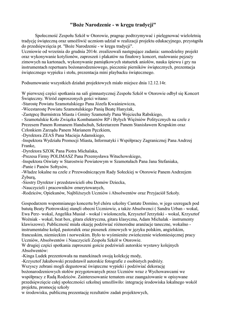 "Boże Narodzenie - w kręgu tradycji" Społeczność Zespołu Szkół w Otorowie, pragnąc podtrzymywać i pielęgnować wieloletnią tradycję świąteczną oraz umożliwić uczniom udział w realizacji projektu edukacyjnego, przystąpiła do przedsięwzięcia pt. "Boże Narodzenie - w kręgu tradycji". Uczniowie od września do grudnia 2014r. zrealizowali następujące zadania: samodzielny projekt oraz wykonywanie kotylionów, zaproszeń i plakatów na finałowy koncert, malowanie pejzaży zimowych na kartonach, wykonywanie pamiątkowych statuetek aniołów, nauka śpiewu i gry na instrumentach repertuaru bożonarodzeniowego, pieczenie pierników świątecznych, prezentacja świątecznego wypieku i stołu, prezentacja mini playbacku świątecznego. Podsumowanie wszystkich działań projektowych miało miejsce dnia 12.12.14r. W pierwszej części spotkania na sali gimnastycznej Zespołu Szkół w Otorowie odbył się Koncert Świąteczny. Wśród zaproszonych gości witano: -Starostę Powiatu Szamotulskiego Pana Józefa Kwaśniewicza, -Wicestarostę Powiatu Szamotulskiego Panią Beatę Hanyżak, -Zastępcę Burmistrza Miasta i Gminy Szamotuły Pana Wojciecha Rabskiego, - Szamotulskie Koło Związku Kombatantów RP i Byłych Więźniów Politycznych na czele z Prezesem Panem Romanem Handschuh, Sekretarzem Panem Stanisławem Krupskim oraz Członkiem Zarządu Panem Marianem Pęczkiem, -Dyrektora ZEAS Pana Macieja Adamskiego, -Inspektora Wydziału Promocji Miasta, Informatyki i Współpracy Zagranicznej Pana Andrzej Franke, -Dyrektora SZOK Pana Piotra Michalaka, -Prezesa Firmy POLIMASZ Pana Przemysława Wituchowskiego, -Inspektora Oświaty w Starostwie Powiatowym w Szamotułach Pana Jana Stefaniaka, -Panie i Panów Sołtysów, -Władze lokalne na czele z Przewodniczącym Rady Sołeckiej w Otorowie Panem Andrzejem Żyburą, -Siostry Dyrektor i przedstawicieli obu Domów Dziecka, -Nauczycieli i pracowników emerytowanych, -Rodziców, Opiekunów, Najbliższych Uczniów i Absolwentów oraz Przyjaciół Szkoły. Gospodarzem wspomnianego koncertu był chóru szkolny Cantate Domino, w jego szeregach pod batutą Beaty Piotrowskiej stanęli obecni Uczniowie, a także Absolwenci ( Sandra Urban - wokal, Ewa Perz- wokal, Angelika Musiał - wokal i wiolonczela, Krzysztof Jerzyński - wokal, Krzysztof Woźniak - wokal, beat box, gitara elektryczna, gitara klasyczna, Adam Michalak - instrumenty klawiszowe). Publiczność miała okazję podziwiać różnorodne aranżacje taneczne, wokalno instrumentalne kolęd, pastorałek oraz piosenek zimowych w języku polskim, angielskim, francuskim, niemieckim i norweskim. Było to wyśmienite zwieńczenie wielomiesięcznej pracy Uczniów, Absolwentów i Nauczycieli Zespołu Szkół w Otorowie. W drugiej części spotkania zaproszeni goście podziwiali autorskie wystawy kolejnych Absolwentów: -Kinga Ludek prezentowała na manekinach swoją kolekcję mody, -Krzysztof Jakubowski przedstawił autorskie fotografie z osobistych podróży. Wszyscy zebrani mogli degustować świąteczne wypieki i podziwiać dekorację bożonarodzeniowych stołów przygotowanych przez Uczniów wraz z Wychowawcami we współpracy z Radą Rodziców. Zainteresowanie tematem oraz zaangażowanie w opisywane przedsięwzięcie całej społeczności szkolnej umożliwiło: integrację środowiska lokalnego wokół projektu, promocję szkoły w środowisku, publiczną prezentację rezultatów zadań projektowych, Dyrektor Zespołu Szkół w Otorowie Pani Marzenna Kędziora składa podziękowania wszystkim Uczniom, Nauczycielom, Pracownikom i Radzie Rodziców za zaangażowanie w projekt, a także: Szamotulskiemu Ośrodkowi Kultury za nagłośnienie i obsługę techniczną koncertu, Firmie POLIMASZ za kartony do malowania pejzaży, Pani Bożenie Przybył za pomoc przy pieczeniu pierników, Absolwentom za prezentowane umiejętności i poświęcony czas.