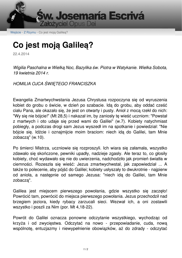 Wejście - Z Rzymu - Co jest moją Galileą? Co jest moją Galileą? 22.4.2014 Wigilia Paschalna w Wielką Noc, Bazylika św. Piotra w Watykanie. Wielka Sobota, 19 kwietnia 2014 r. HOMILIA OJCA ŚWIĘTEGO FRANCISZKA Ewangelia Zmartwychwstania Jezusa Chrystusa rozpoczyna się od wyruszenia kobiet do grobu o świcie, w dzień po szabacie. Idą do grobu, aby oddać cześć ciału Pana, ale okazało się, że jest on otwarty i pusty. Anioł z mocą rzekł do nich: "Wy się nie bójcie!" (Mt 28,5) i nakazał im, by zaniosły tę wieść uczniom: "Powstał z martwych i oto udaje się przed wami do Galilei" (w.7). Kobiety natychmiast pobiegły, a podczas drogi sam Jezus wyszedł im na spotkanie i powiedział: "Nie bójcie się. Idźcie i oznajmijcie moim braciom: niech idą do Galilei, tam Mnie zobaczą" (w.10). Po śmierci Mistrza, uczniowie się rozproszyli. Ich wiara się załamała, wszystko zdawało się skończone, pewniki upadły, nadzieje zgasły. Ale teraz to, co głosiły kobiety, choć wydawało się nie do uwierzenia, nadchodziło jak promień światła w ciemności. Rozeszła się wieść: Jezus zmartwychwstał, jak zapowiedział ... A także to polecenie, aby pójść do Galilei; kobiety usłyszały to dwukrotnie - najpierw od anioła, a następnie od samego Jezusa: "niech idą do Galilei, tam Mnie zobaczą". Galilea jest miejscem pierwszego powołania, gdzie wszystko się zaczęło! Powrócić tam, powrócić do miejsca pierwszego powołania. Jezus przechodził nad brzegiem jeziora, kiedy rybacy zarzucali sieci. Wezwał ich, a oni zostawili wszystko i poszli za Nim (por. Mt 4,18-22). Powrót do Galilei oznacza ponowne odczytanie wszystkiego, wychodząc od krzyża i od zwycięstwa. Odczytać na nowo - przepowiadanie, cuda, nową wspólnotę, entuzjazmy i niewypełnienie obowiązków, aż do zdrady - odczytać 1/2 ponownie wszystko wychodząc od końca, który jest nowym początkiem, od tego najwyższego aktu miłości. Także dla każdego z nas u źródła drogi z Jezusem jest jakaś "Galilea". "Pójść do Galilei" oznacza coś pięknego, oznacza dla nas odkrycie na nowo naszego chrztu jako żywego źródła, zaczerpnięcie nowej energii u korzeni naszej wiary i naszego doświadczenia chrześcijańskiego. Powrót do Galilei oznacza przede wszystkim powrót tam, do tego żywego punktu, w którym Boża łaska dotknęła mnie na początku drogi. To od tej iskry mogą rozpalić ogień na dzisiaj, na każdy dzień, i zanieść ciepło i światło do moich braci i sióstr. Od tej iskry zapala się pokorna radość, taka radość, która nie uwłacza cierpieniu i rozpaczy, radość dobra i łagodna. W życiu chrześcijanina, po chrzcie jest też "Galilea" bardziej egzystencjalna: doświadczenie osobistego spotkania z Jezusem Chrystusem, który wezwał mnie do pójścia za Nim i uczestniczenia w Jego misji. W tym sensie powrót do Galilei oznacza strzeżenie w sercu żywej pamięci tego wezwania, kiedy Jezus przechodził na mojej drodze, miłosiernie na mnie spojrzał, poprosił mnie, bym za Nim poszedł. Oznacza odzyskanie pamięci o tej chwili, kiedy Jego oczy spotkały się z moimi, chwili w której pozwolił mi odczuć, że mnie kocha. Dzisiaj, tej nocy każdy z nas może zadać sobie pytanie: co jest moją Galileą? Gdzie jest moja Galilea? Czy o niej pamiętam? Czy o niej zapomniałem? Czy poszedłem drogami i ścieżkami, które sprawiły, że o niej zapomniałem? Panie, pomóż mi: powiedz mi, co jest moją Galileą; Ty wiesz, że chcę tam wrócić, aby Ciebie spotkać i dać się objąć Twoim miłosierdziem. Ewangelia Wielkanocy jest jasna: trzeba tam powrócić, aby zobaczyć Jezusa zmartwychwstałego i stać się świadkami Jego zmartwychwstania. To nie jest krok wstecz, to nie jest nostalgia. Jest to powrót do pierwszej miłości, aby otrzymać ogień, który Jezus zapalił w świecie i zanieść go wszystkim, aż po krańce ziemi. "Galilea pogan" (Mt 4,15; Iz 8,23): perspektywy Zmartwychwstałego, perspektywy Kościoła; intensywne pragnienie spotkania ... Wyruszmy w drogę! 2/2 Powered by TCPDF (www.tcpdf.org)