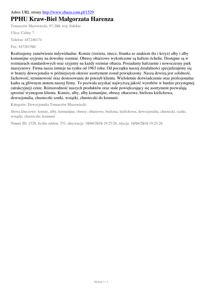 Adres URL strony http://www.ebaza.com.pl/1529 PPHU Kraw-Biel Małgorzata Harenza Tomaszów Mazowiecki, 97-200, woj. łódzkie Ulica: Celiny 7 Telefon: 447246174 Fax: 447261504 Realizujemy zamówienia indywidualne. Komże (żorżeta, strecz, firanka ze znakiem ihs i krzyż) alby i alby komunijne szyjemy na dowolny rozmiar. Obrusy ołtarzowe wykończone są haftem richelie. Dostępne są w rozmiarach standardowych oraz szyjemy na każdy rozmiar ołtarza. Posiadamy hafciarnie i nowoczesny park maszynowy. Firma nasza istnieje na rynku od 1963 roku. Od początku naszej działalności specjalizujemy się w branży dewocjonalia w późniejszym okresie asortyment został powiększony. Naszą dewizą jest solidność, fachowość, terminowość oraz dostosowanie do potrzeb klienta. Wieloletnie doświadczenie oraz profesjonalna kadra są głównym atutem naszej firmy. To pozwala uzyskać najwyższą jakość wyrobów w bardzo przystępnej (atrakcyjnej) cenie. Różnorodność naszych produktów oraz stale powiększający się asortyment pozwalają sprostać wymogom klienta. Komże, alby, alby komunijne, obrusy ołtarzowe, bielizna kielichowa, dewocjonalia, chusteczki szatki, wstążki, chusteczki do komunii. Kategorie: Dewocjonalia Tomaszów Mazowiecki Słowa kluczowe: komże, alby, komunijne, obrusy, ołtarzowe, bielizna, kielichowa, dewocjonalia, chustecki, szatki, wstążki, chusteczki, komunii Numer ID: 1529, liczba odsłon: 551, aktywacja: 10/04/2010 19:25:26, edycja: 10/04/2010 19:25:26 Strona 1 / 1