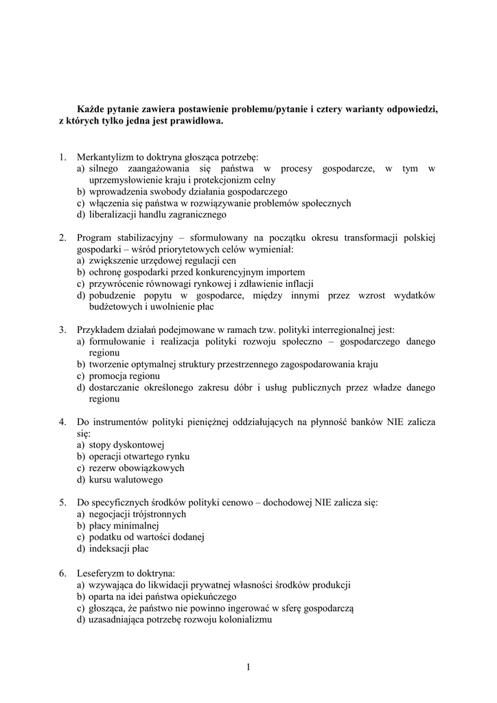 Każde pytanie zawiera postawienie problemu/pytanie i cztery warianty odpowiedzi, z których tylko jedna jest prawidłowa. 1. Merkantylizm to doktryna głosząca potrzebę: a) silnego zaangażowania się państwa w procesy gospodarcze, uprzemysłowienie kraju i protekcjonizm celny b) wprowadzenia swobody działania gospodarczego c) włączenia się państwa w rozwiązywanie problemów społecznych d) liberalizacji handlu zagranicznego w tym w 2. Program stabilizacyjny – sformułowany na początku okresu transformacji polskiej gospodarki – wśród priorytetowych celów wymieniał: a) zwiększenie urzędowej regulacji cen b) ochronę gospodarki przed konkurencyjnym importem c) przywrócenie równowagi rynkowej i zdławienie inflacji d) pobudzenie popytu w gospodarce, między innymi przez wzrost wydatków budżetowych i uwolnienie płac 3. Przykładem działań podejmowane w ramach tzw. polityki interregionalnej jest: a) formułowanie i realizacja polityki rozwoju społeczno – gospodarczego danego regionu b) tworzenie optymalnej struktury przestrzennego zagospodarowania kraju c) promocja regionu d) dostarczanie określonego zakresu dóbr i usług publicznych przez władze danego regionu 4. Do instrumentów polityki pieniężnej oddziałujących na płynność banków NIE zalicza się: a) stopy dyskontowej b) operacji otwartego rynku c) rezerw obowiązkowych d) kursu walutowego 5. Do specyficznych środków polityki cenowo – dochodowej NIE zalicza się: a) negocjacji trójstronnych b) płacy minimalnej c) podatku od wartości dodanej d) indeksacji płac 6. Leseferyzm to doktryna: a) wzywająca do likwidacji prywatnej własności środków produkcji b) oparta na idei państwa opiekuńczego c) głosząca, że państwo nie powinno ingerować w sferę gospodarczą d) uzasadniająca potrzebę rozwoju kolonializmu 1 7. Wśród głównych kosztów działań stabilizacyjnych, realizowanych w Polsce na początku lat 90-tych, można wymienić: a) gwałtowny wzrost bezrobocia i głęboką recesję b) gwałtowny wzrost kursu złotego i zahamowanie polskiego eksportu c) zachwianie równowagi na rynku towarów d) silny wzrost wydatków zbrojeniowych 8. Polityka intraregionalna jest polityką realizowaną przez: a) władze regionalne b) centralne organy władzy państwowej c) organy ponadnarodowe ugrupowań integracyjnych d) zorganizowane grupy społeczne podejmujące działania w celu wywierania wpływu na sprawy publiczne (jak np. związki zawodowe, stowarzyszenia) 9. W ramach funkcji alokacyjnej polityki budżetowej państwo: a) oddziałuje na ostateczny podział dochodów indywidualnych b) dąży do zapewnienia równowagi gospodarczej c) dokonuje podziału środków między sektor publiczny i prywatny, oddziałując na dalszą dystrybucję zasobów w ramach tych sektorów d) dąży do osiągania wysokiego stopnia wykorzystania potencjału wytwórczego 10. Indeksacji, jako instrumentu polityki cenowo-dochodowej, NIE stosuje się w odniesieniu do: a) płac b) świadczeń społecznych c) progów podatkowych d) zysków 11. Normatywny charakter nauki o polityce gospodarczej oznacza: a) obiektywne poznawanie i opis rzeczywistości b) tworzenie podstaw do przewidywania reakcji gospodarki na zmianę warunków jej działania c) wskazywanie pożądanych kierunków oraz sposobów oddziaływania na procesy gospodarcze d) szukanie odpowiedzi na pytanie, dlaczego gospodarka działa w określony sposób 12. Zgodnie z teorią racjonalnych oczekiwań polityka gospodarcza: a) mogłaby być skuteczna, gdyby nie była całkowitym zaskoczeniem dla ludzi b) nie jest skuteczna, gdyż jej rezultaty są niwelowane przez reakcje społeczeństwa przewidującego jej skutki c) przynosi oczekiwane efekty, jeżeli jest realizowana w sposób racjonalny d) jest bardzo skuteczna, bo podmioty gospodarcze cechuje nieracjonalność 13. Przekształcenia własnościowe w okresie transformacji gospodarki polskiej były istotnym elementem: a) programu łagodzenia dysproporcji dochodowych i majątkowych wśród społeczeństwa b) działań stabilizacyjnych państwa c) przeobrażeń ustroju społeczno - gospodarczego d) działań podjętych w celu wyjścia z recesji transformacyjnej 2 14. Polityka interregionalna jest polityką będącą w gestii: a) wyłącznie władz samorządowych b) władz regionalnych c) organów ponadnarodowych ugrupowań integracyjnych d) centralnych organów władzy państwowej 15. Funkcja redystrybucyjna polityki budżetowej służy: a) wpływaniu na podział dochodów w społeczeństwie przez redukowanie i uzupełnianie dochodów indywidualnych b) zapewnieniu stabilności cen c) zapewnieniu wysokiego tempa wzrostu gospodarczego d) osiągnięciu równowagi bilansu płatniczego 16. Pozytywny charakter nauki o polityce gospodarczej oznacza: a) dostarczanie zaleceń i rekomendacji opartych na subiektywnych sądach wartościujących b) obiektywne poznawanie i opis rzeczywistości c) wskazywanie pożądanych kierunków oraz sposobów oddziaływania na procesy gospodarcze d) formułowanie kryteriów oceny posunięć interwencyjnych państwa 17. Przedstawiciele nurtu neoliberalnego postulują: a) ograniczenie zakresu interwencji polityki gospodarczej i obronę zasad wolnego rynku b) zwiększenie roli sektora publicznego w gospodarce c) wzmocnienie siły związków zawodowych d) zwiększanie wpływów podatkowych w celu finansowania funkcji opiekuńczych państwa 18. Narzędziami polityki przemysłowej zaliczanymi do instrumentów bodźcowych są: a) zakupy rządowe b) regulacje zabezpieczające przed nadużywaniem pozycji dominującej przez przedsiębiorstwa c) ulgi podatkowe i nisko oprocentowane kredyty d) działania państwa jako właściciela przedsiębiorstw w wybranych sektorach 19. Uzasadnieniem interwencji państwa w dziedzinie ochrony środowiska naturalnego jest: a) zawodność mechanizmu rynkowego w tej dziedzinie b) utrata przez środowisko naturalne charakteru dobra publicznego c) występowanie pozytywnyc