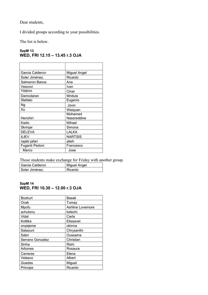 Dear students, I divided groups according to your possibilities. The list is below. SzpM 13 WED, FRI 12.15 – 13.45 r.3 OJA Garcia Calderon Soler Jiménez. Salmeron Banos Vescovi Yildirim Damodaran Stellato Ng Xu Henchiri Kadic Skrinjar DELEVA ILIEV rajabi jafari Fuganti Pedoni Marco Miguel Angel Ricardo Ana Ivan Cinar Mridula Eugenio Jovin Weiquan Mohamed Nassreddine Mihael Simona LALKA NARTSIS atieh Francesco Jose Those students make exchange for Friday with another group. Garcia Calderon Soler Jiménez. Miguel Angel Ricardo SzpM 14 WED, FRI 10.30 – 12.00 r.3 OJA Bozkurt Ocak Mpofu achulonu Vidal Kottika onyejeme Salaouni Sabri Serrano Gonzalez Sinha Arbones Carreras Velasco Guedes Principe Basak Tumay Ashline Lovemore kelechi Carla Elissavet obinna Chrysanthi Oussama Christian Rishi Rosaura Elena Albert Miguel Ricardo Those students make exchange for Friday with another group. Mpofu achulonu Ashline Lovemore kelechi