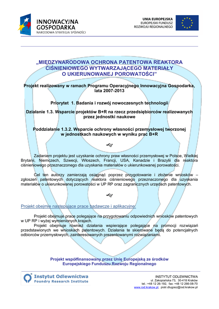 „MIĘDZYNARODOWA OCHRONA PATENTOWA REAKTORA CIŚNIENIOWEGO WYTWARZAJĄCEGO MATERIAŁY O UKIERUNOWANEJ POROWATOŚCI” Projekt realizowany w ramach Programu Operacyjnego Innowacyjna Gospodarka, lata 2007-2013 Priorytet 1. Badania i rozwój nowoczesnych technologii Działanie 1.3. Wsparcie projektów B+R na rzecz przedsiębiorców realizowanych przez jednostki naukowe Poddziałanie 1.3.2. Wsparcie ochrony własności przemysłowej tworzonej w jednostkach naukowych w wyniku prac B+R Zadaniem projektu jest uzyskanie ochrony praw własności przemysłowej w Polsce, Wielkiej Brytanii, Niemczech, Szwecji, Włoszech, Francji, USA, Kanadzie i Brazylii dla reaktora ciśnieniowego przeznaczonego dla uzyskania materiałów o ukierunkowanej porowatości. Cel ten autorzy zamierzają osiągnąć poprzez przygotowanie i złożenie wniosków – zgłoszeń patentowych dotyczących reaktora ciśnieniowego przeznaczonego dla uzyskania materiałów o ukierunkowanej porowatości w UP RP oraz zagranicznych urzędach patentowych. Projekt obejmie następujące prace badawcze i aplikacyjne: Projekt obejmuje prace polegające na przygotowaniu odpowiednich wniosków patentowych w UP RP i wyżej wymienionych krajach. Projekt obejmuje również działania wspierające polegające na promocji rozwiązań przedstawionych we wnioskach patentowych. Działania te skierowane będą do potencjalnych odbiorców przemysłowych, zainteresowanych prezentowanymi rozwiązaniami. Projekt współfinansowany przez Unię Europejską ze środków Europejskiego Funduszu Rozwoju Regionalnego INSTYTUT ODLEWNICTWA ul. Zakopiańska 73, 30-418 Kraków tel.: +48 12 26-192, fax: +48 12 266-08-70 www.iod.krakow.pl, [email protected]