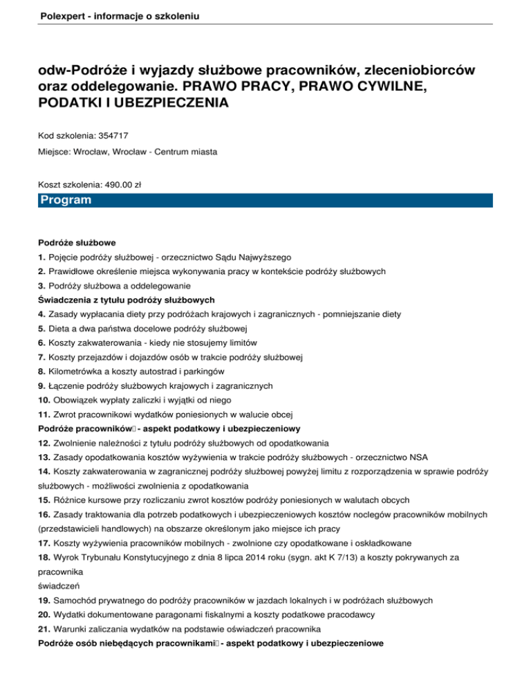 Polexpert - informacje o szkoleniu odw-Podróże i wyjazdy służbowe pracowników, zleceniobiorców oraz oddelegowanie. PRAWO PRACY, PRAWO CYWILNE, PODATKI I UBEZPIECZENIA Kod szkolenia: 354717 Miejsce: Wrocław, Wrocław - Centrum miasta Koszt szkolenia: 490.00 zł Program Podróże służbowe 1. Pojęcie podróży służbowej - orzecznictwo Sądu Najwyższego 2. Prawidłowe określenie miejsca wykonywania pracy w kontekście podróży służbowych 3. Podróży służbowa a oddelegowanie Świadczenia z tytułu podróży służbowych 4. Zasady wypłacania diety przy podróżach krajowych i zagranicznych - pomniejszanie diety 5. Dieta a dwa państwa docelowe podróży służbowej 6. Koszty zakwaterowania - kiedy nie stosujemy limitów 7. Koszty przejazdów i dojazdów osób w trakcie podróży służbowej 8. Kilometrówka a koszty autostrad i parkingów 9. Łączenie podróży służbowych krajowych i zagranicznych 10. Obowiązek wypłaty zaliczki i wyjątki od niego 11. Zwrot pracownikowi wydatków poniesionych w walucie obcej Podróże pracowników - aspekt podatkowy i ubezpieczeniowy 12. Zwolnienie należności z tytułu podróży służbowych od opodatkowania 13. Zasady opodatkowania kosztów wyżywienia w trakcie podróży służbowych - orzecznictwo NSA 14. Koszty zakwaterowania w zagranicznej podróży służbowej powyżej limitu z rozporządzenia w sprawie podróży służbowych - możliwości zwolnienia z opodatkowania 15. Różnice kursowe przy rozliczaniu zwrot kosztów podróży poniesionych w walutach obcych 16. Zasady traktowania dla potrzeb podatkowych i ubezpieczeniowych kosztów noclegów pracowników mobilnych (przedstawicieli handlowych) na obszarze określonym jako miejsce ich pracy 17. Koszty wyżywienia pracowników mobilnych - zwolnione czy opodatkowane i oskładkowane 18. Wyrok Trybunału Konstytucyjnego z dnia 8 lipca 2014 roku (sygn. akt K 7/13) a koszty pokrywanych za pracownika świadczeń 19. Samochód prywatnego do podróży pracowników w jazdach lokalnych i w podróżach służbowych 20. Wydatki dokumentowane paragonami fiskalnymi a koszty podatkowe pracodawcy 21. Warunki zaliczania wydatków na podstawie oświadczeń pracownika Podróże osób niebędących pracownikami - aspekt podatkowy i ubezpieczeniowe Polexpert - informacje o szkoleniu 22. Zasady zwolnienia diet i zwrotu kosztów podróży osób zatrudnionych na umowach cywilnoprawnych - praktyka organów podatkowych 23. Koszty dojazdu członków zarządu i członków rad nadzorczych na posiedzenia - zwolnione czy opodatkowane 24. Podstawa opodatkowania osób na umowach cywilnoprawnych 25. Podstawa wymiaru składek osób na umowach cywilnoprawnych odbywających podróże - różnice pomiędzy "podróżami służbowymi" a oddelegowaniem osób na umowach cywilnoprawnych 26. Warunki wyłączenia spod ubezpieczeń wydatków związanych z podróżami osób na umowach cywilnoprawnych 27. Czy zwrócone koszty podróży osób zatrudnionych na umowach cywilnoprawnych należy wykazywać w deklaracjach i informacjach podatkowych 28. Zaliczenia diet i kosztów podróży osób zatrudnionych na umowach cywilnoprawnych a koszty podatkowe przedsiębiorcy - praktyka organów podatkowych 29. Dokumentowanie kosztów związanych z podróżami osób zatrudnionych na umowach cywilnoprawnych 30. Oświadczenia osób na umowach cywilnoprawnych a zwolnienie zwróconych wydatków od opodatkowania i zaliczanie ich do podatkowych kosztów zleceniodawcy 31. Rozliczać podróże służbowe samozatrudnionych 32. Czy wydatki związane z podróżami samozatrudnionych może ponosić zleceniodawca Prowadzący