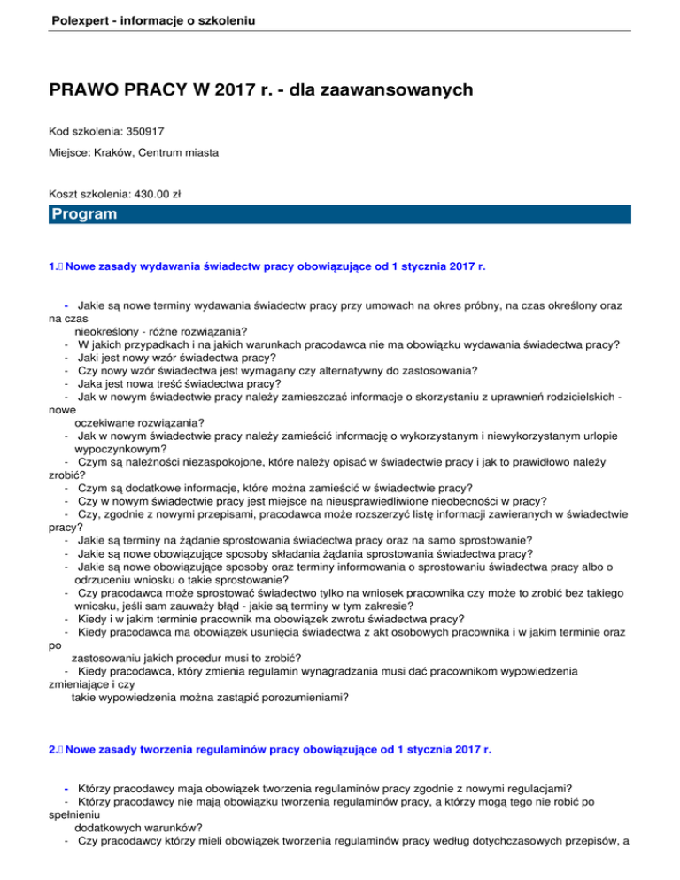 Polexpert - informacje o szkoleniu PRAWO PRACY W 2017 r. - dla zaawansowanych Kod szkolenia: 350917 Miejsce: Kraków, Centrum miasta Koszt szkolenia: 430.00 zł Program 1. Nowe zasady wydawania świadectw pracy obowiązujące od 1 stycznia 2017 r. - Jakie są nowe terminy wydawania świadectw pracy przy umowach na okres próbny, na czas określony oraz na czas nieokreślony - różne rozwiązania? - W jakich przypadkach i na jakich warunkach pracodawca nie ma obowiązku wydawania świadectwa pracy? - Jaki jest nowy wzór świadectwa pracy? - Czy nowy wzór świadectwa jest wymagany czy alternatywny do zastosowania? - Jaka jest nowa treść świadectwa pracy? - Jak w nowym świadectwie pracy należy zamieszczać informacje o skorzystaniu z uprawnień rodzicielskich nowe oczekiwane rozwiązania? - Jak w nowym świadectwie pracy należy zamieścić informację o wykorzystanym i niewykorzystanym urlopie wypoczynkowym? - Czym są należności niezaspokojone, które należy opisać w świadectwie pracy i jak to prawidłowo należy zrobić? - Czym są dodatkowe informacje, które można zamieścić w świadectwie pracy? - Czy w nowym świadectwie pracy jest miejsce na nieusprawiedliwione nieobecności w pracy? - Czy, zgodnie z nowymi przepisami, pracodawca może rozszerzyć listę informacji zawieranych w świadectwie pracy? - Jakie są terminy na żądanie sprostowania świadectwa pracy oraz na samo sprostowanie? - Jakie są nowe obowiązujące sposoby składania żądania sprostowania świadectwa pracy? - Jakie są nowe obowiązujące sposoby oraz terminy informowania o sprostowaniu świadectwa pracy albo o odrzuceniu wniosku o takie sprostowanie? - Czy pracodawca może sprostować świadectwo tylko na wniosek pracownika czy może to zrobić bez takiego wniosku, jeśli sam zauważy błąd - jakie są terminy w tym zakresie? - Kiedy i w jakim terminie pracownik ma obowiązek zwrotu świadectwa pracy? - Kiedy pracodawca ma obowiązek usunięcia świadectwa z akt osobowych pracownika i w jakim terminie oraz po zastosowaniu jakich procedur musi to zrobić? - Kiedy pracodawca, który zmienia regulamin wynagradzania musi dać pracownikom wypowiedzenia zmieniające i czy takie wypowiedzenia można zastąpić porozumieniami? 2. Nowe zasady tworzenia regulaminów pracy obowiązujące od 1 stycznia 2017 r. - Którzy pracodawcy maja obowiązek tworzenia regulaminów pracy zgodnie z nowymi regulacjami? - Którzy pracodawcy nie mają obowiązku tworzenia regulaminów pracy, a którzy mogą tego nie robić po spełnieniu dodatkowych warunków? - Czy pracodawcy którzy mieli obowiązek tworzenia regulaminów pracy według dotychczasowych przepisów, a Polexpert - informacje o szkoleniu nie mają takiego obowiązku zgodnie z nowymi regulacjami, mogą z tych regulaminów zrezygnować? - Jakie kwestie, zgodnie z nowymi przepisami, muszą być uregulowane w regulaminie wynagradzania, a jakie pracodawca może, ale nie musi zawierać w jego treści? - Jakie są najczęściej występujące błędy w treści regulaminów pracy? - Jak zmienia się treść informacji o warunkach zatrudnienia, którą trzeba wręczyć pracownikom, w związku z zawężeniem kręgu pracodawców zobowiązanych do tworzenia regulaminu wynagradzania? - Gdzie powinny być uregulowane kwestie, które dotychczas pracodawca miał obowiązek zamieszczać w regulaminie pracy po zniesieniu obowiązku tworzenia takiego regulaminu w stosunku do znacznej większości pracodawców? - Jakie kwestie warto zapisać w regulaminie pracy, a jakich lepiej nie robić, zgodnie nowymi przepisami? 3. Nowa stawka wynagrodzenia minimalnego od 1 stycznia 2017 r. - Jaka jest wysokość minimalnego wynagrodzenia w 2017 r. - Jaka jest wysokość i nowe zasady ustalania wynagrodzenia minimalnego w pierwszym roku pracy? - Kiedy obowiązuje i do kogo ma zastosowanie stawka godzinowa wynagrodzenia minimalnego? - Czy pracodawca może ukształtować wynagrodzenie pracownika na poziomie niższym niż minimalne - kiedy jest to dopuszczalne i jakie są tego konsekwencje prawne i faktyczne? - Jaki wpływ na wynagrodzenia pochodne ma wynagrodzenie minimalne? - Jakich nowych składników nie wlicza się do stawki minimalnego wynagrodzenia? 4. Nowe przepisy dotyczące pracodawców zobowiązanych do tworzenia ZFŚS - Którzy pracodawcy maja obowiązek tworzenia ZFŚS pracy zgodnie z nowymi regulacjami? - Którzy pracodawcy nie mają obowiązku tworzenia ZFŚS, a którzy mogą tego nie robić po zmianie przepisów? - Czy pracodawcy którzy mieli obowiązek tworzenia ZFŚS według dotychczasowych przepisów, a nie mają takiego obowiązku zgodnie z nowymi regulacjami, mogą z tworzenia funduszu zrezygnować? 5. Nawiązanie umowy o pracę z zastosowaniem nowych przepisów - Jakie rodzaje umów o pracę można wykorzystania w 2017 r. - Jakie są nowe zasady zawierania umów na okres próbny? - Ile i jakiej długości umowy na okres próbny mogą być zawierane z jednym pracownikiem po zmianie przepisów? - Jaki jest okres wypowiedzenia umowy na okres próbny? - Ile umów terminowych można podpisać z jednym pracownikiem? - Jakie jest ograniczenie co do długości trwania jednej lub kilku umów na czas określony? - Czy w ograniczeniu długości lub ilości umów na czas określony mają znaczenie przerwy pomiędzy tymi umowami? - W jakich okolicznościach pracodawca nie jest ograniczony ilością ani długością umowy na czas określony? - Jakie mogą być okoliczności uzasadniające podpisanie długiej umowy na czas określony? - Z jakimi dodatkowymi obowiązkami wiąże się podpisanie długiej umowy na czas określony? - Jakie są konsekwencje zawarcia umowy na czas dłuższy niż dopuszczony nowymi przepisami lub w większej liczbie niż dopuszczalna? Polexpert - informacje o szkoleniu - Jaki jest okres wypowiedzenia umowy na czas określony zgodnie z nowymi regulacjami? - Czy pracodawca, w związku z nowymi przepisami, ma obowiązek uzasadnić wypowiedzenie umowy na czas okre