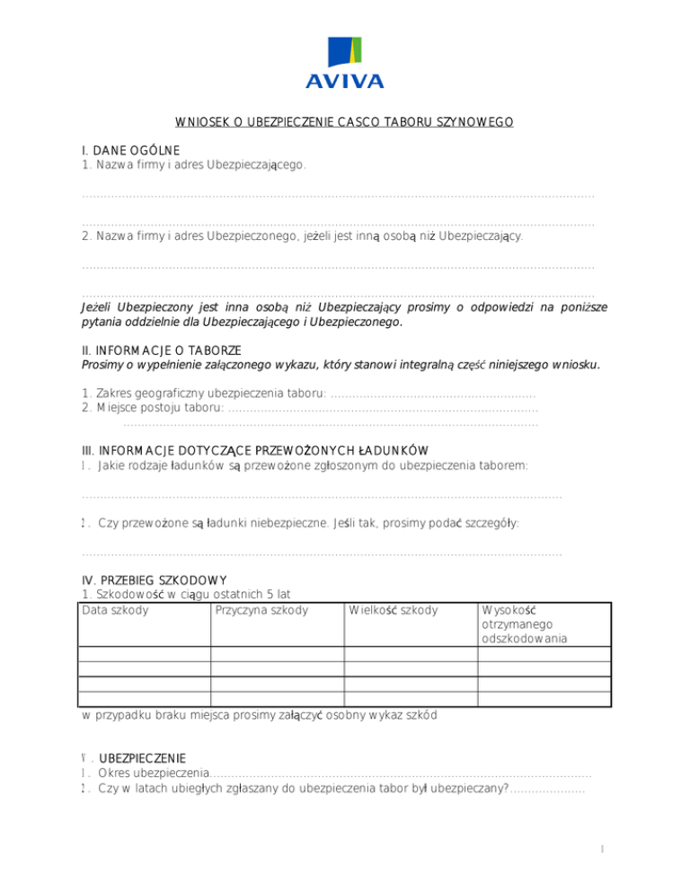 WNIOSEK O UBEZPIECZENIE CASCO TABORU SZYNOWEGO I. DANE OGÓLNE 1. Nazwa firmy i adres Ubezpieczaj cego. .............................................................................................................................................. .............................................................................................................................................. 2. Nazwa firmy i adres Ubezpieczonego, je eli jest inn osob ni Ubezpieczaj cy. .............................................................................................................................................. .............................................................................................................................................. Je eli Ubezpieczony jest inna osob ni Ubezpieczaj cy prosimy o odpowiedzi na poni sze pytania oddzielnie dla Ubezpieczaj cego i Ubezpieczonego. II. INFORMACJE O TABORZE Prosimy o wype nienie za czonego wykazu, który stanowi integraln cz niniejszego wniosku. 1. Zakres geograficzny ubezpieczenia taboru: ......................................................... 2. Miejsce postoju taboru: ...................................................................................... ................................................................................................................... III. INFORMACJE DOTYCZ CE PRZEWO ONYCH ADUNKÓW 1. Jakie rodzaje adunków s przewo one zg oszonym do ubezpieczenia taborem: ..................................................................................................................................... 2. Czy przewo one s adunki niebezpieczne. Je li tak, prosimy poda szczegó y: ..................................................................................................................................... IV. PRZEBIEG SZKODOWY 1. Szkodowo w ci gu ostatnich 5 lat Data szkody Przyczyna szkody Wielko szkody Wysoko otrzymanego odszkodowania w przypadku braku miejsca prosimy za czy osobny wykaz szkód V. UBEZPIECZENIE 1. Okres ubezpieczenia.......................................................................................................... 2. Czy w latach ubieg ych zg aszany do ubezpieczenia tabor by ubezpieczany?..................... 1 3. Czy obecnie zg aszany do ubezpieczenia tabor jest ubezpieczony? Je li tak, prosimy poda nazw ubezpieczyciela oraz dat ko cow ochrony ubezpieczeniowej: ..................................................................................................................................... wiadczamy, e wszystkie informacje podane we wniosku s prawdziwe i przyjmujemy do wiadomo ci, e niniejszy wniosek wraz z wszystkimi innymi dostarczonymi przeze mnie informacjami mo e stanowi podstaw umowy ubezpieczenia oraz jej integraln cz . Podpisanie niniejszego wniosku nie zobowi zuje wnioskodawcy ani Avivy do zawarcia umowy ubezpieczenia. Data Podpis Ubezpieczaj cego 2 Lp. WYKAZ TABORU DO UBEZPIECZENIA Opis taboru Nr rejestracyjny Rok Prosimy o podanie pe nego i dok adnego opisu z produkcji i stan uwzgl dnieniem nazwy producenta, typu, mocy, masy, paliwa lub innej specyfikacji technicznej istotnej dla techniczny danego typu taboru. Suma ubezpieczenia Prosimy o podanie sumy ubezpieczenia dla ka dej z pozycji wykazu oddzielnie oraz okre lenie wg jakiej warto ci suma ubezpieczenia zosta a ustalona: - rzeczywistej - ksi gowej brutto. RAZEM: 3 4