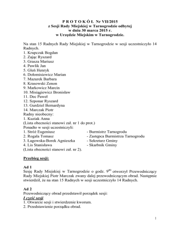 P R O T O K Ó Ł Nr VII/2015 z Sesji Rady Miejskiej w Tarnogrodzie odbytej w dniu 30 marca 2015 r. w Urzędzie Miejskim w Tarnogrodzie. Na stan 15 Radnych Rady Miejskiej w Tarnogrodzie w sesji uczestniczyło 14 Radnych. 1. Krupczak Bogdan 2. Zając Ryszard 3. Grasza Mariusz 4. Pawlik Jan 5. Gleń Henryk 6. Dołomisiewicz Marian 7. Mazurek Barbara 8. Krasowski Zenon 9. Markowicz Marcin 10. Misiągiewicz Bronisław 11. Dec Paweł 12. Szponar Ryszard 13. Gurdziel Bernardyna 14. Marczak Piotr Radny nieobecny: 1. Kuziak Anna (Lista obecności stanowi zał. nr 1 do prot.) Ponadto w sesji uczestniczyli: 1. Stróż Eugeniusz - Burmistrz Tarnogrodu 2. Rogala Tomasz - Zastępca Burmistrza Tarnogrodu 3. Łagowska-Borek Agnieszka - Sekretarz Gminy 4. Lis Stanisława - Skarbnik Gminy (Lista obecności stanowi zał. nr 2). Przebieg sesji: Ad 1 Sesję Rady Miejskiej w Tarnogrodzie o godz. 900 otworzył Przewodniczący Rady Miejskiej Piotr Marczak zwany dalej przewodniczącym obrad. Następnie stwierdził, że na stan 15 Radnych w sesji uczestniczyło 14 Radnych. Ad 2 Przewodniczący obrad przedstawił porządek sesji: I cześć sesji 1. Otwarcie sesji i stwierdzenie kworum. 2. Przedstawienie porządku obrad. 1 3. Przyjęcie protokółu z poprzedniej sesji. 4. Informacja Burmistrza Tarnogrodu o działalności między sesjami. 5. Interpelacje, zapytania i wnioski Radnych. 6. Podjęcie uchwał w sprawie: a) zmiany wieloletniej prognozy finansowej, b) zmiany uchwały budżetowej na 2015 r. c) przystąpienia do projektu "Modernizacja oddziałów przedszkolnych w szkołach podstawowych". 7. Sprawy różne. 8. Odpowiedzi na interpelacje, zapytania i wnioski Radnych. II część sesji wyjazdowe posiedzenie - przegląd inwestycji gminnych oraz lokalnej bazy oświatowej. 9. Zamknięcie sesji. Ad 3 Przewodniczący obrad poinformował, że protokół z ostatniej sesji był wyłożony do wglądu Radnych w Urzędzie Miejskim oraz przed dzisiejszą sesją. Radni nie wnieśli uwag do protokółu z poprzedniej sesji. W wyniku jawnego głosowania, protokół z ostatniej sesji został przyjęty jednogłośnie. Ad 4 Burmistrz - Eugeniusz Stróż poinformował o następujących sprawach: - wprowadzić do budżetu kwotę 340 tys. zł - wniosek do projektu modernizacja oddziałów przedszkolnych w szkołach podstawowych, - odbędzie się przetarg na zejście za synagogą, - odbyły się zebrania na których dokonano wyboru sołtysów oraz przewodniczących zarządu dzielnic, - przeprowadzono rozmowę z firmą biokoncept ustalono, że przez sezon zrzut ścieków będzie monitorowany, o większym zrzucie TZK będzie poinformowany, po przeprowadzonych badaniach i opomiarowaniu ścieków i nieczystości wówczas zadecydują o budowie oczyszczalni lub podoczyszczalni, Ad 5 Interpelacje , zapytania, wnioski Radnych: Radny Paweł Dec - droga Luchów Dolny Brzyska Wola jest uczęszczana przez mieszkańców naszej gminy, jej stan jest fatalny, czy były prowadzone rozmowy w sprawie jej remontu, zainteresować tą sprawą obydwa Starostwa, 2 Radny Marian Dołomisiewicz - droga wojewódzka Kopki-Cieszanów, czy będzie remontowana, Radny Ryszard Zając - dokończenie budowy chodnika w Luchowie Górny oraz jego poprawa, Radna Bernardyna Gurdziel - usunąć krzew (tuja) rosnący na skwerze przy wyjeździe ze szpitala po lewej stronie przy głównej drodze, Radny Henryk Gleń - kiedy będzie rozpoczęty remont remizy OSP w Różańcu Drugim. Ad 6 a Przewodniczący obrad poinformował, że projekt uchwały w sprawie wieloletnie prognozy finansowej Radni otrzymali. Wyjaśnień udzielił Burmistrz Eugeniusz Stróż: - nabór wniosków na kanalizację, zmienić kosztorys, zlecając nowe opracowanie, wprowadzić do budżetu kwotę 40 tys. zł, - wykonać dokumentację na zakrycie rzeki przy ul. Targowej kwota 20 tys. zł, z przeznaczeniem na poszerzenie placu targowego, - dokumentacja oraz wywłaszczenie pod drogę ul. Ogrody zabezpieczyć środki w kwocie 40 tys. zł. Do przedstawionego projektu uchwały Radni nie wnieśli uwag. Przewodniczący obrad poddał pod głosowanie projekt uchwały wraz z proponowanymi wnioskami. Do przedstawionego projektu uchwały Radni nie wnieśli uwag. W wyniku jawnego głosowania uchwała została podjęta jednogłośnie. Za podjęciem uchwały głosowało 14 Radnych, głosów przeciwnych i wstrzymujących się nie było. (Uchwała Nr VII/31/2015 w sprawie wieloletniej prognozy finansowej stanowi zał. nr 3 do prot.) Ad 6 b Przewodniczący poinformował, że projekt uchwały w sprawie uchwały budżetowej na 2015 r. Radni otrzymali. Do przedstawionego projektu uchwały Radni nie wnieśli uwag. Przewodniczący obrad poddał pod głosowanie projekt uchwały wraz z przyjętymi wnioskami na kwotę 100 tys. zł. Kwota powyższa zostanie przyporządkowana do poszczególnych pozycji. 3 Za podjęciem uchwały głosowało 14 Radnych, głosów przeciwnych i wstrzymujących się nie było. (Uchwała Nr VII/32/2015 w sprawie uchwały budżetowej stanowi zał. nr 3 do prot.) Ad 6 c Zastępca Burmistrza - Tomasz Rogala omówił projekt uchwały w sprawie przystąpienia do projektu "Modernizacja oddziałów przedszkolnych w szkołach podstawowych". Do przedstawionego projektu uchwały Radni nie wnieśli uwag. Przewodniczący obrad poddał pod głosowanie projekt uchwały w sprawie przystąpienia do projektu "Modernizacja oddziałów przedszkolnych w szkołach podstawowych". W wyniku jawnego głosowania za podjęciem uchwały głosowało 14 Radnych, głosów przeciwnych i wstrzymujących się od głosowania nie było. (Uchwała Nr VII/33/2015 w sprawie przystąpienia do projektu "Modernizacja oddziałów przedszkolnych w szkołach podstawowych". stanowi zał. nr 4 do prot.) Ad 7 Sprawy różne: Radny Paweł Dec zwrócił uwagę na utworzenie w Gimnazjum oddziału profilowanego. Należy robić wszystko, aby nam ktoś nie zarzucił, że gimnazjum pada, a Rada nic nie zrobiła w tym temacie. Zastępca Burmistrza -Tomasz Rogala w
