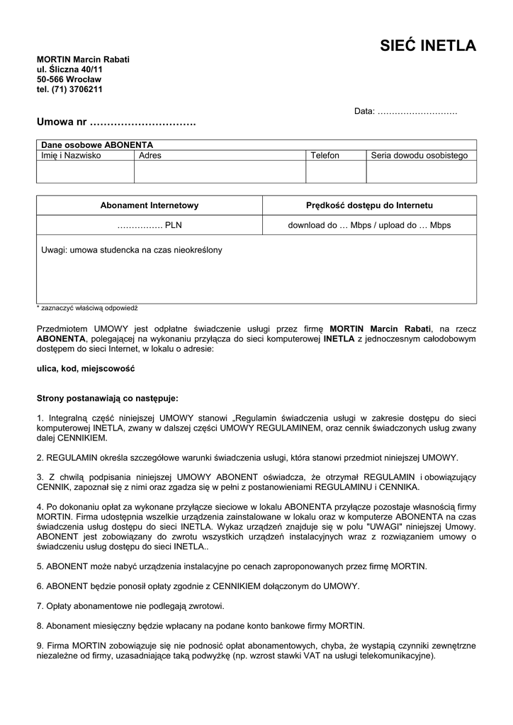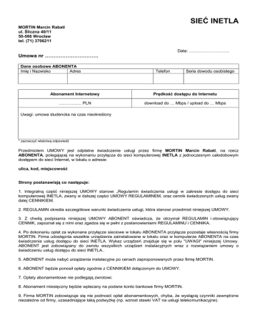 SIEĆ INETLA MORTIN Marcin Rabati ul. Śliczna 40/11 50-566 Wrocław tel. (71) 3706211 Data: ………………………. Umowa nr …………………………. Dane osobowe ABONENTA Imię i Nazwisko Adres Telefon Seria dowodu osobistego Abonament Internetowy Prędkość dostępu do Internetu ……………. PLN download do … Mbps / upload do … Mbps Uwagi: umowa studencka na czas nieokreślony * zaznaczyć właściwą odpowiedź Przedmiotem UMOWY jest odpłatne świadczenie usługi przez firmę MORTIN Marcin Rabati, na rzecz ABONENTA, polegającej na wykonaniu przyłącza do sieci komputerowej INETLA z jednoczesnym całodobowym dostępem do sieci Internet, w lokalu o adresie: ulica, kod, miejscowość Strony postanawiają co następuje: 1. Integralną część niniejszej UMOWY stanowi „Regulamin świadczenia usługi w zakresie dostępu do sieci komputerowej INETLA, zwany w dalszej części UMOWY REGULAMINEM, oraz cennik świadczonych usług zwany dalej CENNIKIEM. 2. REGULAMIN określa szczegółowe warunki świadczenia usługi, która stanowi przedmiot niniejszej UMOWY. 3. Z chwilą podpisania niniejszej UMOWY ABONENT oświadcza, że otrzymał REGULAMIN i obowiązujący CENNIK, zapoznał się z nimi oraz zgadza się w pełni z postanowieniami REGULAMINU i CENNIKA. 4. Po dokonaniu opłat za wykonane przyłącze sieciowe w lokalu ABONENTA przyłącze pozostaje własnością firmy MORTIN. Firma udostępnia wszelkie urządzenia zainstalowane w lokalu oraz w komputerze ABONENTA na czas świadczenia usług dostępu do sieci INETLA. Wykaz urządzeń znajduje się w polu "UWAGI" niniejszej Umowy. ABONENT jest zobowiązany do zwrotu wszystkich urządzeń instalacyjnych wraz z rozwiązaniem umowy o świadczeniu usług dostępu do sieci INETLA.. 5. ABONENT może nabyć urządzenia instalacyjne po cenach zaproponowanych przez firmę MORTIN. 6. ABONENT będzie ponosił opłaty zgodnie z CENNIKIEM dołączonym do UMOWY. 7. Opłaty abonamentowe nie podlegają zwrotowi. 8. Abonament miesięczny będzie wpłacany na podane konto bankowe firmy MORTIN. 9. Firma MORTIN zobowiązuje się nie podnosić opłat abonamentowych, chyba, że wystąpią czynniki zewnętrzne niezależne od firmy, uzasadniające taką podwyżkę (np. wzrost stawki VAT na usługi telekomunikacyjne). 10. Warunki okresu obowiązywania oraz trybu rozwiązywania UMOWY określone są w ZAŁACZNIKU nr 1 do niniejszej UMOWY. 11. Wszystkie zmiany niniejszej UMOWY wymagają formy pisemnej pod rygorem nieważności. 12. W kwestiach nie uregulowanych niniejszą UMOWĄ lub REGULAMINEM zastosowanie mają przepisy kodeksu handlowego i cywilnego. 13. Niniejsza UMOWA została sporządzona w dwóch jednobrzmiących egzemplarzach po jednym dla każdej ze stron. 14. ABONENT niniejszym oświadcza, iż wszelkie dane, które przekazał firmie MORTIN w celu zawarcia niniejszej UMOWY są prawdziwe. 15. ABONENT stosownie do treści art. 23 ust. l i ust. 2 ustawy z dnia 29 sierpnia 1997 r. o ochronie danych osobowych (Dz. U. Nr 133, póz. 883) wyraża zgodę na przetwarzanie swoich danych przez firmę MORTIN w celach związanych z prowadzoną działalnością gospodarczą. 16. ABONENT upoważnia firmę MORTIN do wystawiania faktur bez podpisu ABONENTA. Podpis przedstawiciela firmy MORTIN Czytelny podpis ABONENTA ZAŁĄCZNIK NR 1 DO UMOWY NR …………………………….. PRZYŁACZENIA DO SIECI INETLA 1. ABONENT uzyskuje podłączenie do sieci INETLA na warunkach promocyjnych pod warunkiem posiadania aktualnej legitymacji studenckiej. 2. UMOWA na warunkach promocyjnych zawarta jest na czas nieokreślony. 3. W czasie trwania UMOWY zawartej na warunkach promocyjnych ABONENT nie może korzystać z czasowego odłączenia od sieci. 4. W ramach promocji nowy ABONENT jest zwolniony z opłaty aktywacyjnej i kosztów instalacji przyłącza do sieci INETLA. 5. ABONENT ma prawo rozwiązać UMOWĘ z zachowaniem jednomiesięcznego okresu wypowiedzenia począwszy od ostatniego dnia okresu abonamentowego, w którym skierował pisemne rozwiązanie UMOWY do firmy MORTIN. 6. Firma MORTIN ma prawo do rozwiązania umowy na czas nieokreślony ze skutkiem natychmiastowym przy zaistnieniu uzasadnionych przyczyn rozwiązania. 7. Rozwiązanie UMOWY pod rygorem nieważności musi mieć formę pisemną. Podpis przedstawiciela firmy MORTIN Podpis ABONENTA