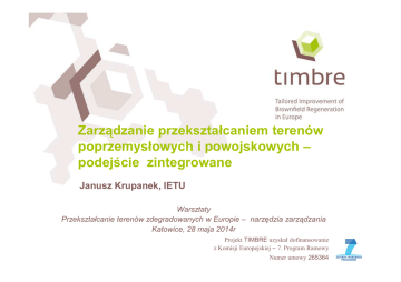 Zarządzanie przekształcaniem terenów poprzemysłowych i powojskowych – podejście zintegrowane Janusz Krupanek, IETU Warsztaty Przekształcanie terenów zdegradowanych w Europie – narzędzia zarządzania Katowice, 28 maja 2014r Projekt TIMBRE uzyskał dofinansowanie z Komisji Europejskiej – 7. Program Ramowy Numer umowy 265364 Projekt timbre - Podstawowe informacje 7. Program Ramowy Okres realizacji 01/2011 – 06/2014 15 Partnerów i Międzynarodowy Komitet Doradczy Budżet: 4.7 mln €, finansowanie KE: 3.4 mln € 2 Projekt timbre - Partnerzy Helmholtz-Zentrum für Umweltforschung – UFZ – Niemcy Eberhard Karls Universität Tübingen - Niemcy Institute of Geonics CR – Republika Czeska Universita ca’ Foscari Venezia - Włochy SOLGEO AG - Szwajcaria Fugro Consult GmbH - Niemcy GeoExperts Dr. Kühne & Partner - Niemcy Zabar Group Holding Sarl - Niemcy Universite de Franche-Comte - Francja Jena-Geos® Ingenieurbüro GmbH - Niemcy Danmarks Tekniske Universitet - Dania GESA Gesellschaft zur Entwicklung und Sanierung von Altstandorten mbH - Niemcy Universitatea Tehnica de Constructii Bucuresti - Rumunia Agentia Nationala Pentru Protectia Mediului - Rumunia Instytut Ekologii Terenów Uprzemysłowionych - Polska 3 Rewitalizacja Megaobiektów Megaobiekty w Europie Ostrożna ocena: • 20 000 Megaobiektów w Europie • Problem będzie istniał przez kolejne 100 lat • Koszty remediacji: > 100 bilionów € 4 Co powoduje, że megaobiekty są megaobiektami ? Złożoność źródeł zanieczyszczeń Złożoność smug zanieczyszczeń Złożoność możliwości remediacji Złożoność funkcji kosztów i wartości Złożoność interesów różnych podmiotów Złożoność ponadregionalnych oddziaływań Jak podjąć dobrą decyzję? Źródła: dr Nicolae Pacurar, Hunedoara, Rumunia 6 Projekt timbre - Cele Ułatwienie dostępu do wiedzy: zebranie, ocena informacji, programów, projektów i dostępnych danych na temat rewitalizacji Megaobiektów Konsolidacja wiedzy o technikach rozpoznania stanu środowiska i technologiach remediacji terenów zdegradowanychin-situ” i “on-site” Usprawnienie podejmowania decyzji w kontekście istniejących struktur decyzyjnych i kultury lokalnej Rozwój narzędzi priorytetyzacji i klasyfikacji terenów zdegradowanych Rozwój narzędzi oceny i planowania przyszłego zagospodarowania terenu zdegradowanego Stworzenie zintegrowanej platformy wymiany informacji na temat rewitalizacji Megaobiektów 7 Wymiar europejski: platforma informacyjna System zbierania, analizy i klasyfikacji dostępnych informacji na temat rewitalizacji terenów zdegradowanych 3) Ocena i ranking zebranych informacji 5) Ekspercka baza danych TIMBRE 1) Ciągła inwentaryzacja informacji na temat przekształcania terenów zdegradowanych w UE 4) Identyfikacja luk w wiedzy Lisa Pizzol, Ph.D. | University Ca' Foscari of Venice | [email protected] 8 Podejście regionalne – czynniki sukcesu i priorytetyzacja Czynniki skutecznej rewitalizacji Dobre przykłady, poglądy i opinie interesariuszy, Czynniki i wskaźniki sukcesu, analiza przestrzenna i klasyfikacja, Strategie i najlepsze praktyki Narzędzie priorytetyzacji Internetowe bazy danych i mapy Interaktywne moduły oceny Petr Klusáček, Ph.D. | Ústav geoniky AV ČR | [email protected] 9 Rewitalizacja mega-obiektu – podejście zintegrowane Rozpoznanie stanu środowiska/dobór technologii remediacji Planowanie przekształceń: koszt, efektywność, zrównoważoność, oddziaływania, rozwój społeczno-gospodarczy Infrastruktura – wykorzystanie/rozbiórka i zagospodarowanie odpadów Udział interesariuszy Kryteria zrównoważoności Proces podejmowania decyzji Rewitalizacja mega-obiektu w wymiarze lokalnym Usprawnienie procesu planowania rewitalizacji mega-obiektu przez integrację przestrzenną analiz i ocen – wykorzystanie narzędzi analizy przestrzennej, Wiedza, umiejętności oraz rozwiązania sprawdzone na konkretnych przykładach Procedury i dobra praktyka zarządzania Procesy uspołecznionego podejmowania decyzji z wykorzystaniem przyjaznych dla użytkownika narzędzi Przykłady prac zrealizowanych w projekcie Timbre na konkretnych terenach n.p Szprotawa 11 Wsparcie procesów uspołecznionego podejmowania decyzji Poznanie istniejących barier kulturowych i niewykorzystanego potencjału doskonalenia racjonalnej rewitalizacji terenów zdegradowanych Poznanie poglądów różnych interesariuszy na temat rewitalizacji terenów zdegradowanych Włączanie interesariuszy do prowadzenia dialogu, aby zrozumieć zmieniające się potrzeby, priorytety i interesy Dr. Alena Bleicher | Helmholtz Centre for Environmental Research – UFZ | [email protected] 12 Rozpoznanie i remediacja terenu Nowe strategie efektywnego rozpoznania terenu, monitoringu stanu zanieczyszczenia środowiska gruntowo wodnego, gospodarki infrastrukturą oraz oceny możliwości jego remediacji: a) badanie zawartości pierwiastków w próbkach rdzeni drewna b) metody sondowania wspierane przez analizę przestrzenną i modelowanie numeryczne Strategie remediacyjne z wykorzystaniem różnych podejść i technik w zależności od występujących uwarunkowań w tym technologii długookresowych: fitoremediacja/ przemywanie gruntu, naturalna regeneracja środowiska Dr. Arno Rein | Danmarks Tekniske Universitet | [email protected] 13 Gospodarowanie istniejącą infrastrukturą Podejście systemowe w ujęciu przestrzennym Dobra praktyka rozpoznania stanu infrastruktury i planowania gospodarowania istniejącą infrastrukturą Środowiskowa i ekonomiczna ocena rozwiązań: Ponowne wykorzystanie Rozbiórka Ekonomicznie uzasadniony i przyjazny dla środowiska recykling oraz zagospodarowanie odpadów Poprawa bezpieczeństwa pracy i ochrona przed emisjami Peter Hagemann | GeoExperts Dr. Kühne & Partner | [email protected] 14 Ocena i optymalizacja planów rewitalizacji Narzędzia programowe wspomagające planowanie i zapewniające informację decydentom i interesariuszom, zap