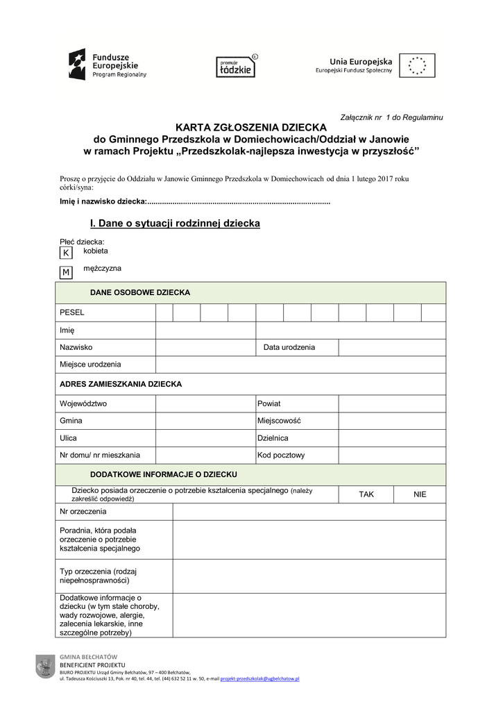 Załącznik nr 1 do Regulaminu KARTA ZGŁOSZENIA DZIECKA do Gminnego Przedszkola w Domiechowicach/Oddział w Janowie w ramach Projektu „Przedszkolak-najlepsza inwestycja w przyszłość” Proszę o przyjęcie do Oddziału w Janowie Gminnego Przedszkola w Domiechowicach od dnia 1 lutego 2017 roku córki/syna: Imię i nazwisko dziecka:....................................................................................... I. Dane o sytuacji rodzinnej dziecka Płeć dziecka: kobieta K mężczyzna M DANE OSOBOWE DZIECKA PESEL Imię Nazwisko Data urodzenia Miejsce urodzenia ADRES ZAMIESZKANIA DZIECKA Województwo Powiat Gmina Miejscowość Ulica Dzielnica Nr domu/ nr mieszkania Kod pocztowy DODATKOWE INFORMACJE O DZIECKU Dziecko posiada orzeczenie o potrzebie kształcenia specjalnego (należy zakreślić odpowiedź) Nr orzeczenia Poradnia, która podała orzeczenie o potrzebie kształcenia specjalnego Typ orzeczenia (rodzaj niepełnosprawności) Dodatkowe informacje o dziecku (w tym stałe choroby, wady rozwojowe, alergie, zalecenia lekarskie, inne szczególne potrzeby) GMINA BEŁCHATÓW BENEFICJENT PROJEKTU BIURO PROJEKTU Urząd Gminy Bełchatów, 97 – 400 Bełchatów, ul. Tadeusza Kościuszki 13, Pok. nr 40, tel. 44, tel. (44) 632 52 11 w. 50, e-mail [email protected] TAK NIE DANE OSOBOWE MATKI/OPIEKUNKI PRAWNEJ Opiekun (właściwe zakreślić) Rodzic Opiekun prawny Imię Nie udzielił informacji Nie żyje Nieznany Rodzic mieszka za granicą Nie żyje Nieznany Rodzic mieszka za granicą Drugie imię Nazwisko ADRES ZAMIESZKANIA MATKI/OPIEKUNKI PRAWNEJ Województwo Powiat Gmina Miejscowość Ulica Dzielnica Nr domu/ nr mieszkania Kod pocztowy DANE KONTAKTOWE MATKI/OPIEKUNKI PRAWNEJ Telefon dom/komórka Adres e-mail* DANE OSOBOWE OJCA/OPIEKUNA PRAWNEGO Opiekun (właściwe zakreślić) Imię Rodzic Opiekun prawny Nie udzieli informacji Drugie imię Nazwisko ADRES ZAMIESZKANIA OJCA/OPIEKUNA PRAWNEGO Województwo Powiat Gmina Miejscowość Ulica Dzielnica Nr domu/ nr mieszkania Kod pocztowy DANE KONTAKTOWE OJCA/OPIEKUNA PRAWNEGO Telefon dom/komórka Adres e-mail* * adres email jest wykorzystywany do przesyłania ogłoszeń i korespondencji z wychowawcą przedszkola, dyrektorem. Nadawca informacji przesłanej pocztą internetową nie gwarantuje jej skutecznego dostarczenia do skrzynki pocztowej adresata. GMINA BEŁCHATÓW BENEFICJENT PROJEKTU BIURO PROJEKTU Urząd Gminy Bełchatów, 97 – 400 Bełchatów, ul. Tadeusza Kościuszki 13, Pok. nr 40, tel. 44, tel. (44) 632 52 11 w. 50, e-mail [email protected] II. Oświadczenia dotyczące spełnienia kryteriów formalnych do udziału w Projekcie Oświadczenie o spełnianiu przez dziecko kryteriów formalnych ...................................................... ..................................... Imię i nazwisko miejscowość, data ...................................................... adres Niniejszym oświadczam, iż moje dziecko ................................................................................... (Imię i nazwisko dziecka) spełnia kryteria formalne do udziału w Projekcie, tzn.: ● zamieszkuje w rozumieniu Kodeksu Cywilnego na terenie gminy Bełchatów w województwie łódzkim; ● jest w wieku zgodnym z art.14 Ustawy o systemie oświaty. Oświadczenie składam w celach rekrutacyjnych do Projektu „Przedszkolak-najlepsza inwestycja w przyszłość”. Prawdziwość wyżej przedstawionych danych potwierdzam własnoręcznym podpisem, świadom odpowiedzialności karnej z art. 233 K.K. ................................................... podpis III. Informacje o spełnieniu kryteriów rekrutacyjnych wynikających z ustawy z dnia 6 grudnia 2013 r. ( Dz. U z 2014 r. poz. 7): (przy spełnionych kryteriach proszę postawić znak „x”) Kryteria główne do pierwszego etapu postępowania rekrutacyjnego 1. Wypełnia rodzic (opiekun) Liczba punktów – wypełnia komisja rekrutacyjna Wielodzietność rodziny kandydata (oznacza to rodzinę wychowującą troje i więcej dzieci) * 2. Niepełnosprawność kandydata** 3. Niepełnosprawność jednego z rodziców kandydata ** 4. Niepełnosprawność obojga rodziców kandydata** 5. Niepełnosprawność rodzeństwa kandydata** 6. Samotne wychowywanie kandydata w rodzinie*** 7. Objęcie kandydata pieczą zastępczą**** * oświadczenie o wielodzietności rodziny kandydata (wg wzoru), **orzeczenie o potrzebie kształcenia specjalnego wydane ze względu na niepełnosprawność, orzeczenie o niepełnosprawności lub o stopniu niepełnosprawności lub orzeczenie równoważne w rozumieniu przepisów ustawy z dnia 27 sierpnia 1997 r. o rehabilitacji zawodowej i społecznej oraz zatrudnianiu osób niepełnosprawnych (Dz. U. z 2011 r. Nr 127, poz. 721, z późn. zm.) ***prawomocny wyrok sądu rodzinnego orzekający rozwód lub separację lub akt zgonu oraz oświadczenie o samotnym wychowywaniu dziecka oraz niewychowywaniu żadnego dziecka wspólnie z jego rodzicem (wg wzoru), GMINA BEŁCHATÓW BENEFICJENT PROJEKTU BIURO PROJEKTU Urząd Gminy Bełchatów, 97 – 400 Bełchatów, ul. Tadeusza Kościuszki 13, Pok. nr 40, tel. 44, tel. (44) 632 52 11 w. 50, e-mail [email protected] ****dokument poświadczający objęcie dziecka pieczą zastępczą zgodnie z ustawą z dnia 9 czerwca 2011 r. o wspieraniu rodziny i systemie pieczy zastępczej (Dz. U. z 2013 r. poz. 135, z 2012 r. poz. 1519 oraz z 2013 r. poz. 154 i 866); IV. Informacje dotyczące spełniania kryteriów rekrutacyjnych wynikających z Regulaminu projektu: 1. Kryterium dochodowe Oświadczenie o średnim dochodzie netto na członka rodziny ...................................................... ..................................... Imię i nazwisko miejscowość, data ...................................................... adres Niniejszym oświadczam, że średni miesięczny dochód netto na jednego członka mojej rodziny wyniósł: □ mniej niż 674,00 zł (3 pkt.) □ równo lub więcej niż 674,00 zł i równo lub mniej niż 1348,00 zł (2 